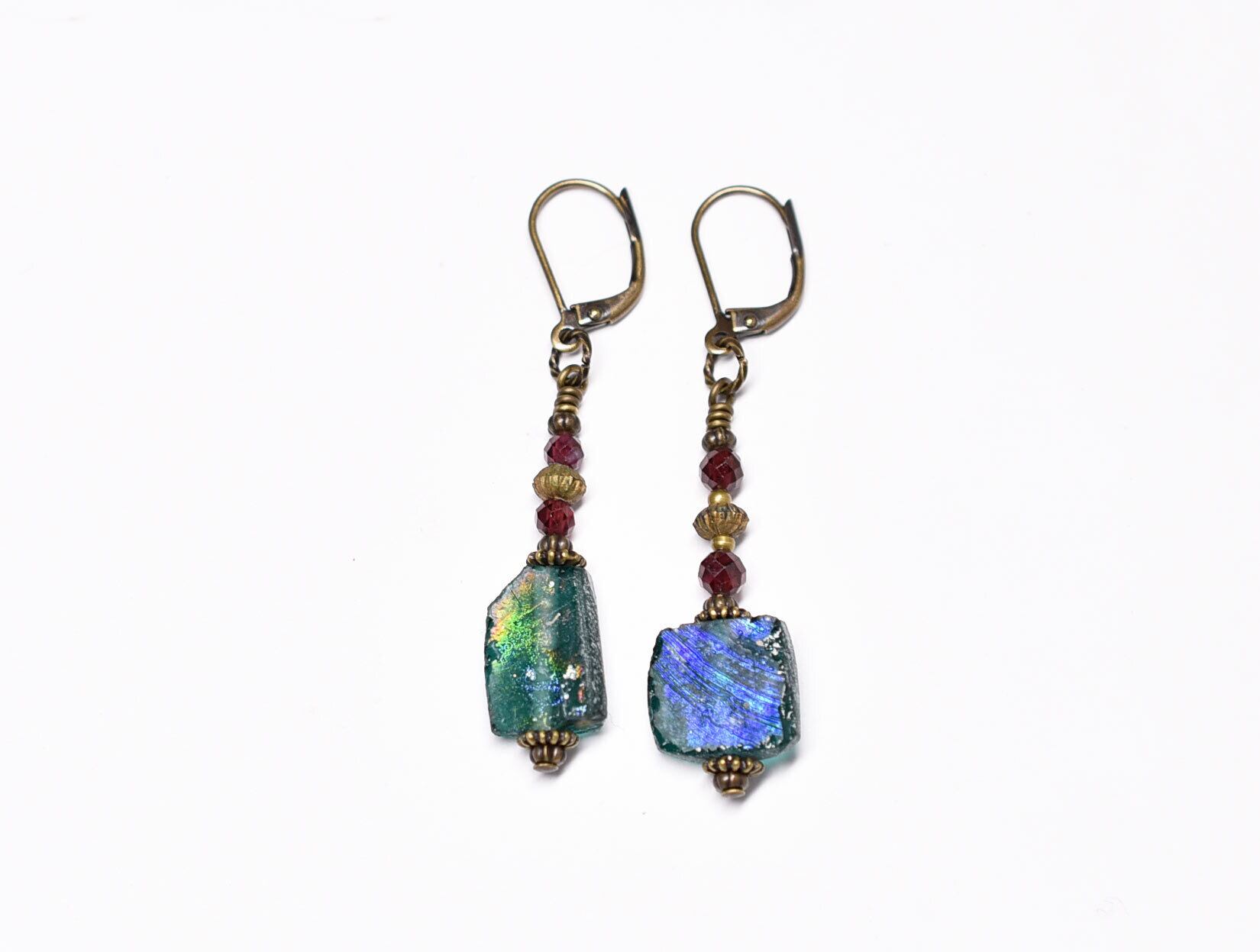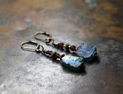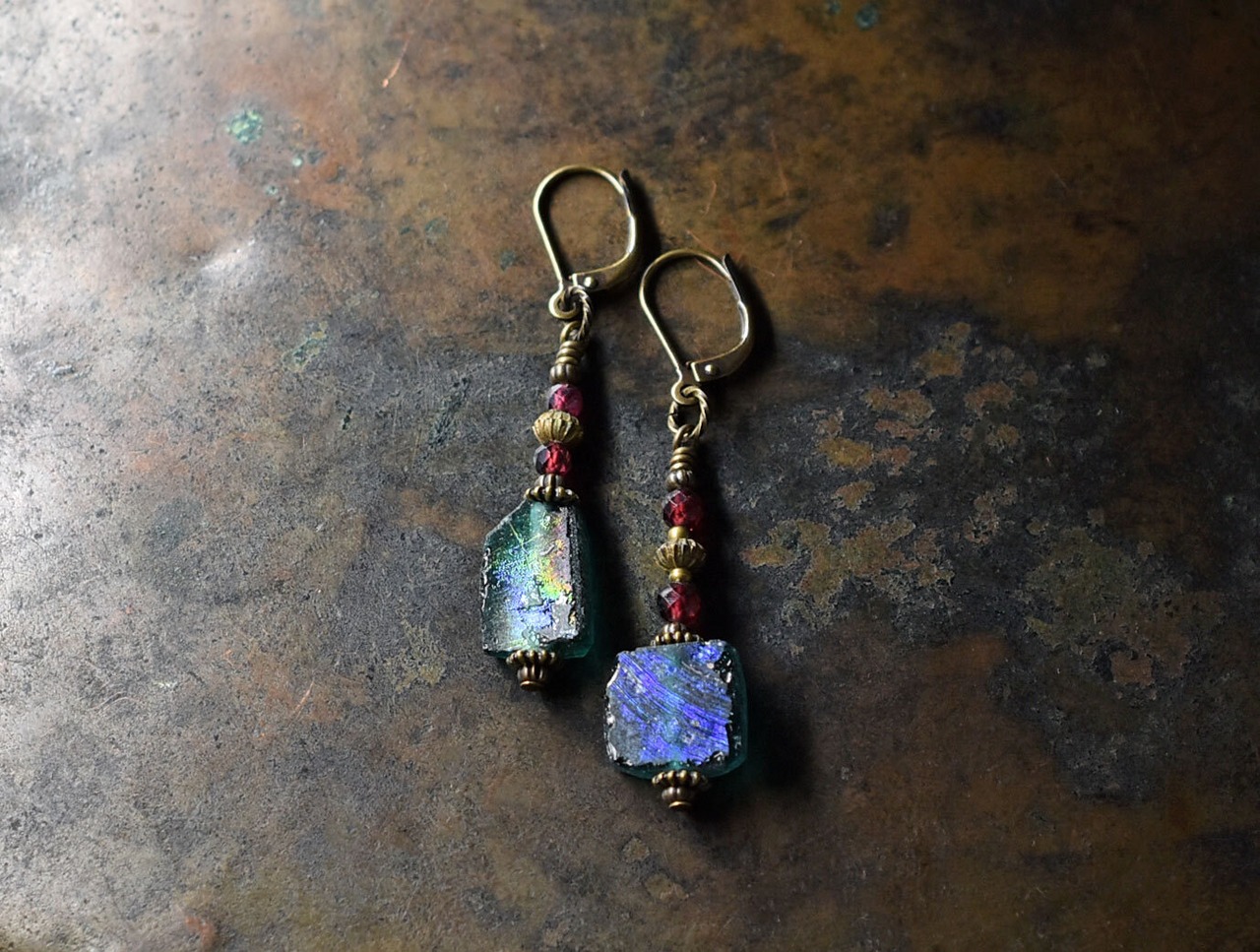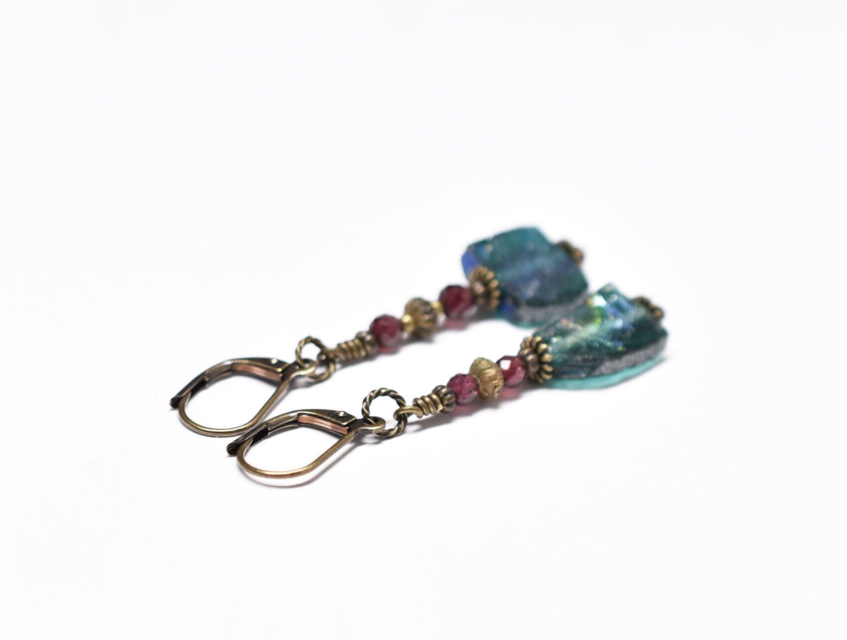 ブルーグリーン銀化ローマングラスとガーネット、ブラスビーズのピアス
