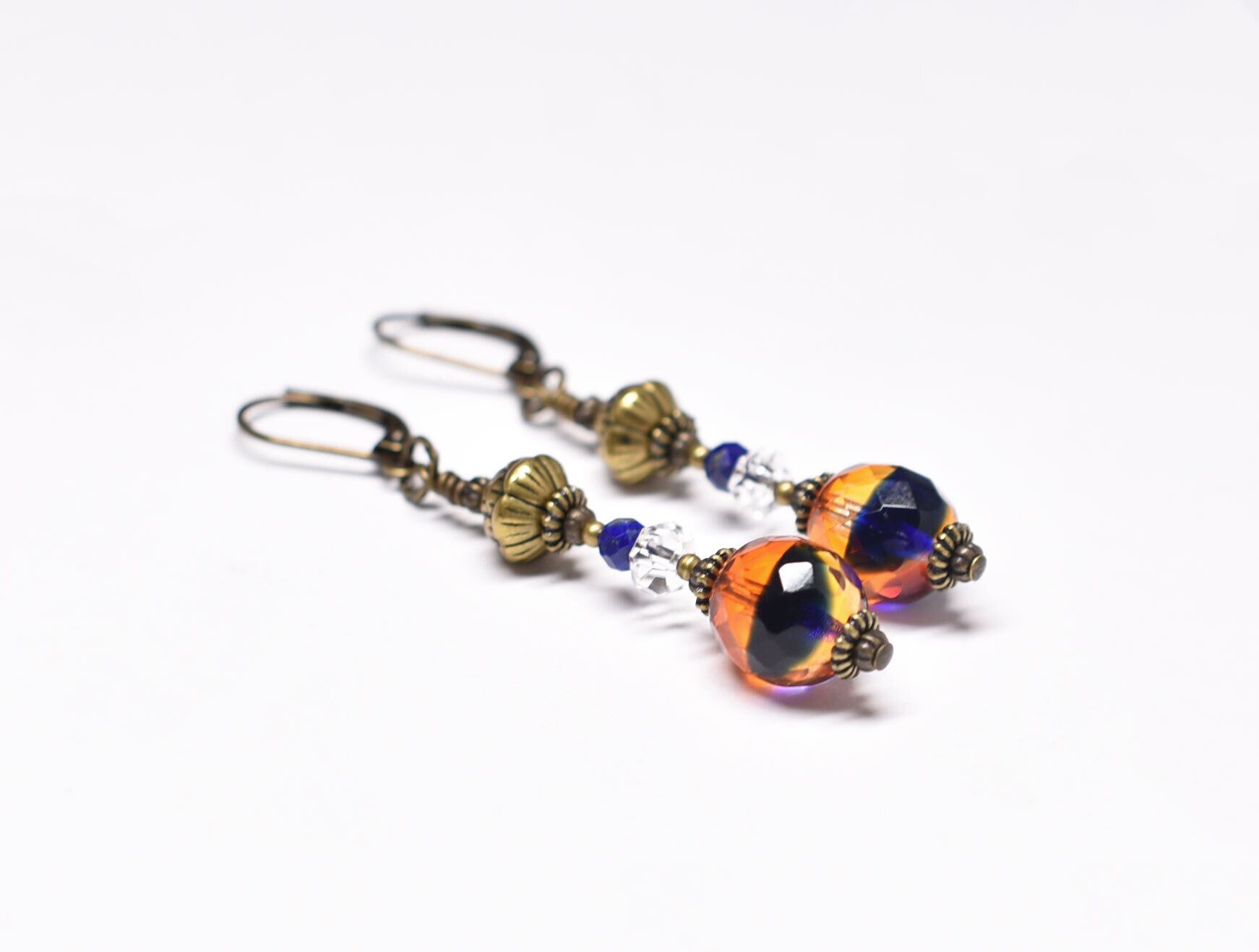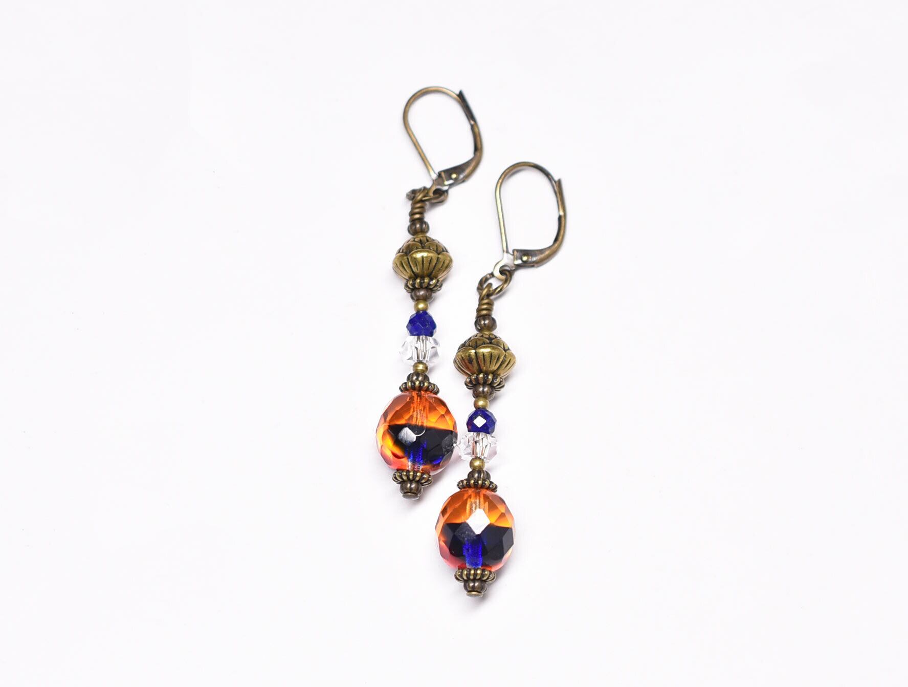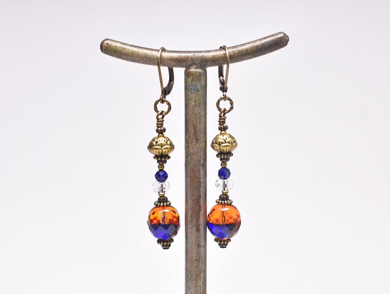 チェコヴィンテージビーズとクォーツ、ラピス、蓮華ブラスを繋いだピアスです。