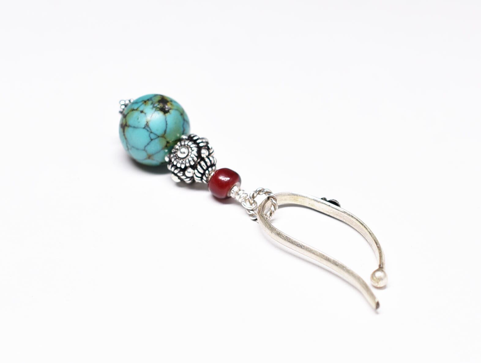 まん丸チベタンターコイズと繊細細工シルバービーズ、血赤色ホワイトハーツを繋いだインドシルバーのイヤーカフです。