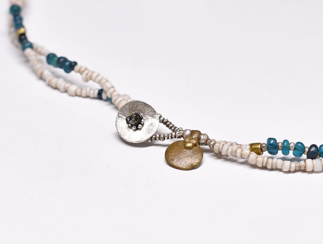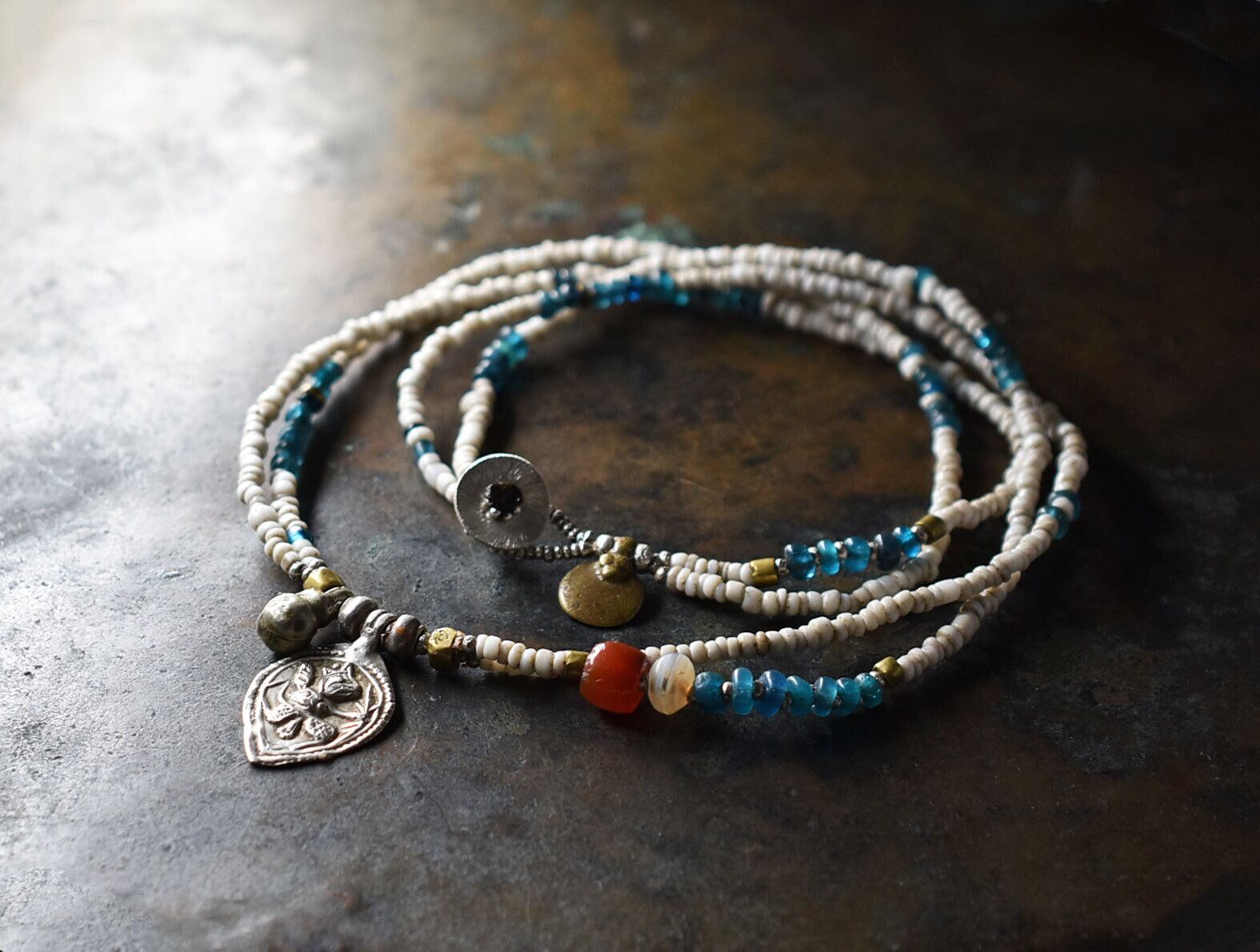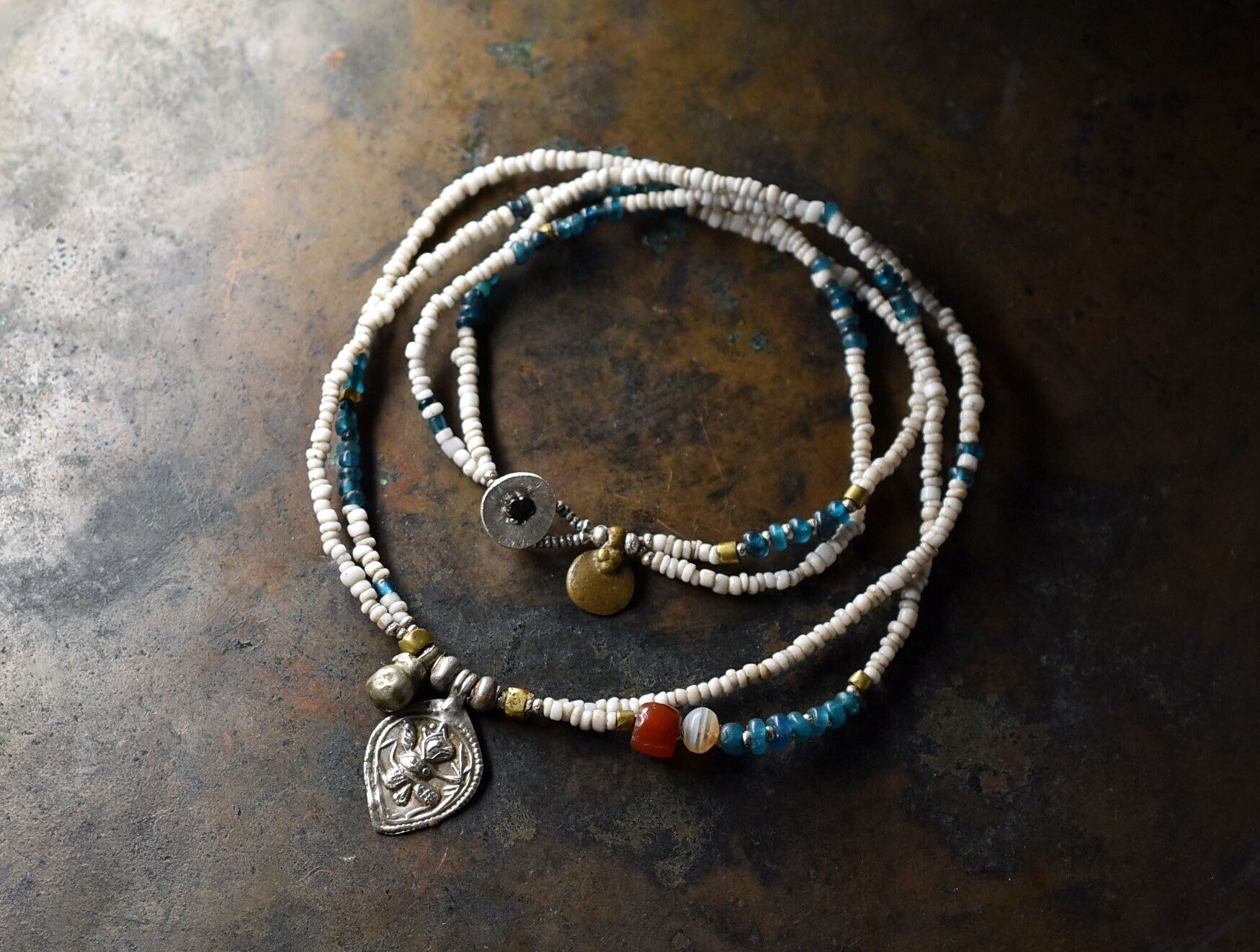 素材oldインドシルバー、oldチンシルバー、ガラス、ミゾーラムカーネリアン、古代瑪瑙、カレンシルバー、oldオリッサブラス、ミックスメタル、ロウビキ紐