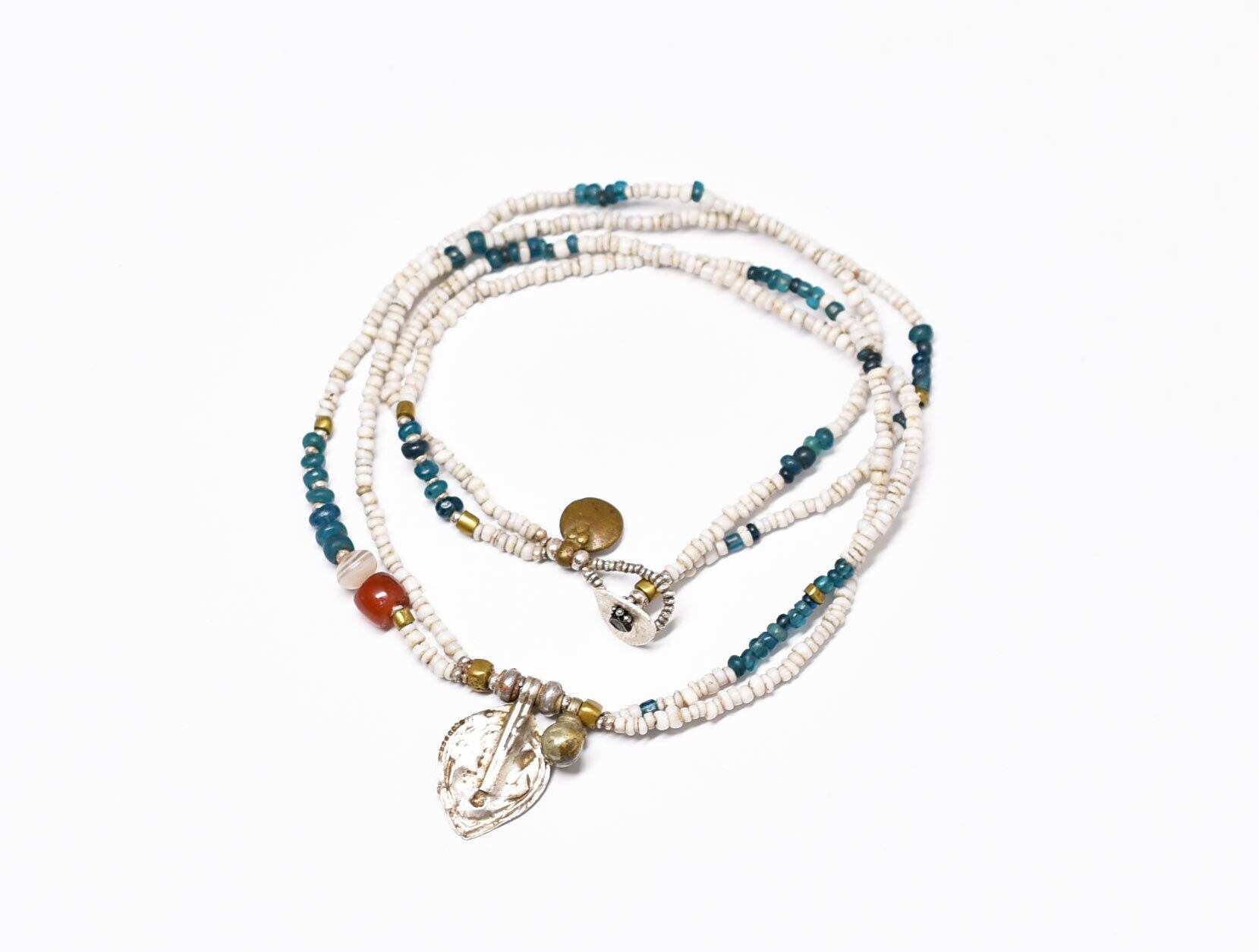 oldインドシルバートップ、oldチンシルバー、ミゾーラムカーネリアン、古代瑪瑙、ホワイト&エメラルドブルーの2連ネックレス