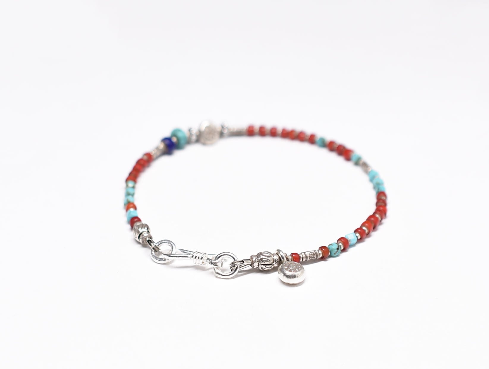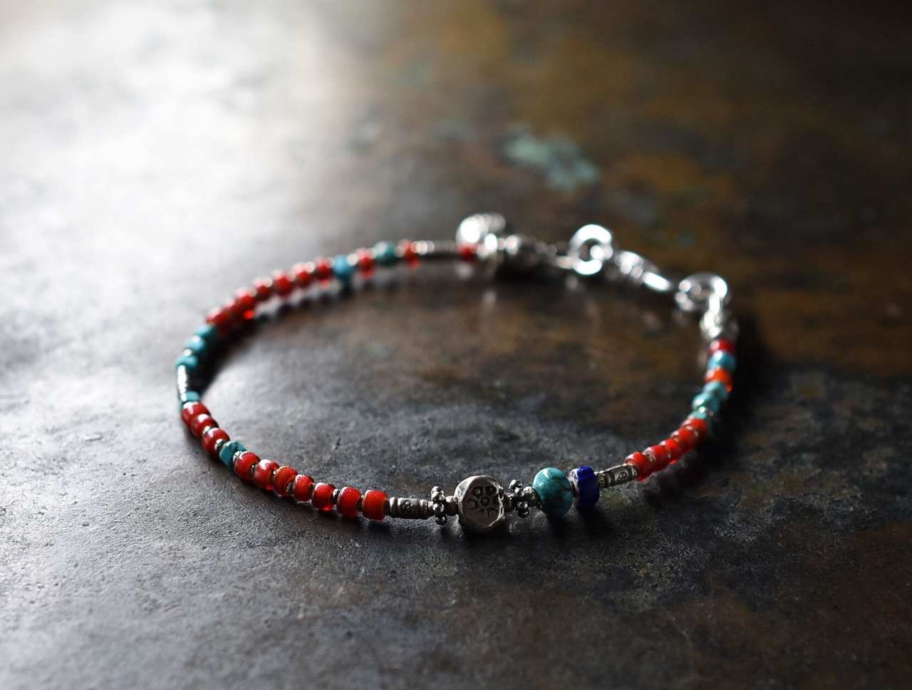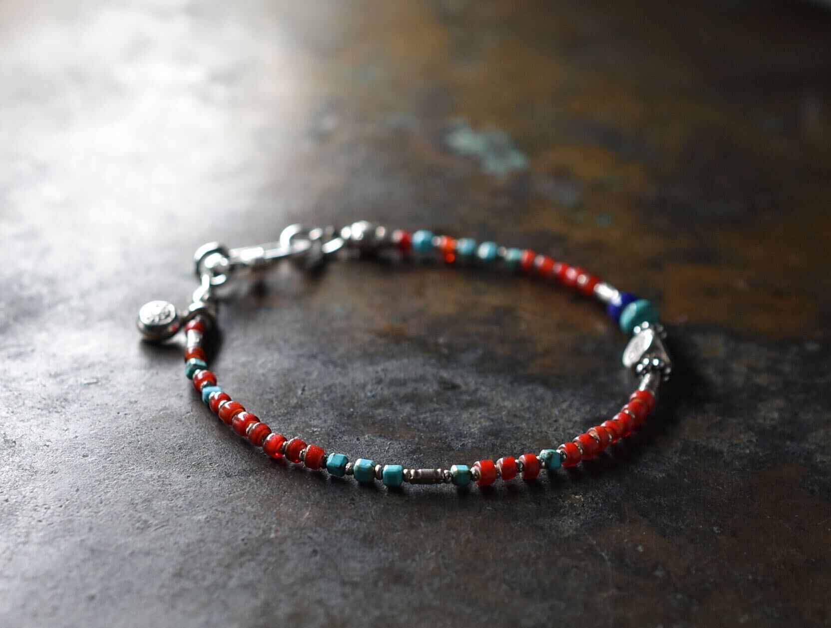カレンシルバーとブルーシェブロン、ターコイズと飴色ホワイトハーツを繋いだ華奢なブレスです。