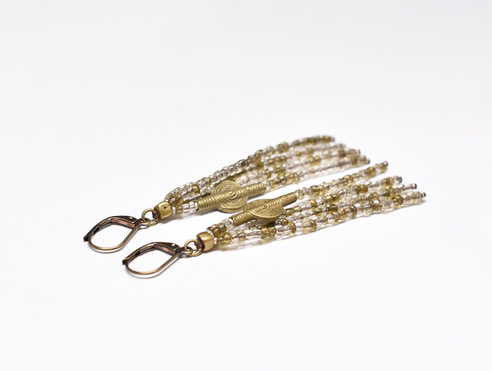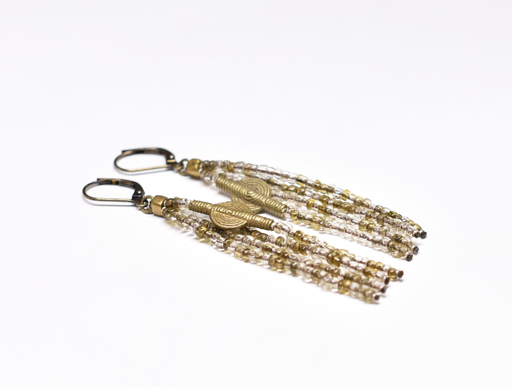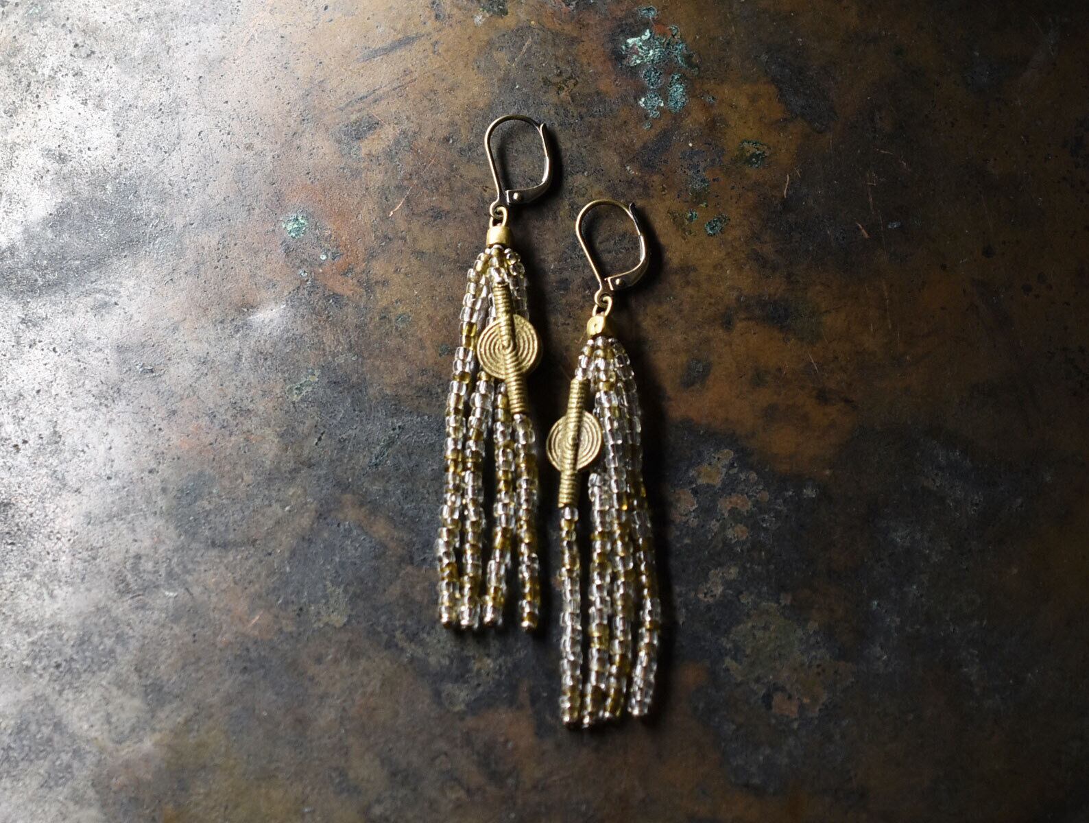 アフリカンブラスとクリア&琥珀色シードビーズを繋いだ4連のピアスです。