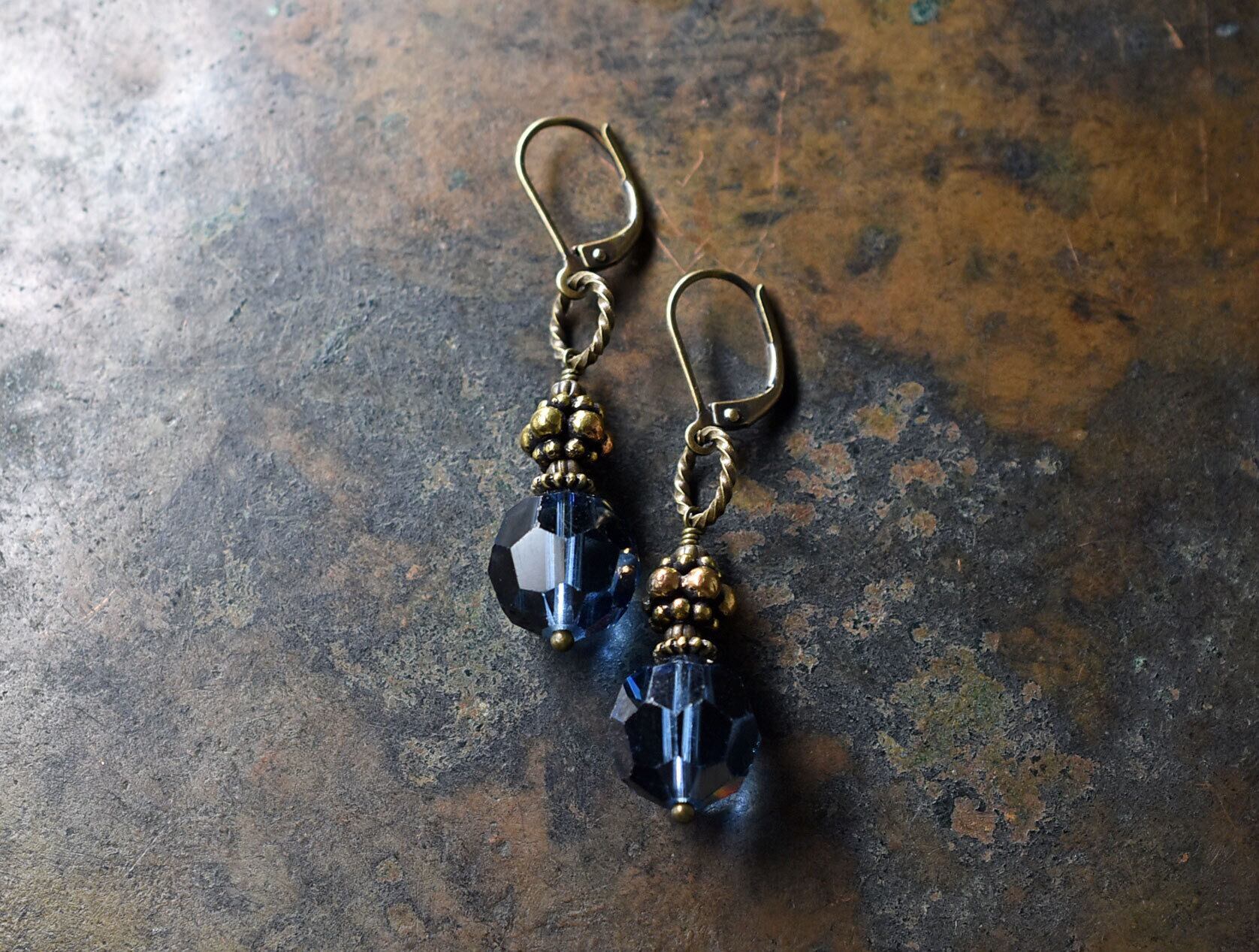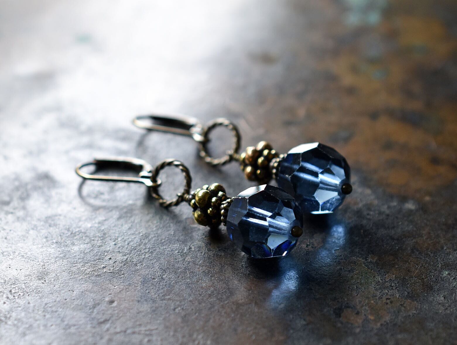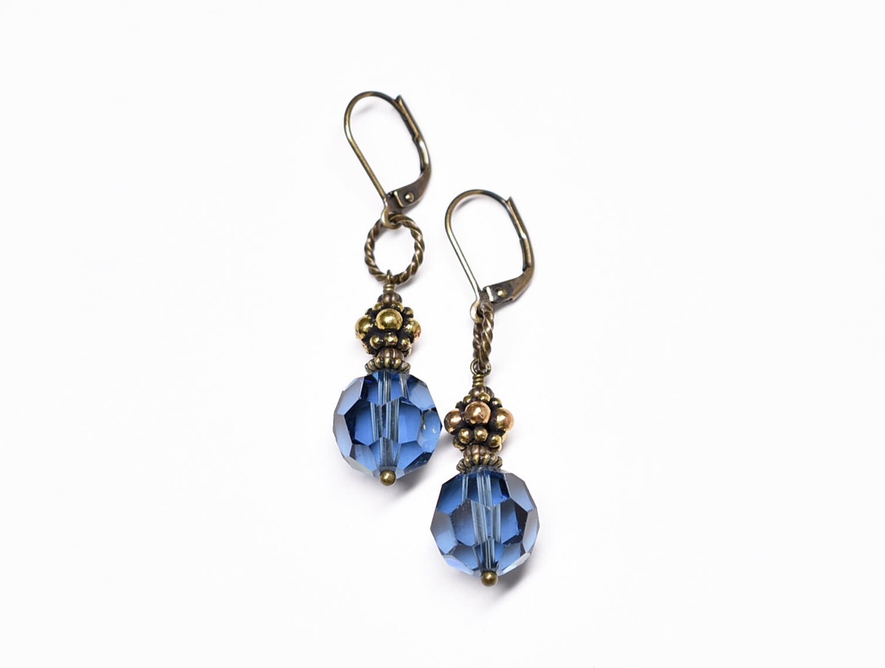 アイアンブルーチェコヴィンテージビーズとぷっくりブラスビーズを繋いだやや大ぶりなピアスです。