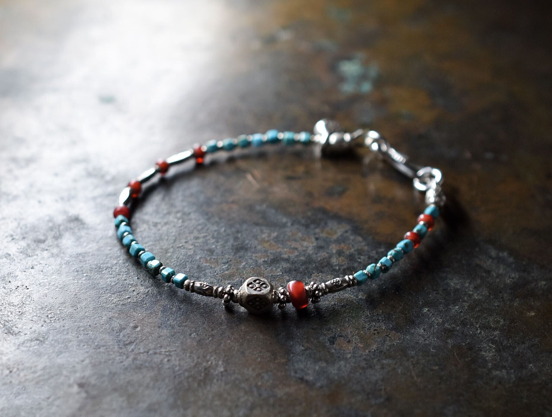 スクエアターコイズとカレンシルバー、金赤ホワイトハーツを繋いだ華奢なブレス です。