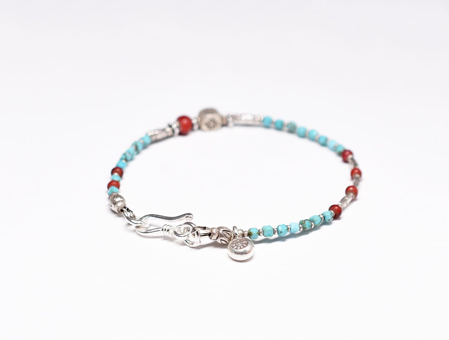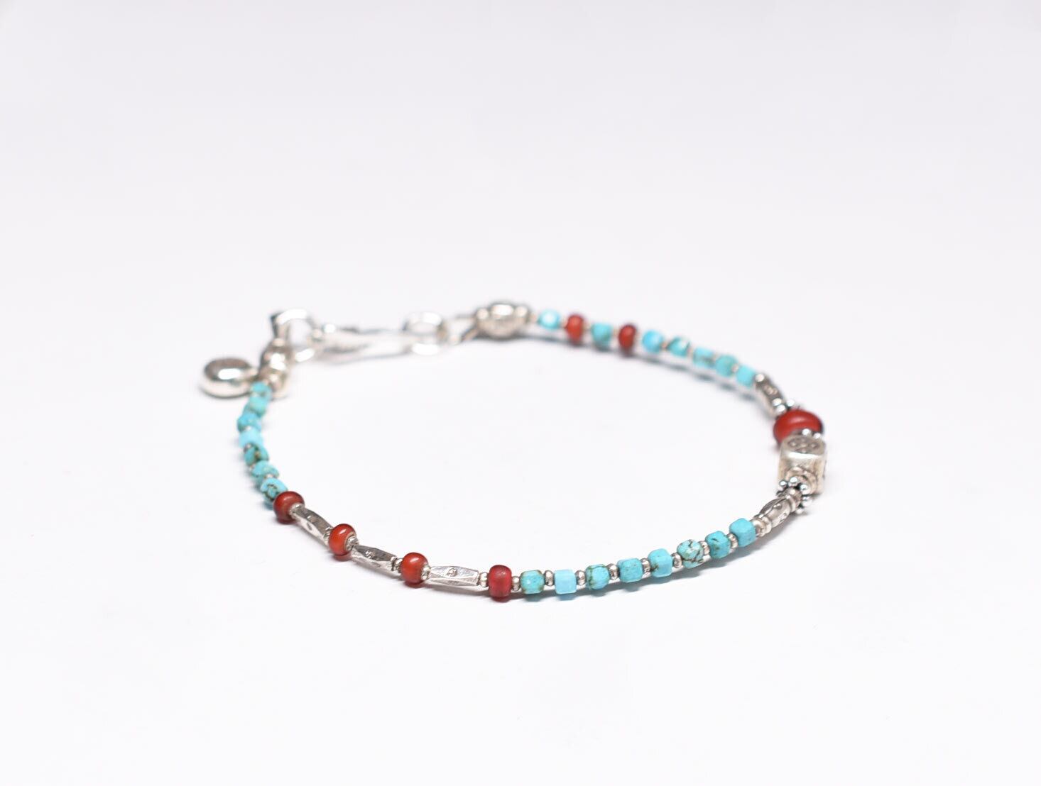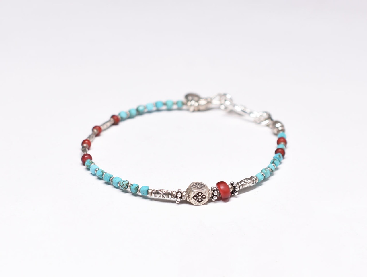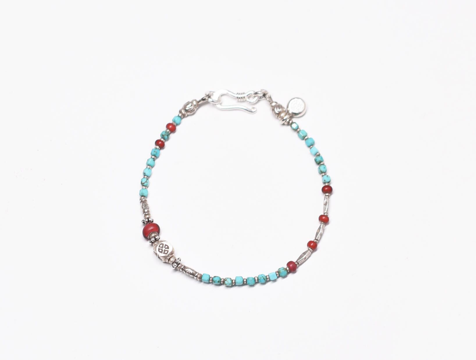 スクエアターコイズとカレンシルバー、金赤ホワイトハーツの華奢なブレス