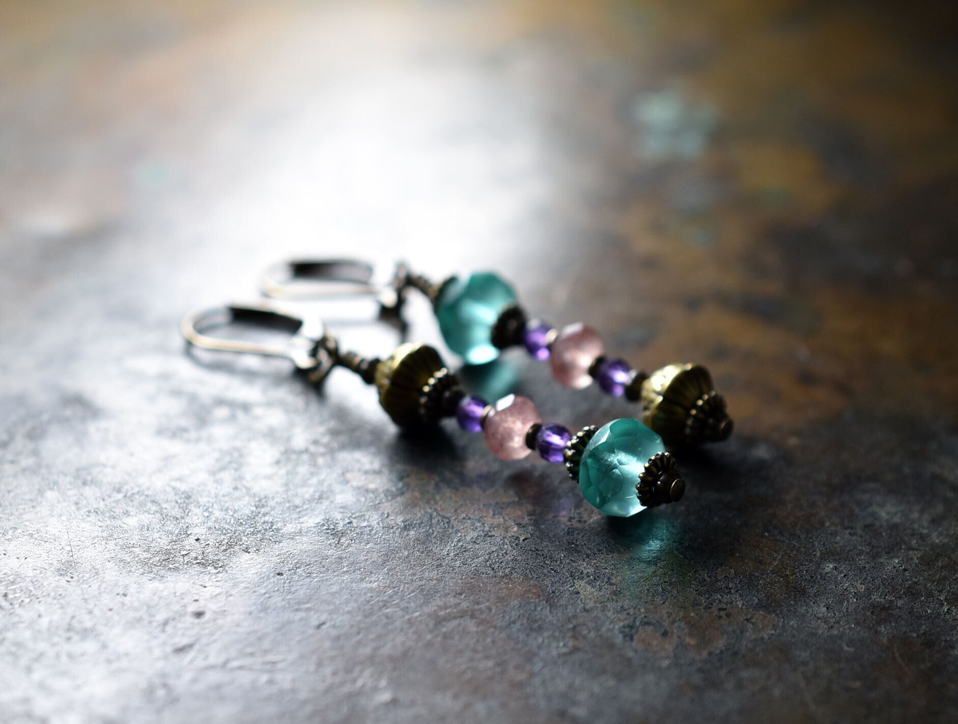 チェコビーズとアメジスト、ストロベリークォーツ、蓮華ブラスのアンシメトリーなピアスです。