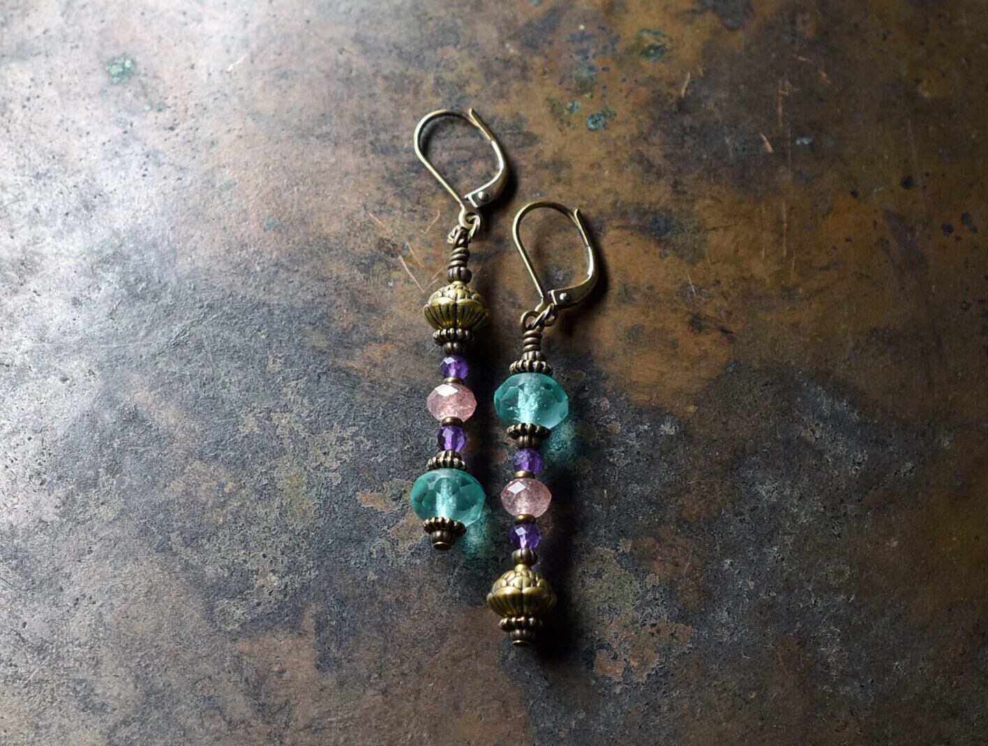 チェコビーズとアメジスト、ストロベリークォーツ、蓮華ブラスのアンシメトリーピアス(淡)