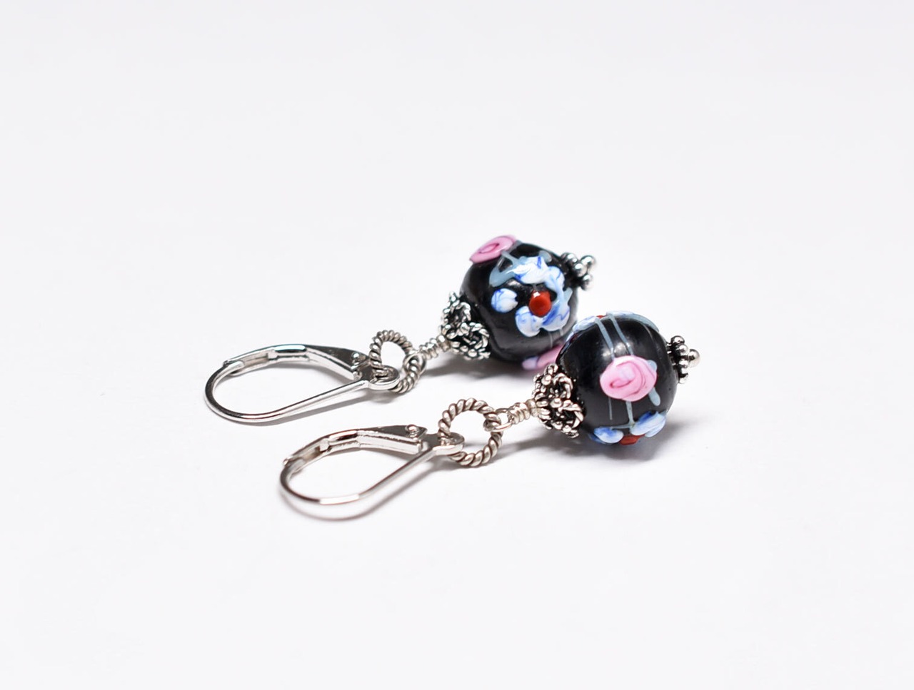 漆黒ヴェネチアアンティークビーズ勿忘草と薔薇の一粒ピアス