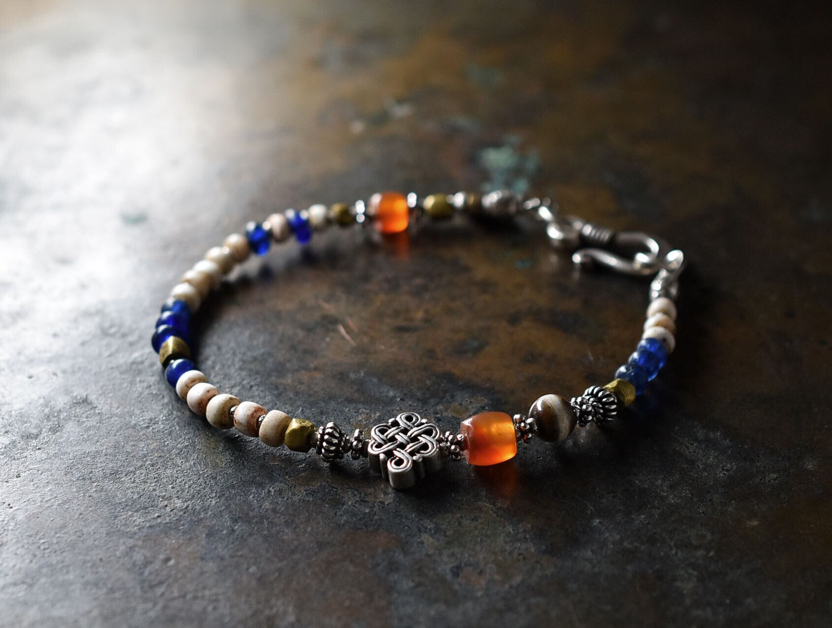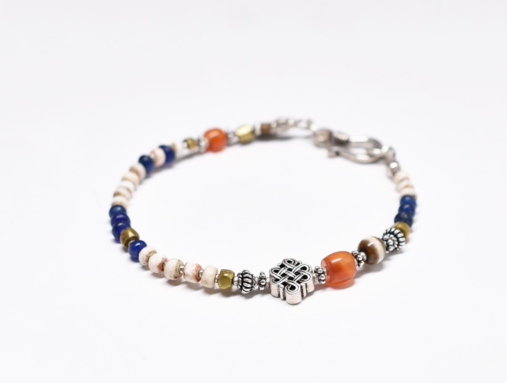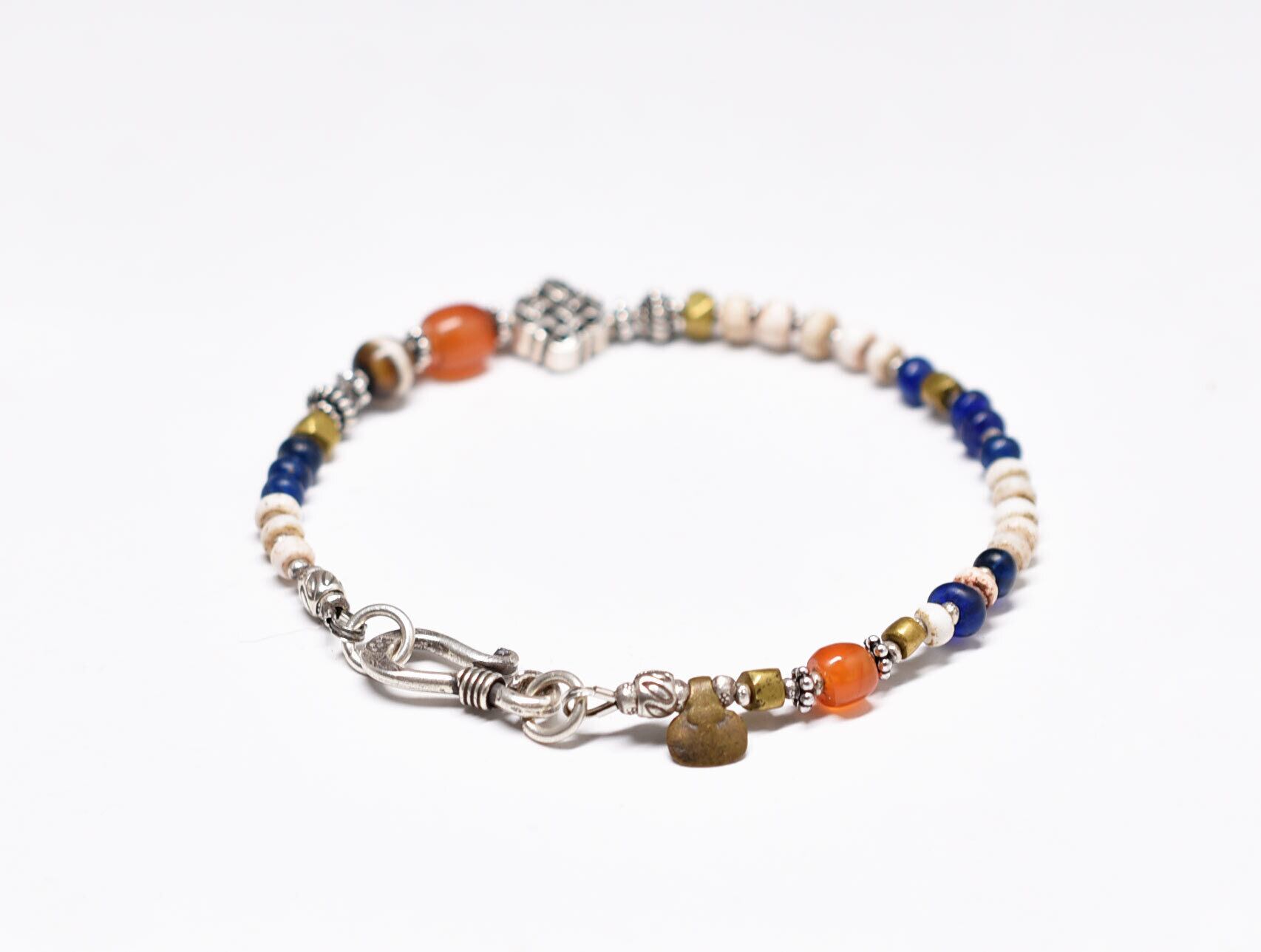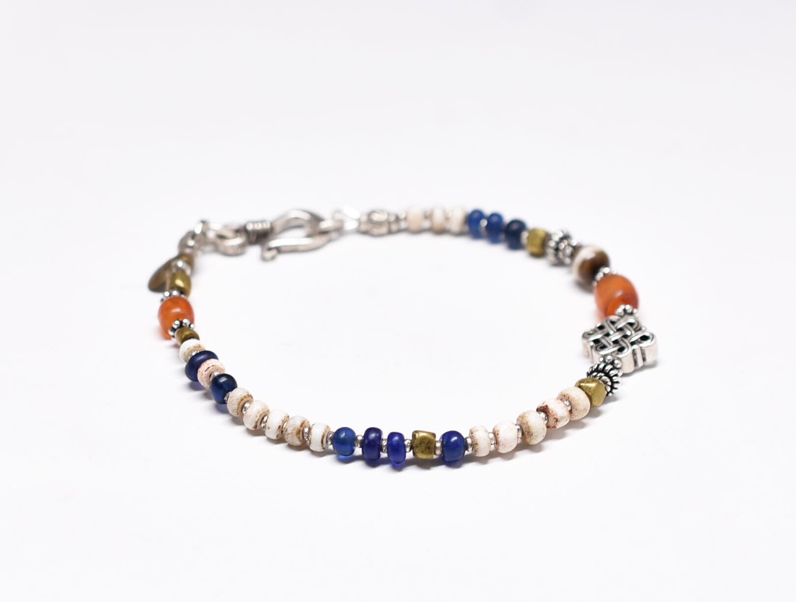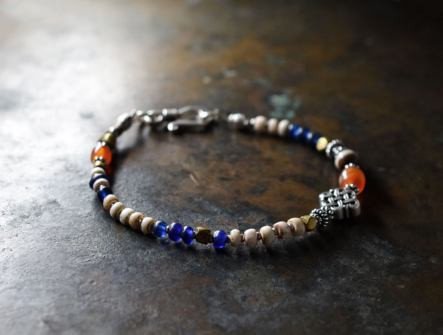 エンドレスノット、ミゾーラムカーネリアン、古代瑪瑙、oldオリッサブラス、ホワイト&ブルーアンティークビーズのブレス