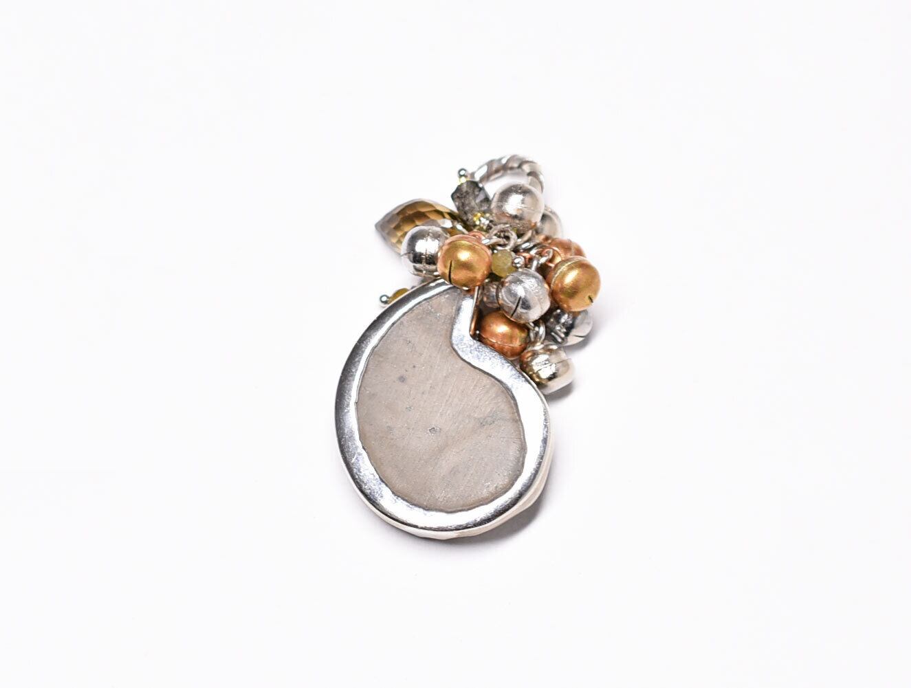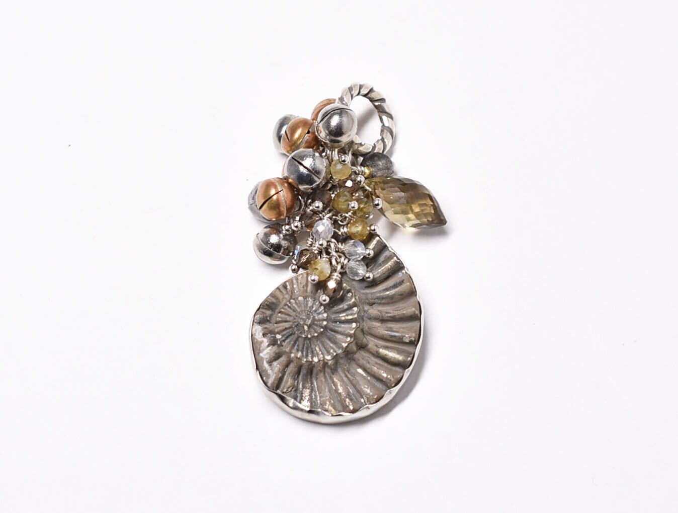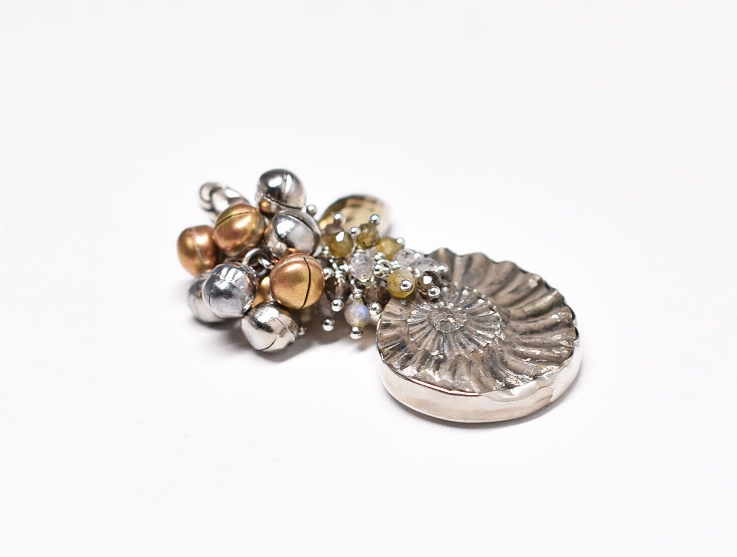 シルバー枠アンモナイトパイライト、たわわな鈴とラブラドライト&スモーキークォーツ、ブラックルチル、雫スモーキークォーツのペンダントトップ