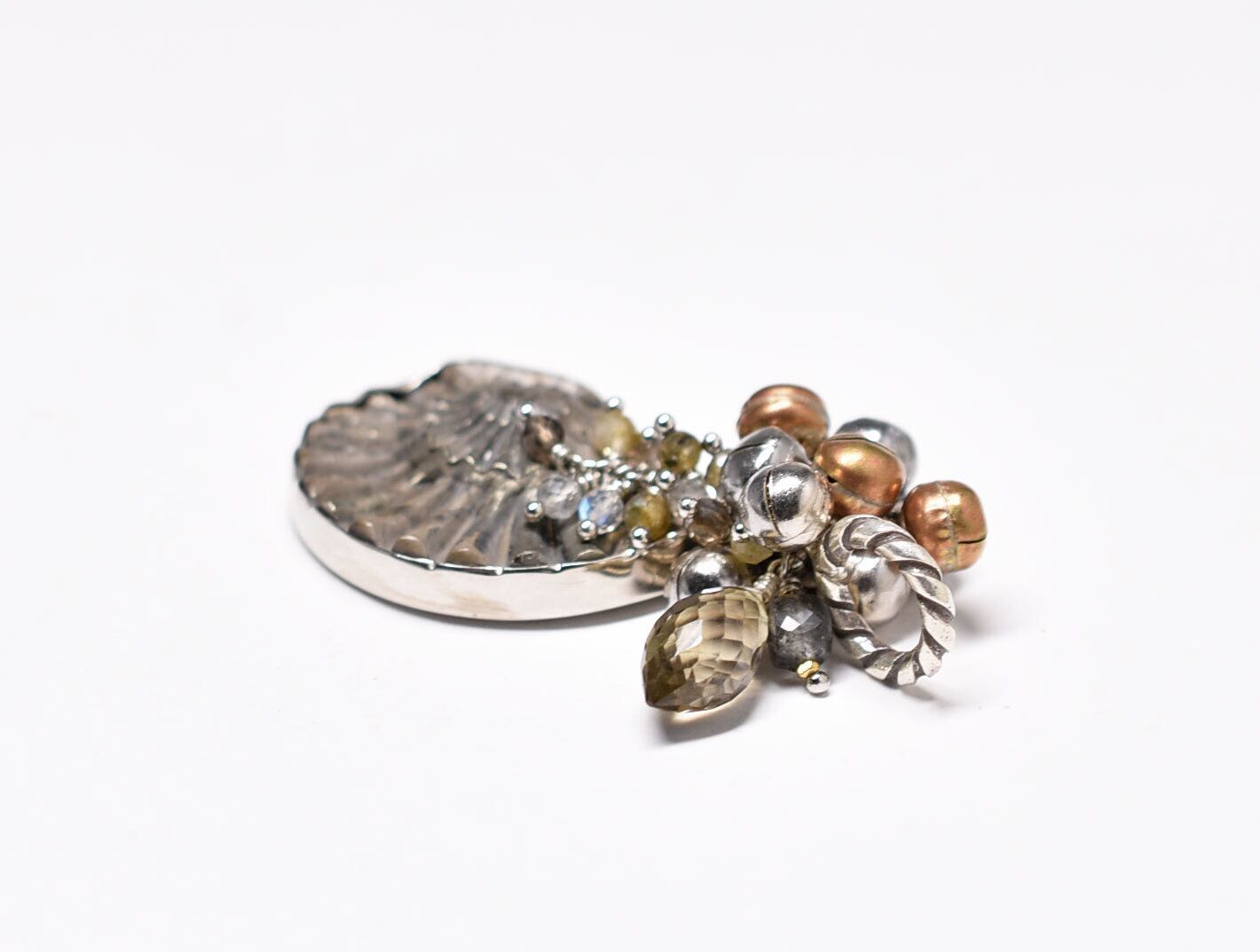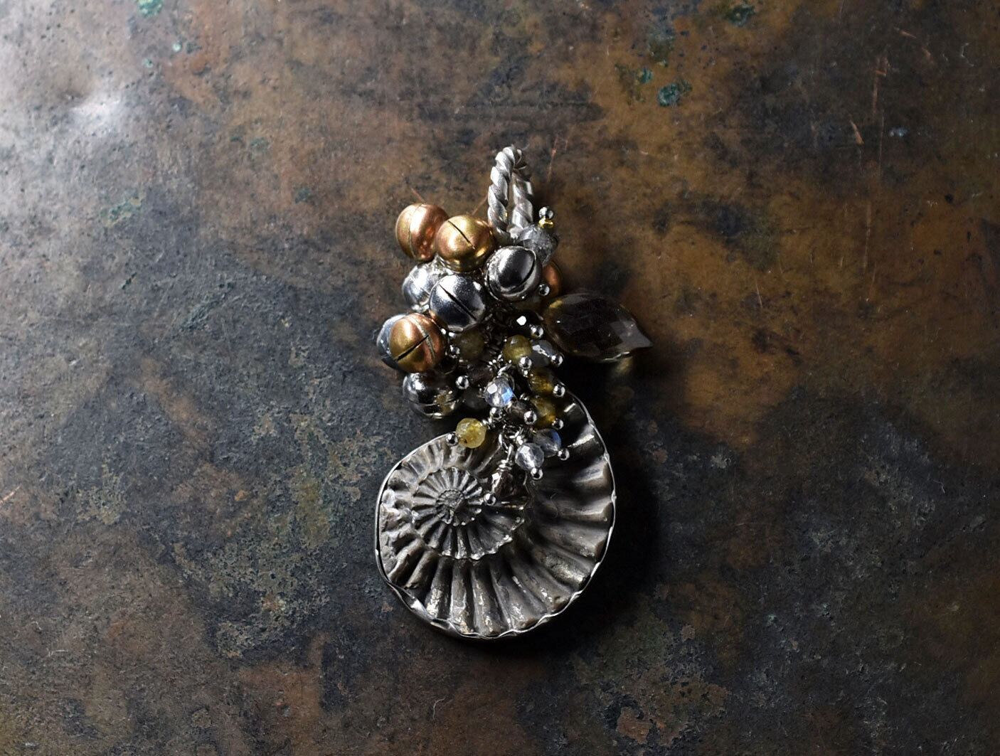 素材:シルバー枠アンモナイトパイライト、カレンシルバー、ニッケル、ラブラドライト、スモーキークォーツ、ブラックルチル
