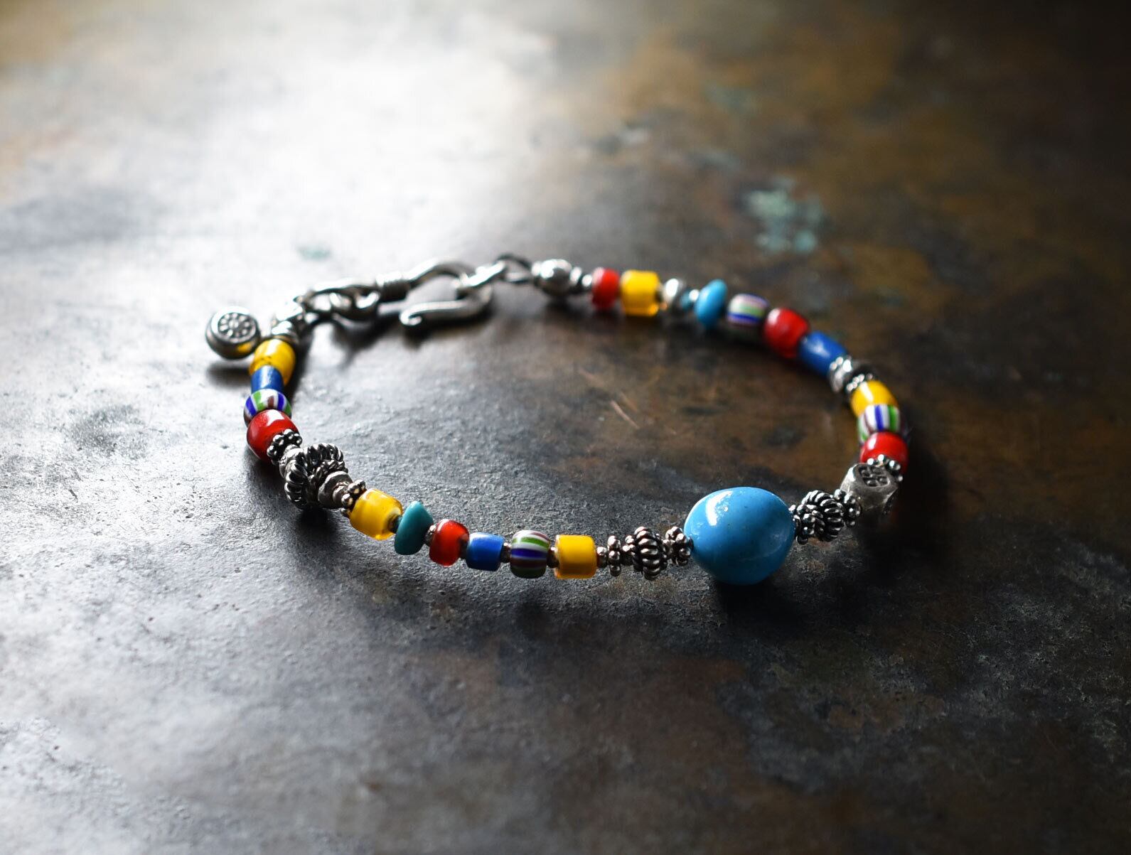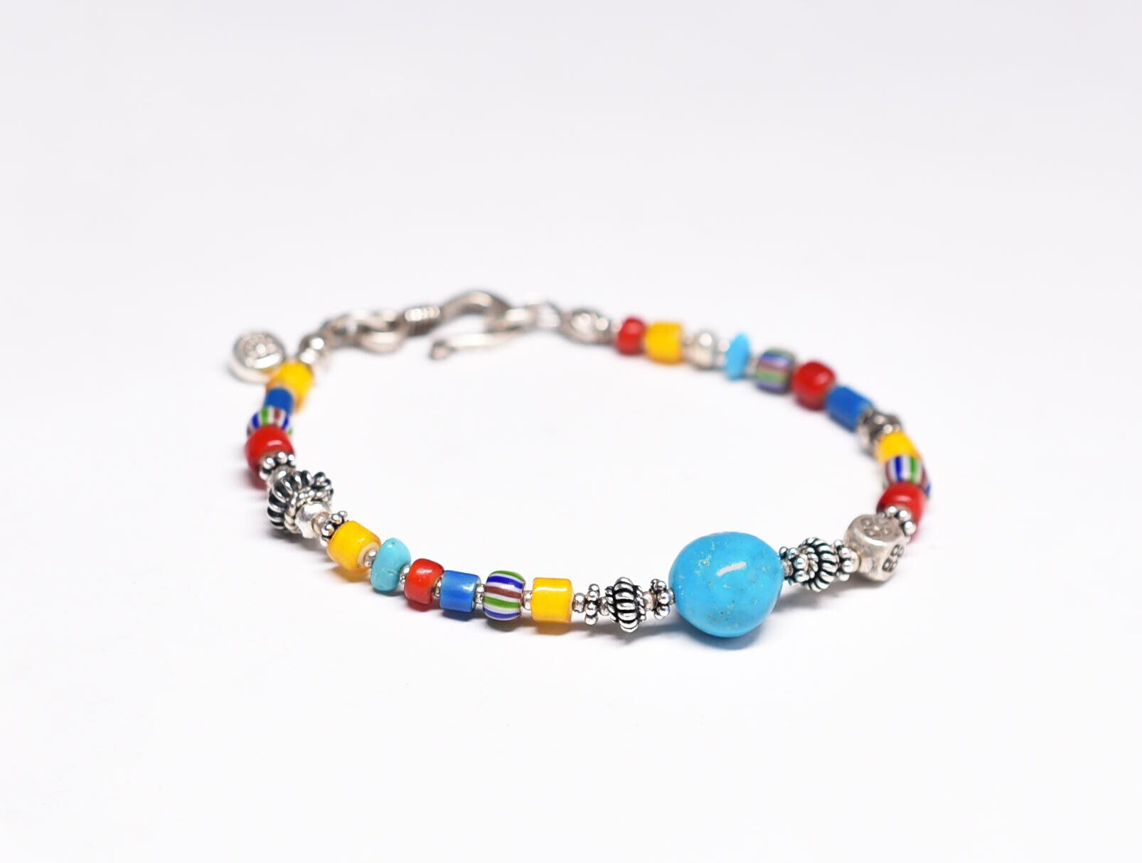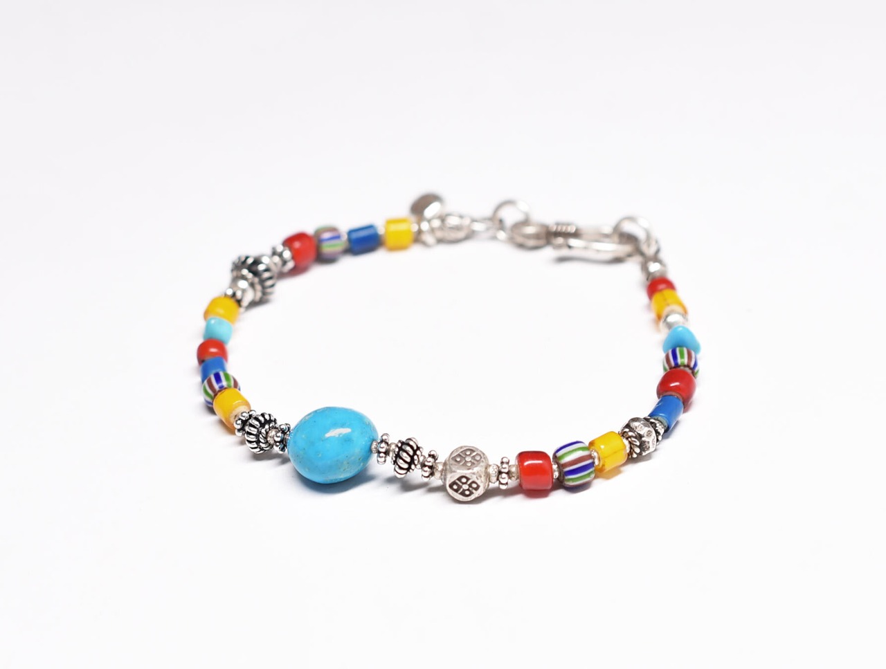 カラフルホワイトハーツとターコイズ、マルチカラーシェブロンビーズ、カレンシルバーのブレスです。