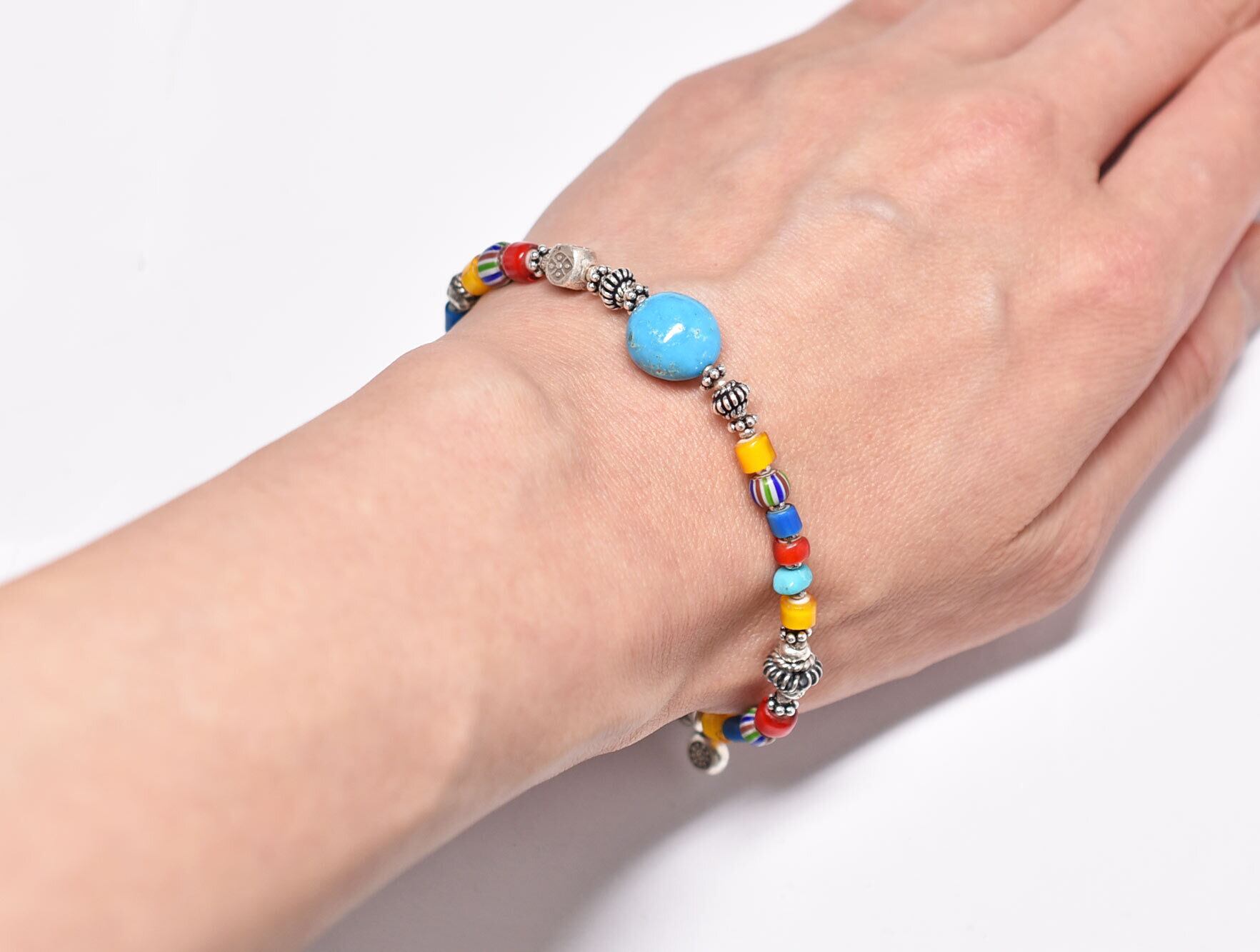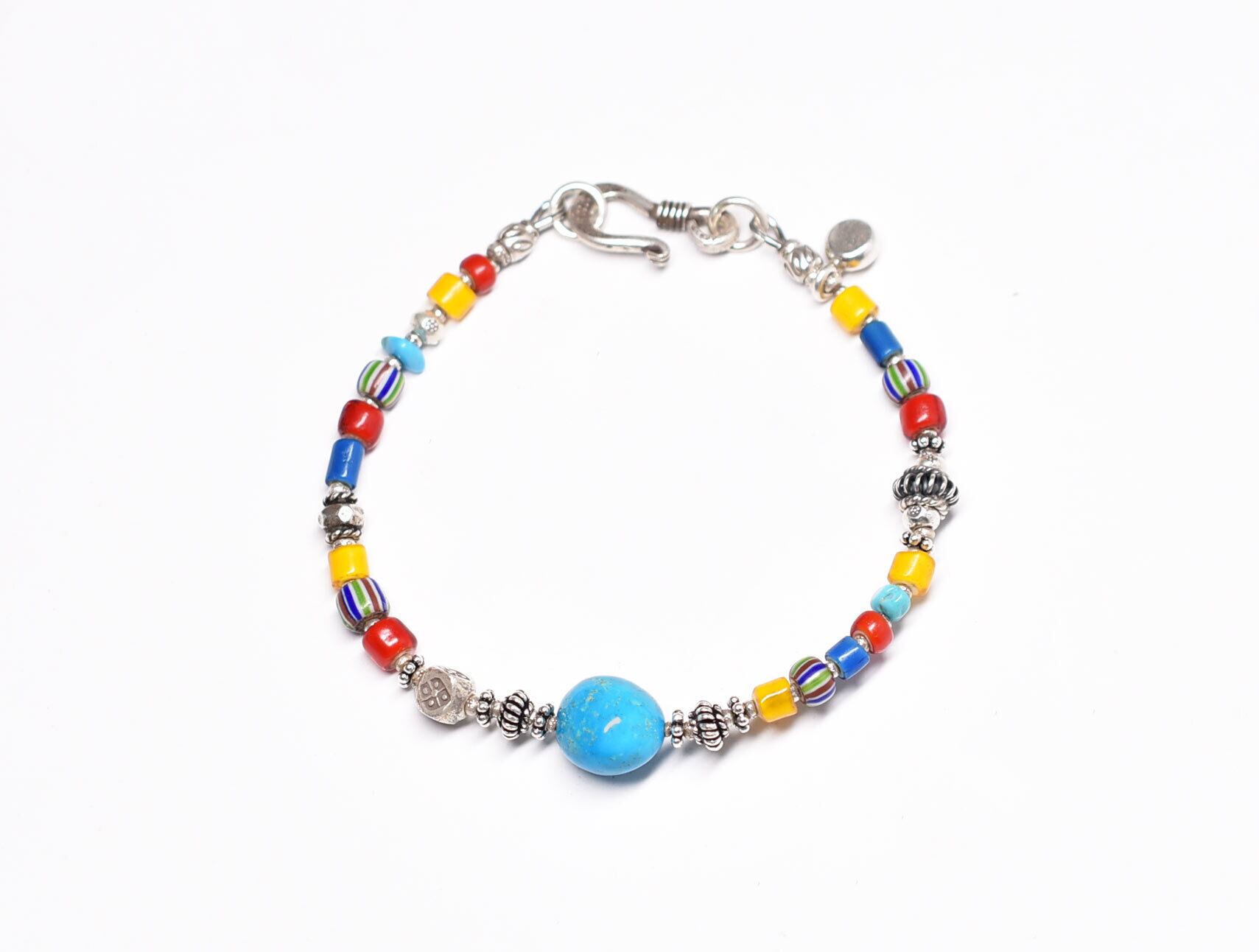 キングマンターコイズ、カラフルホワイトハーツとマルチカラーシェブロンビーズ、ターコイズ、カレンシルバーのブレス