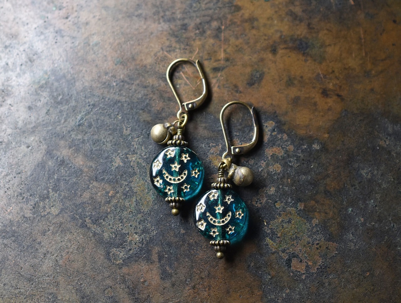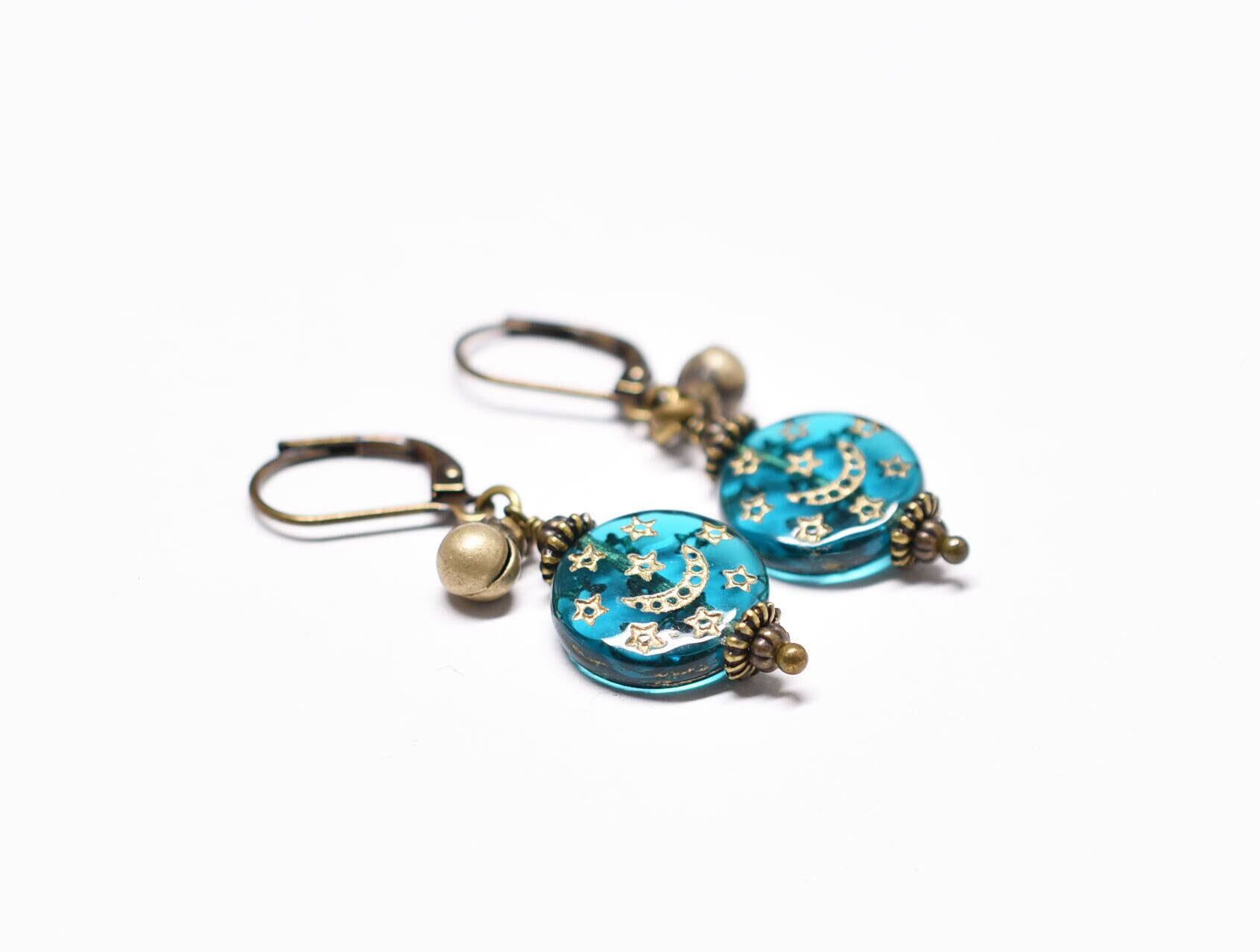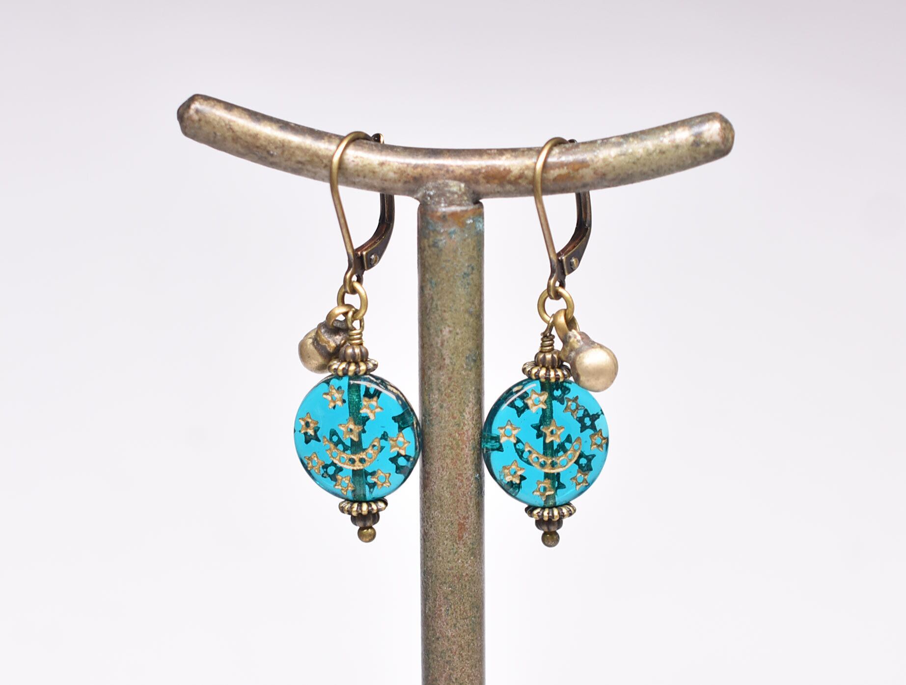 月と星の模様が施された聖者のビーズと、小さな鈴を繋いだピアスです。