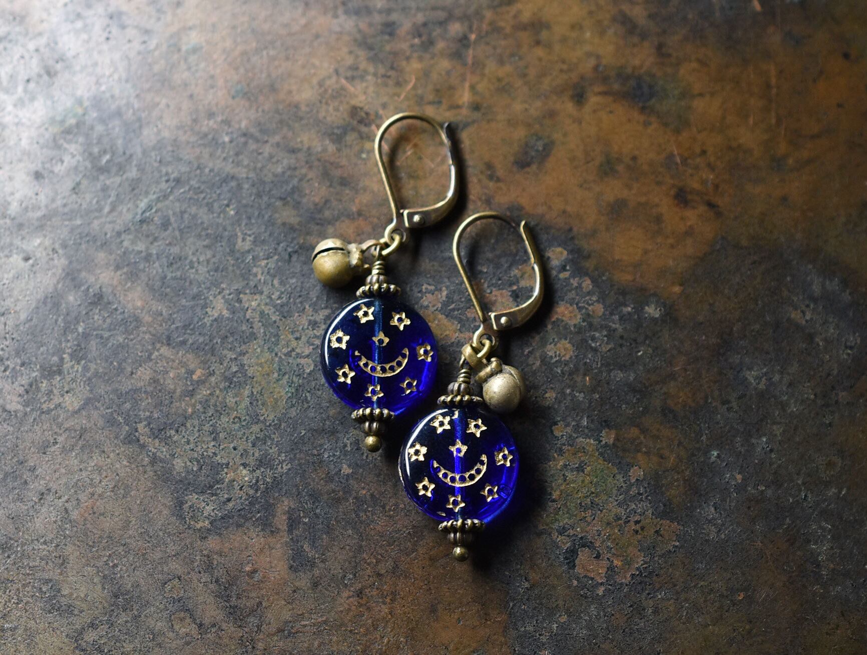 月と星の模様が施された聖者のビーズと、小さな鈴を繋いだピアスです。