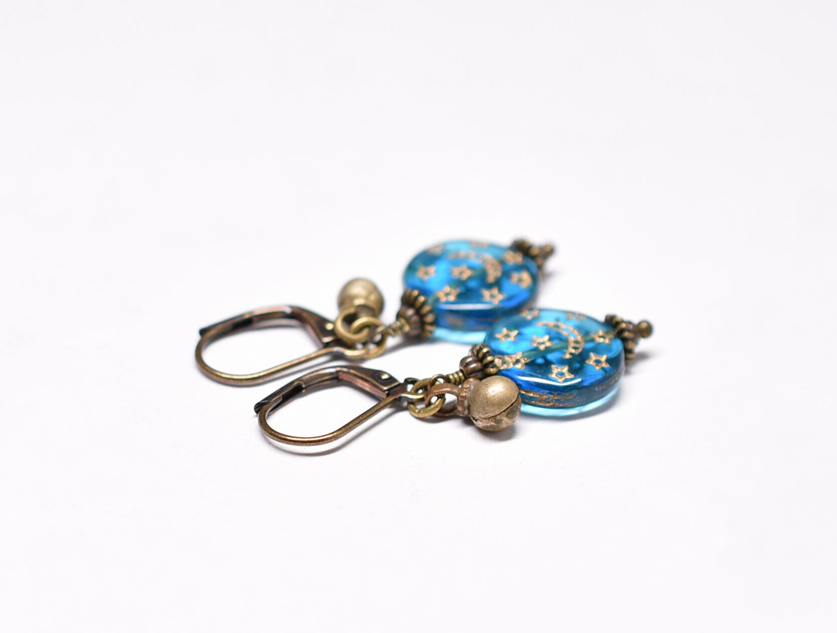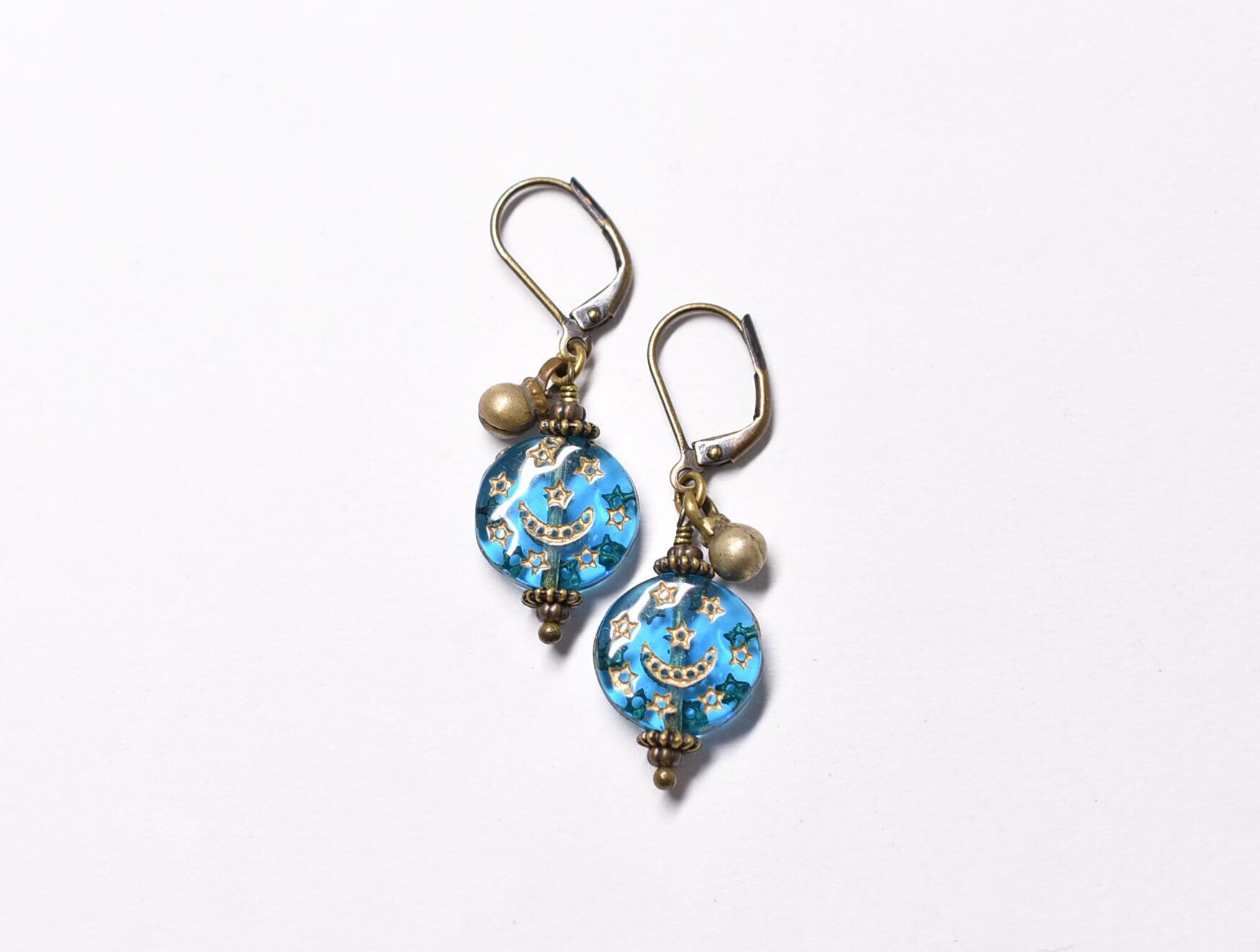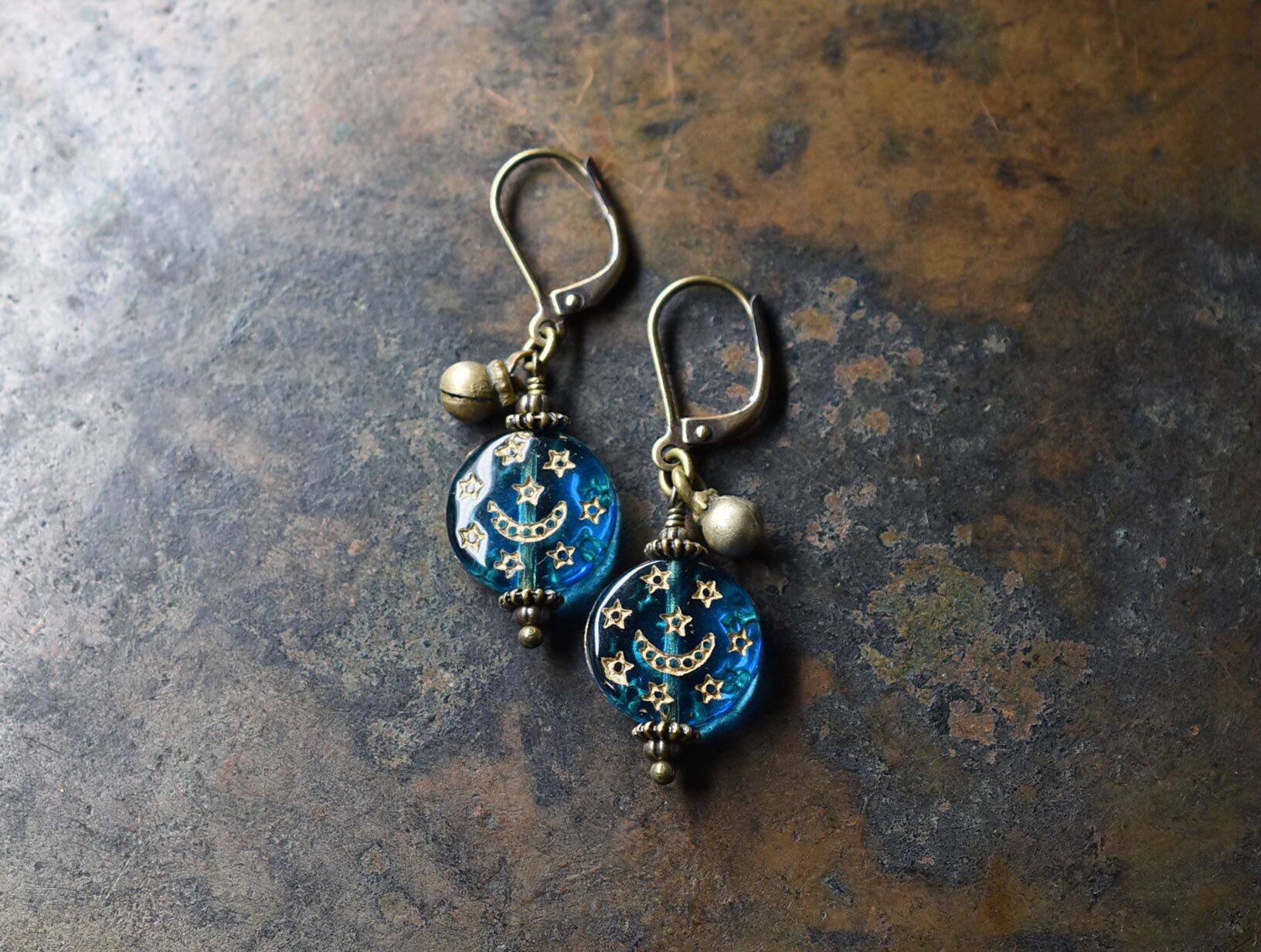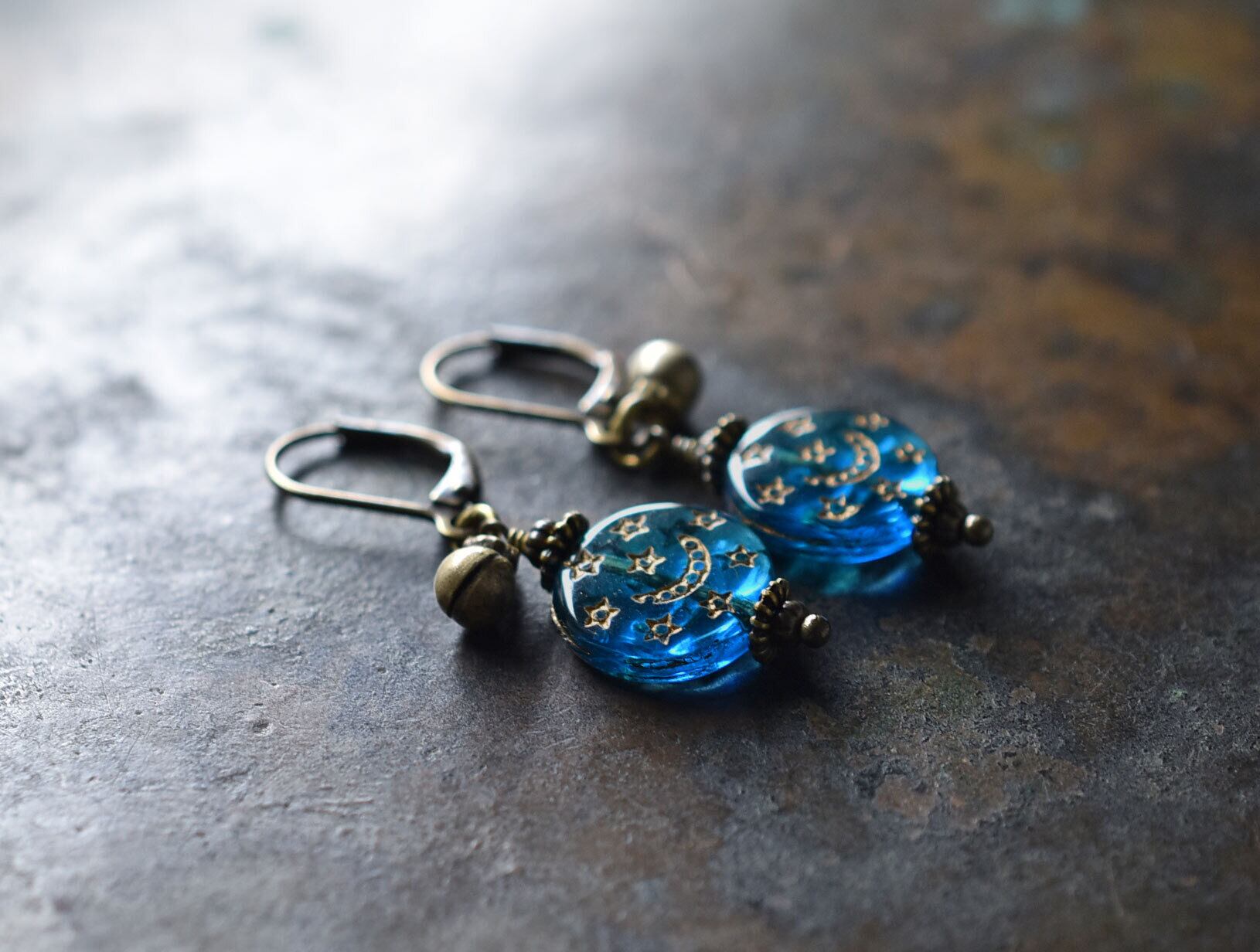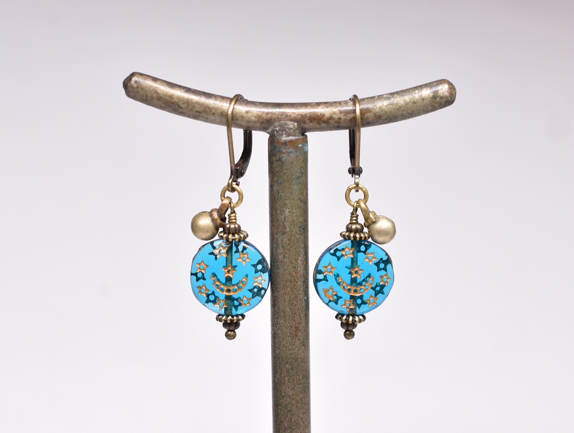 月と星の模様が施された聖者のビーズと、小さな鈴を繋いだピアスです。