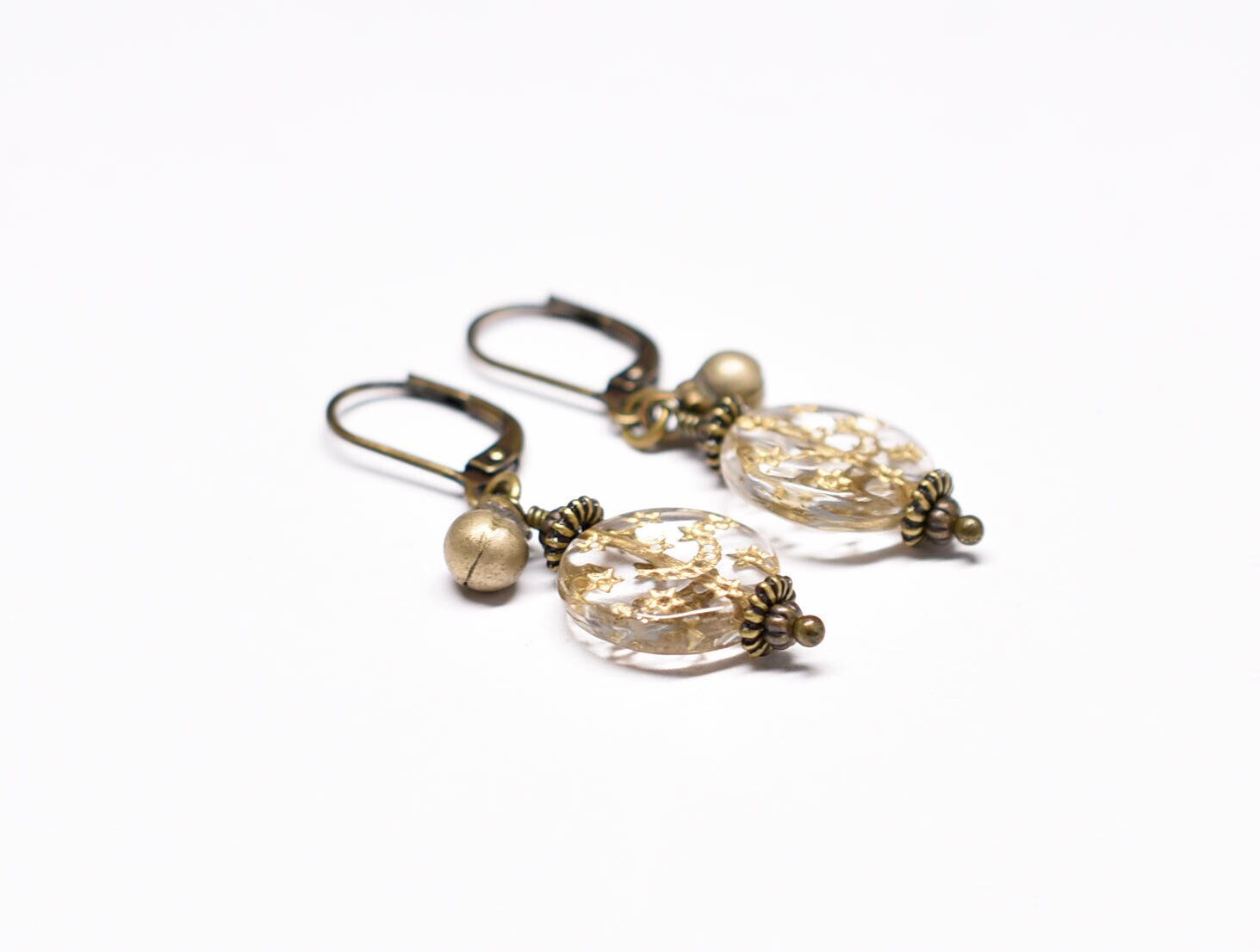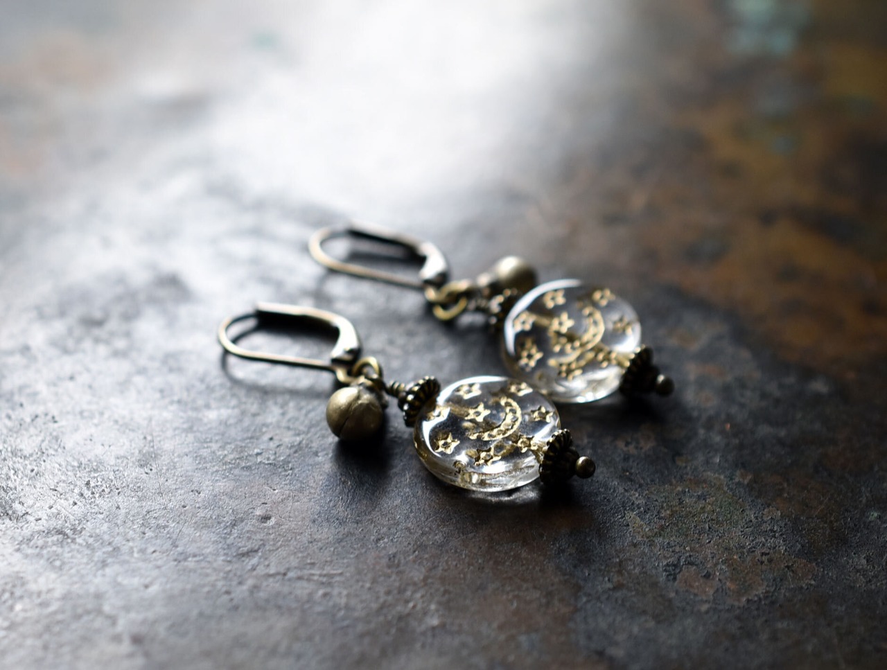 月と星の模様が施された聖者のビーズと、小さな鈴を繋いだピアスです。
