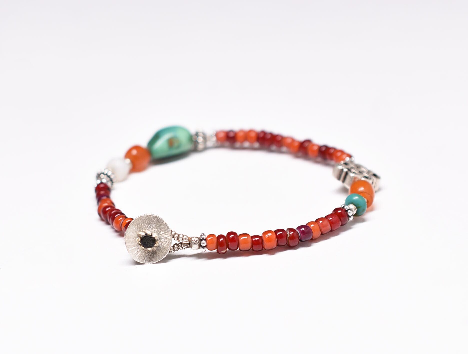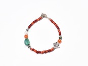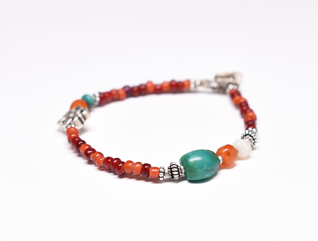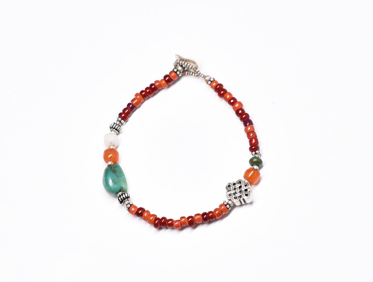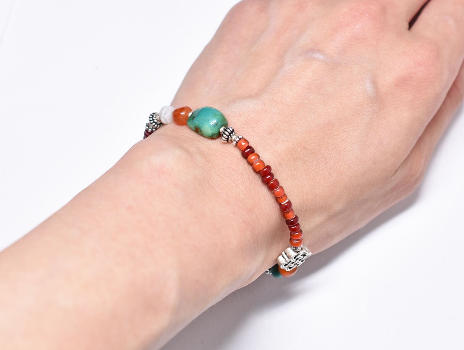 oldチベタンターコイズとミゾーラムカーネリアン、古代瑪瑙、エンドレスノット、血赤&金赤ホワイトハーツなどを繋いだブレスです。