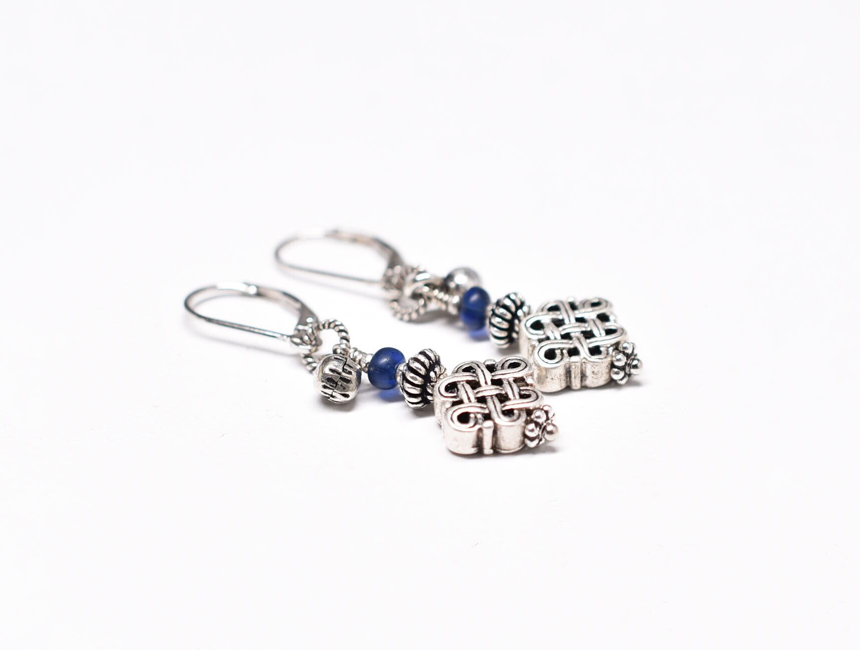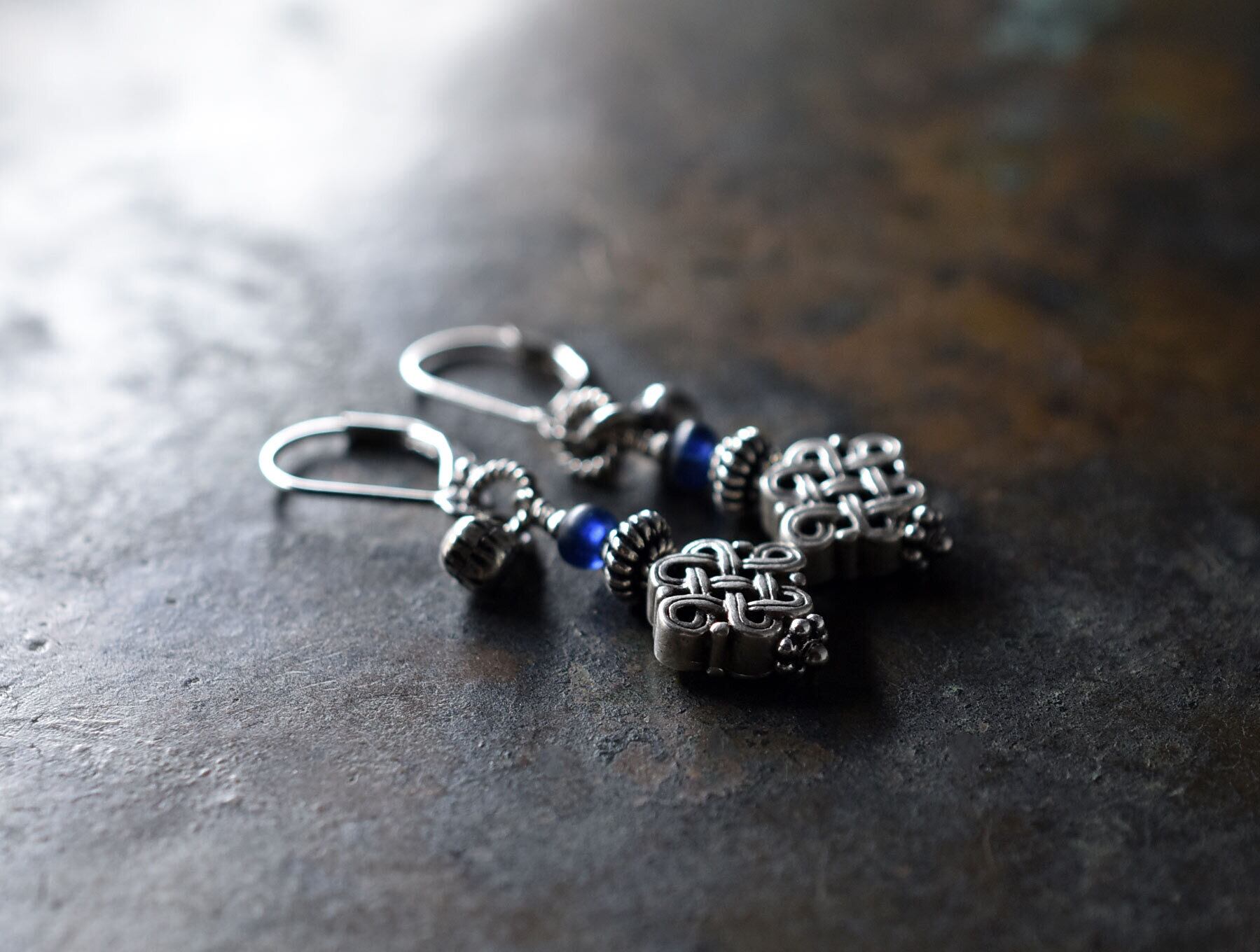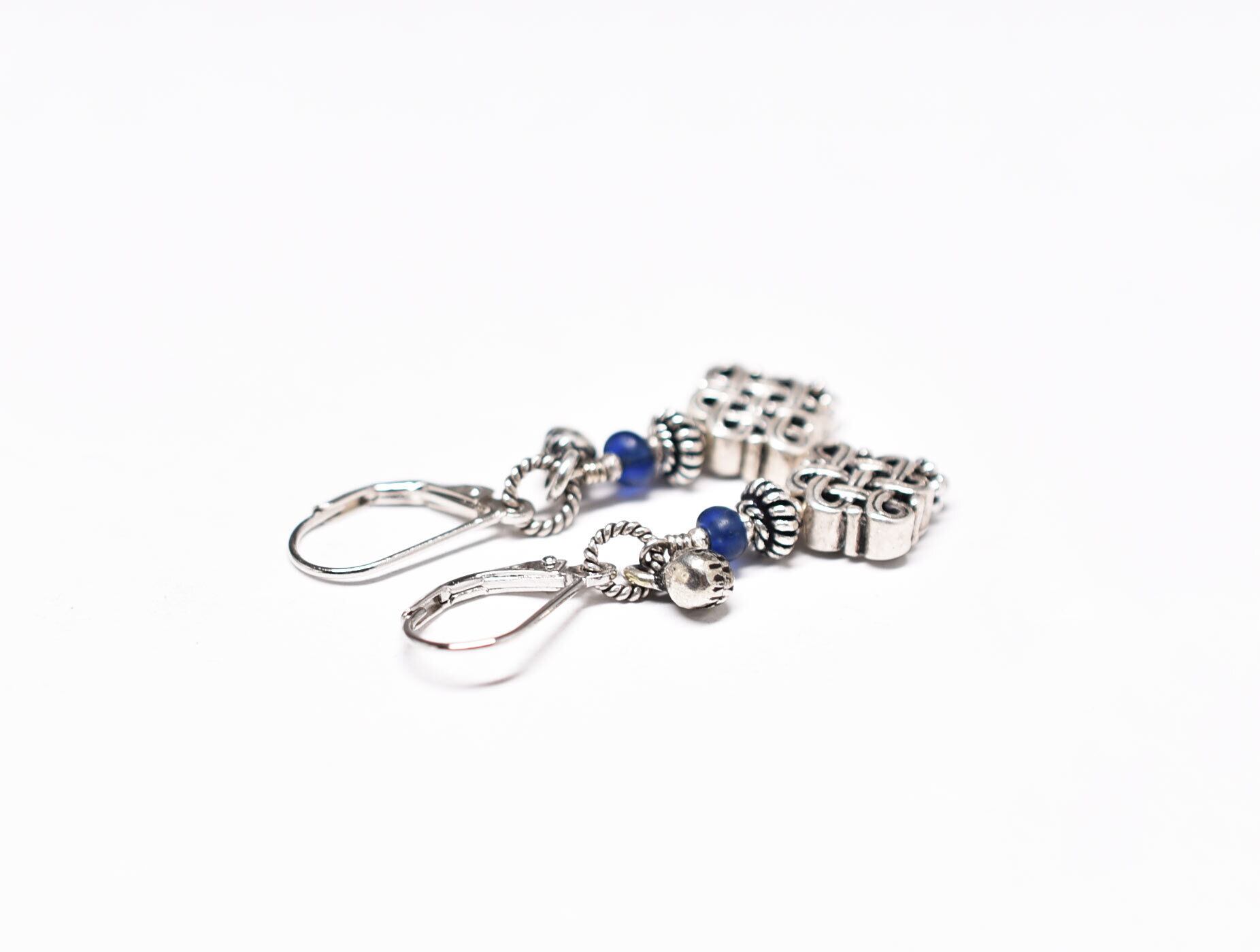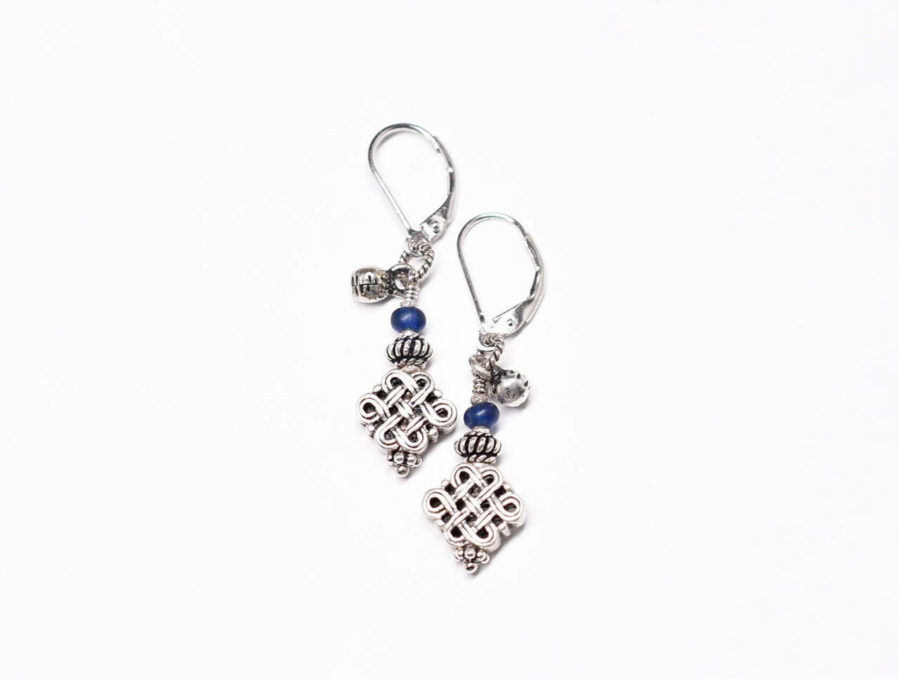 エンドレスノットとブルーアンティークビーズ、インドシルバーの小さな鈴を繋いだピアスです。