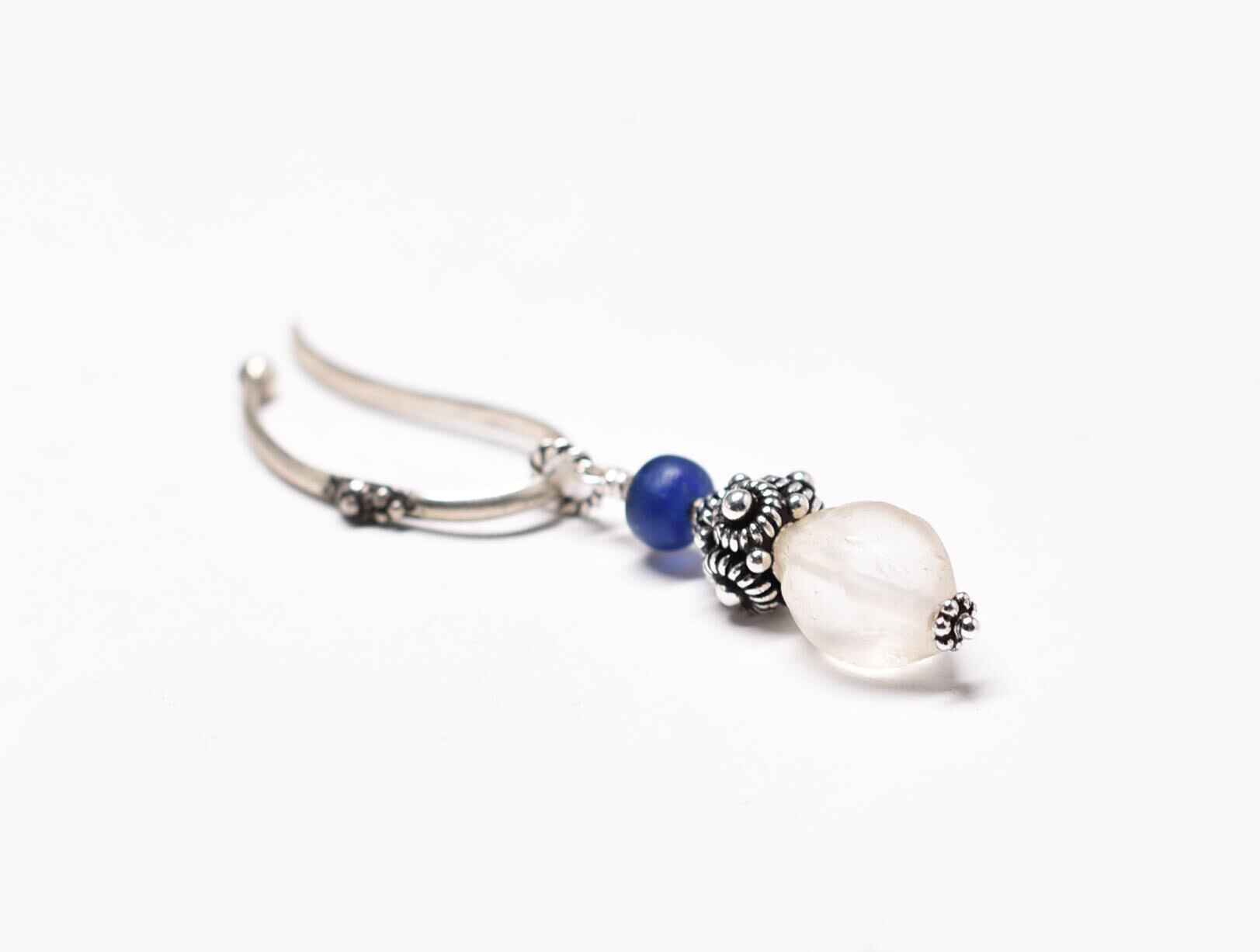古代水晶とダークブルーアンティークビーズの繊細細工のシルバービーズ、インドシルバーイヤーカフ