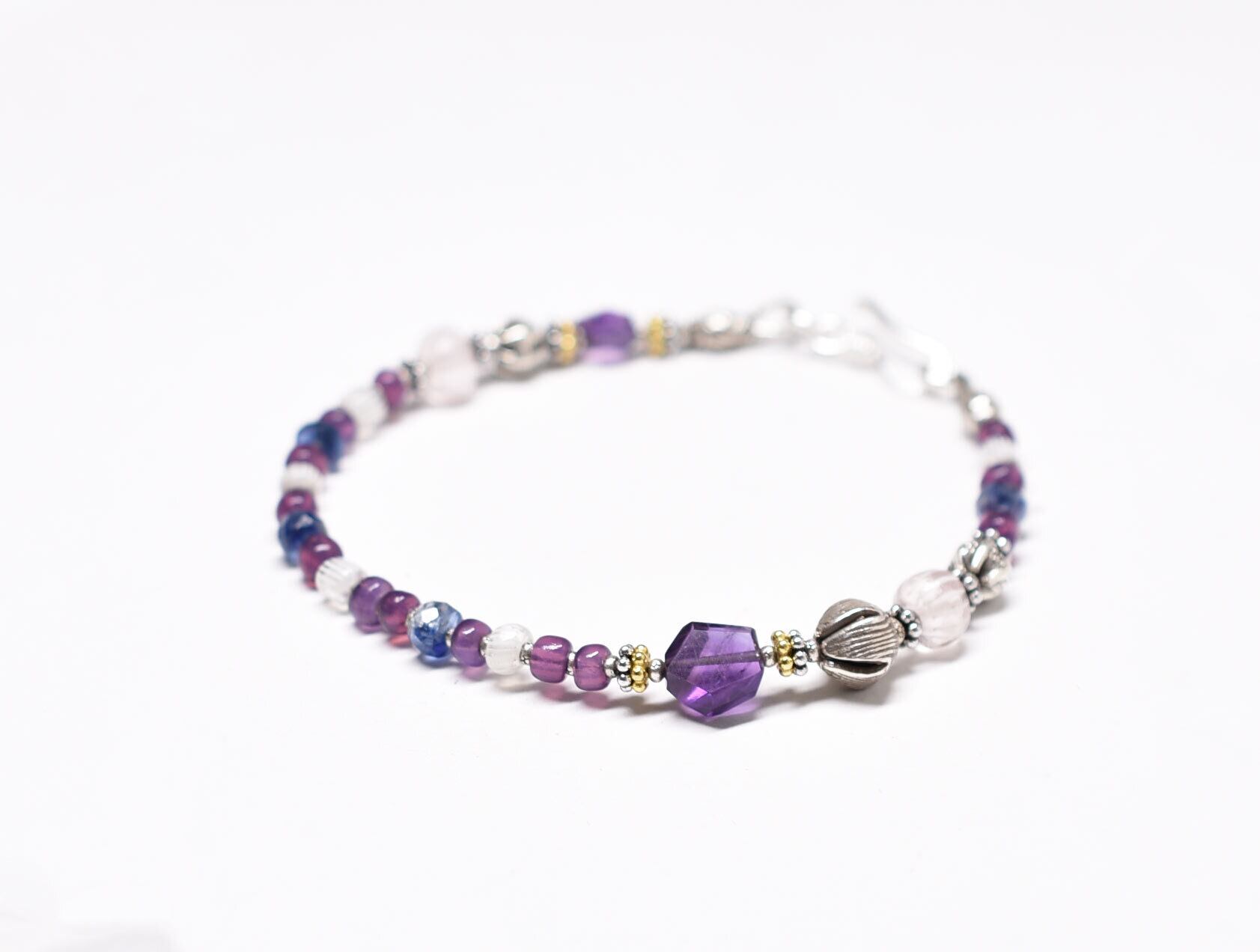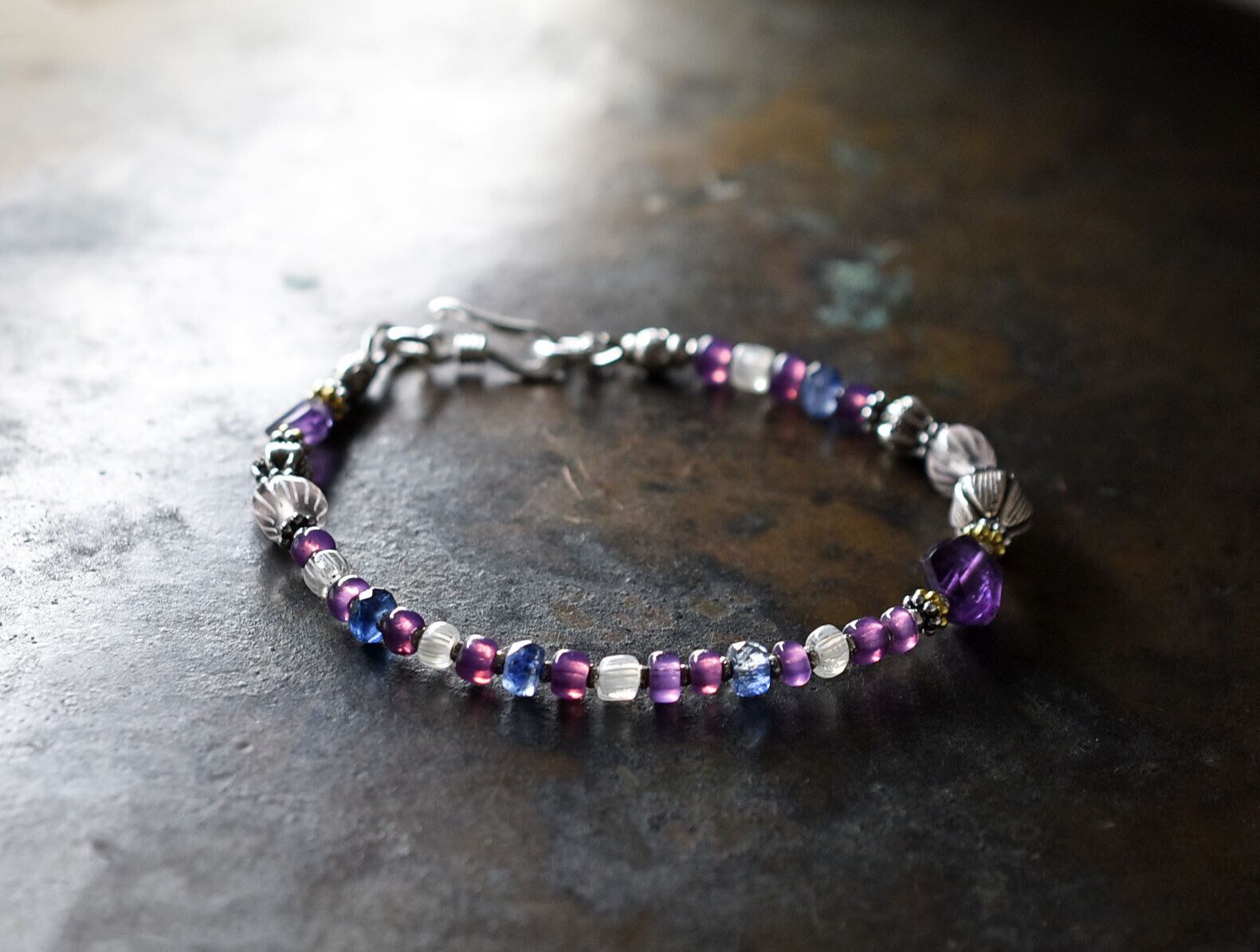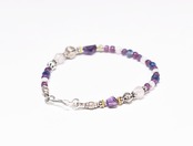 アメジストとカレンシルバー、グーズベリー、すみれ色フランスヴィンテージビーズ、カイヤナイトを繋いだブレスです。