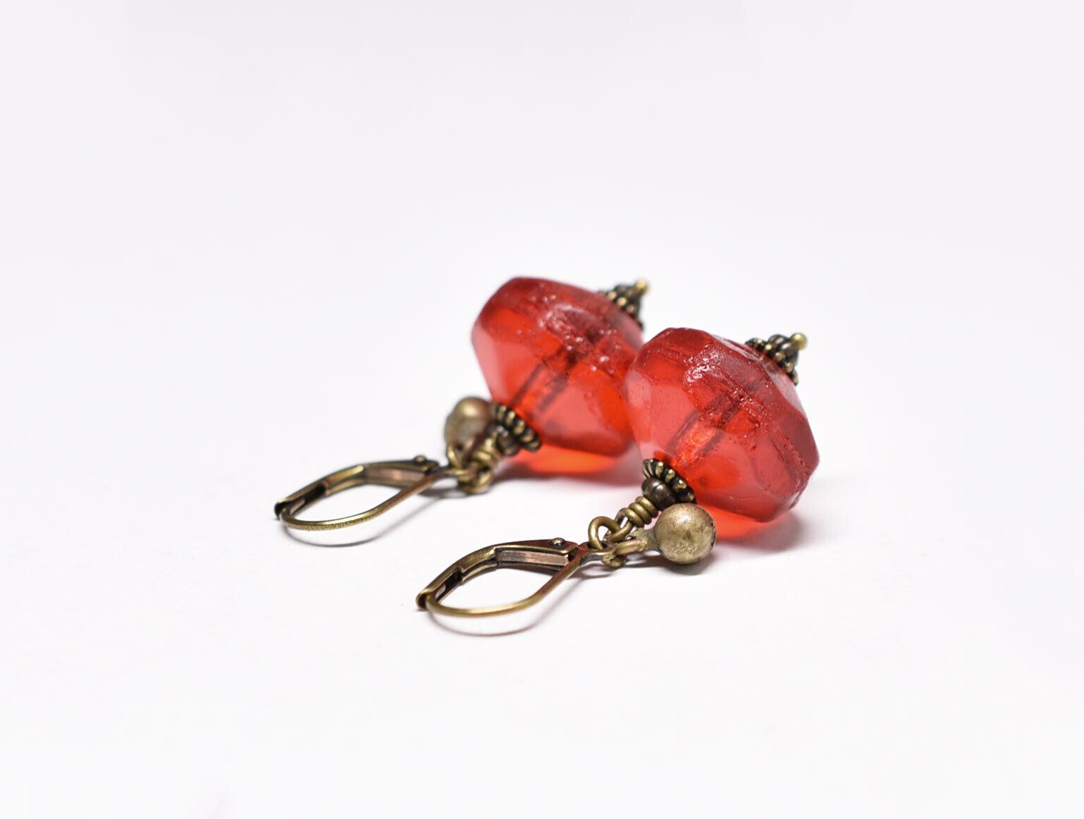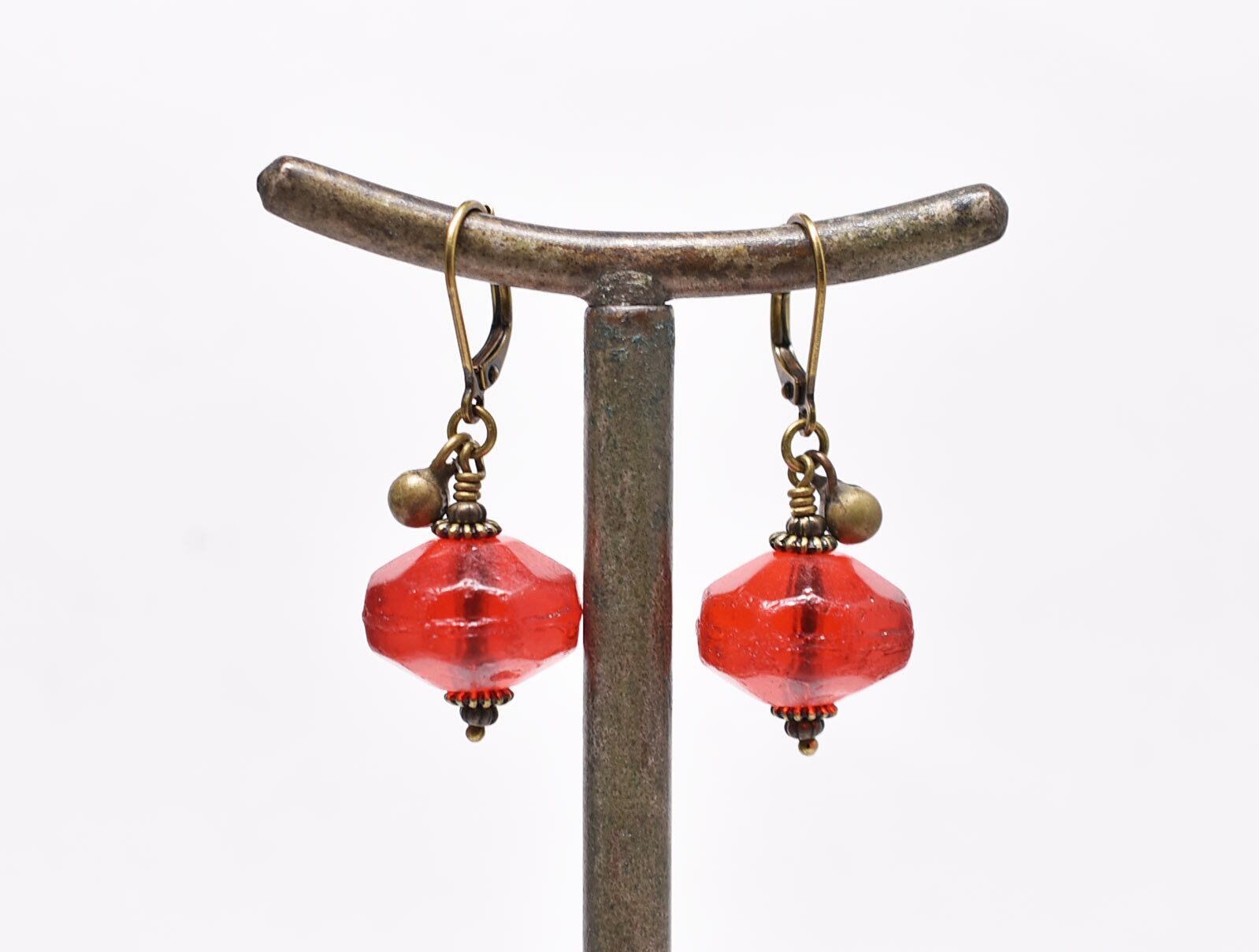 真っ赤な算盤型アンティークボヘミアビーズと民族鈴のピアスです。(金具をシルバー925へ変更させていただきます。)