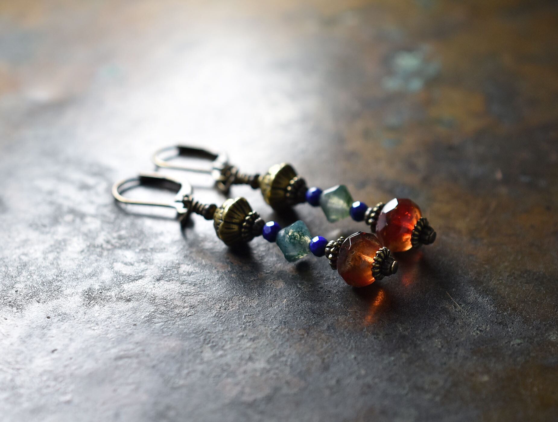 ファイアーレッドチェコビーズとモスアゲート、ラピス、蓮華ブラスを繋いだピアスです。