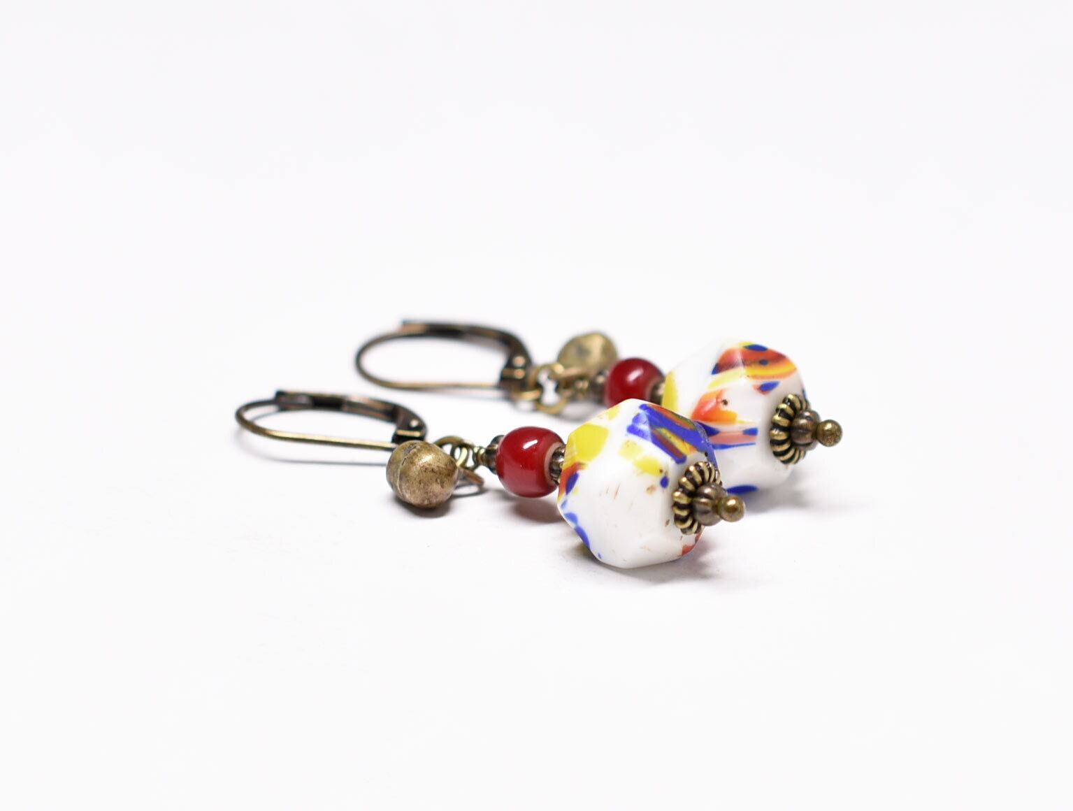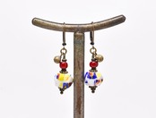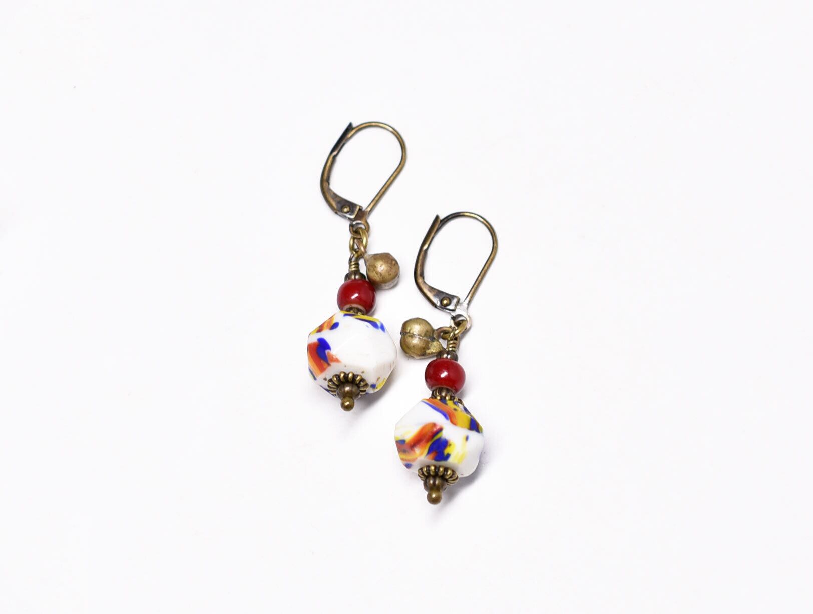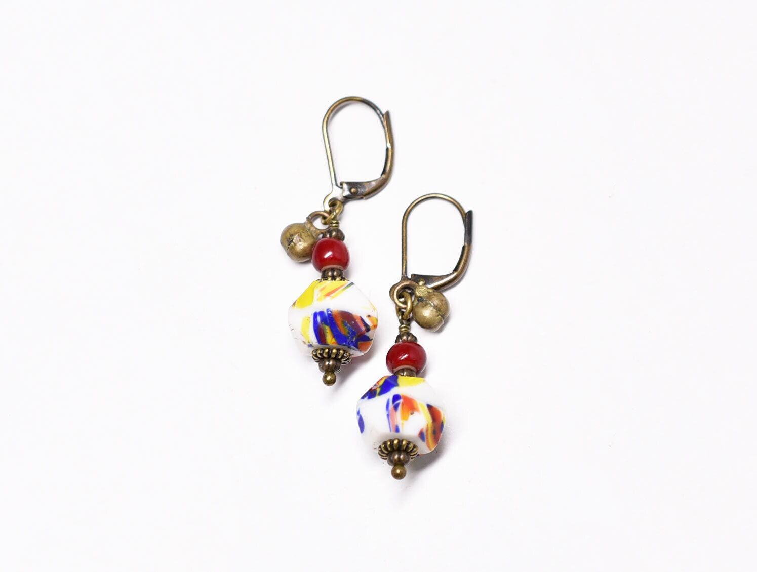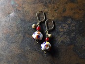 抽象画のようなボヘミアアンティークビーズとホワイトハーツ、民族鈴のピアス