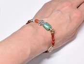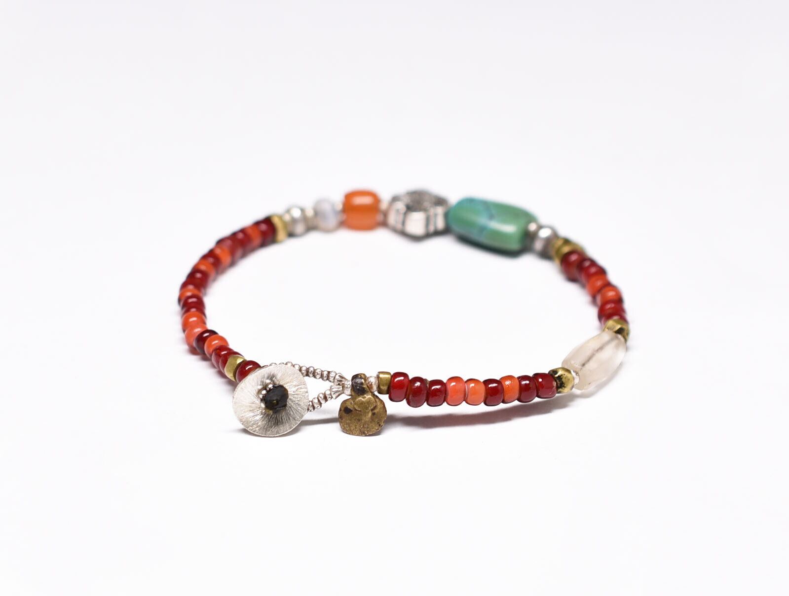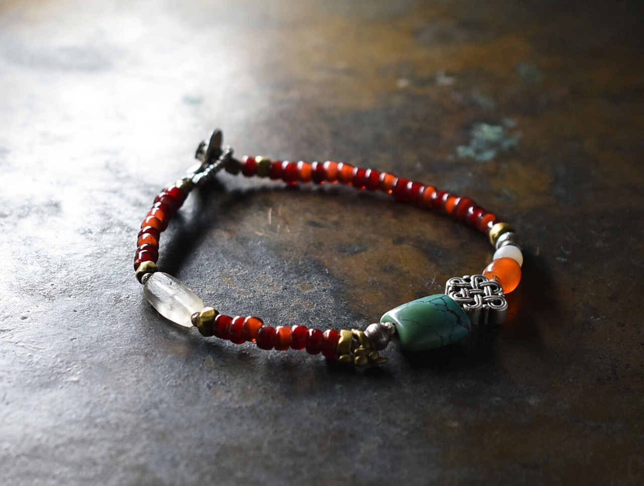 oldチベタンターコイズとミゾーラムカーネリアン、古代瑪瑙、古代水晶、エンドレスノット、oldチンシルバー&オリッサブラス、血赤&金赤ホワイトハーツなどを繋いだブレスです。