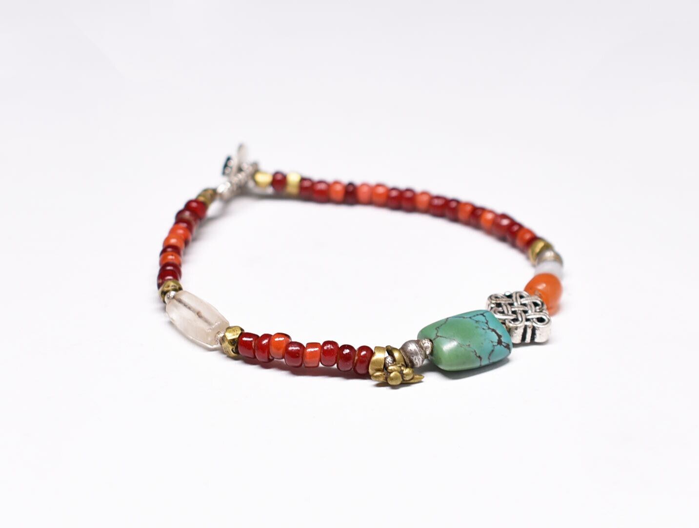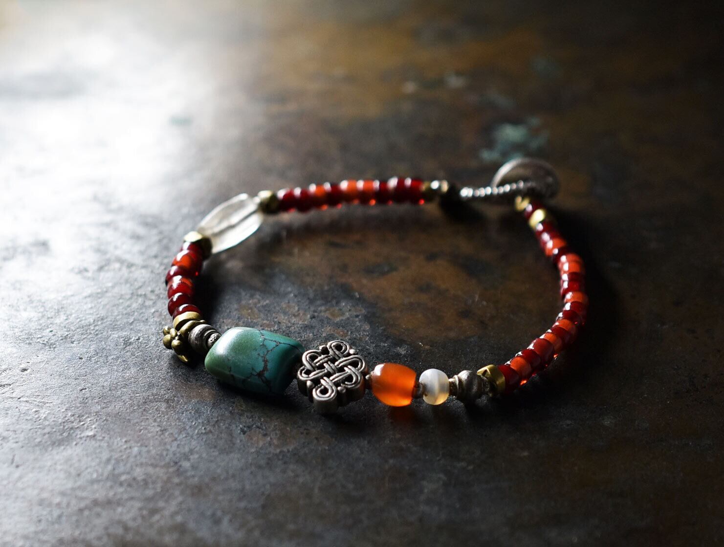 oldチベタンターコイズとミゾーラムカーネリアン、古代瑪瑙、古代水晶、エンドレスノット、oldチンシルバー&オリッサブラス、血赤&金赤ホワイトハーツのブレス