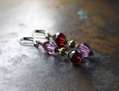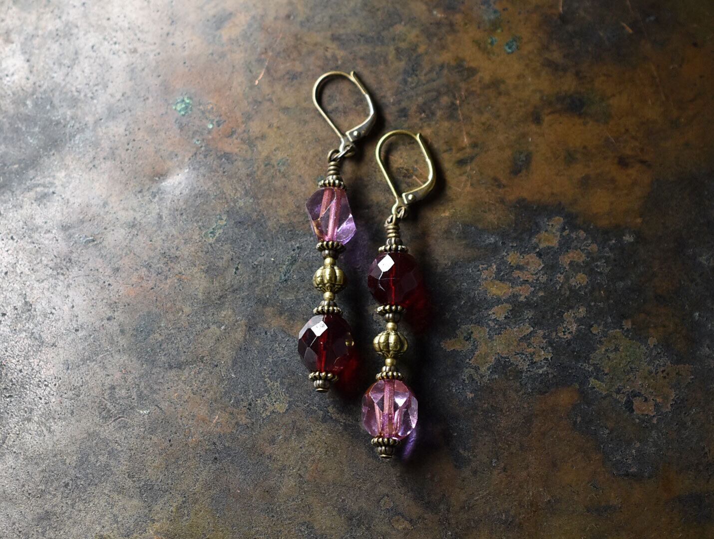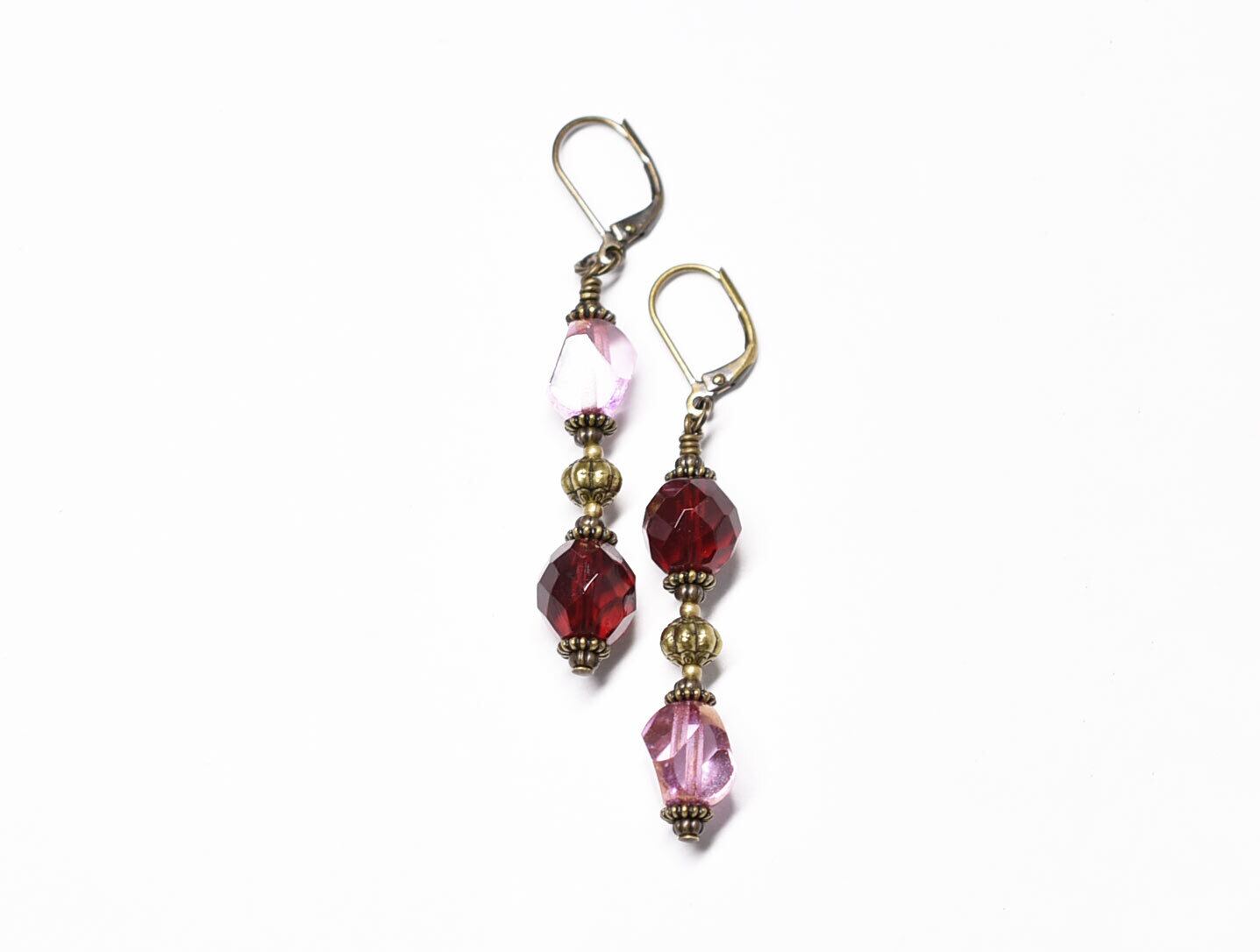 オペラピンクチェコビーズと深紅チェコビーズ、手毬ブラスのアンシメトリーピアス