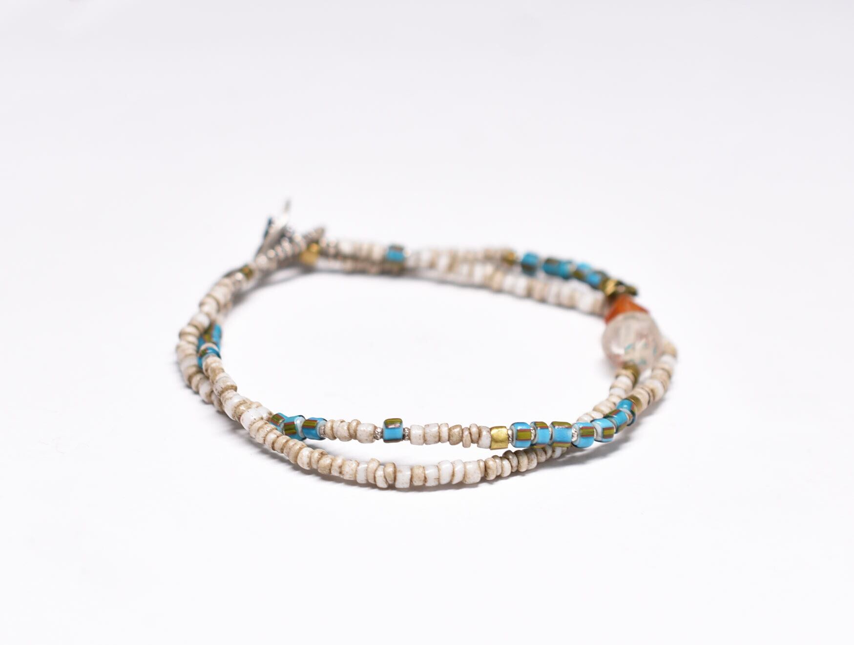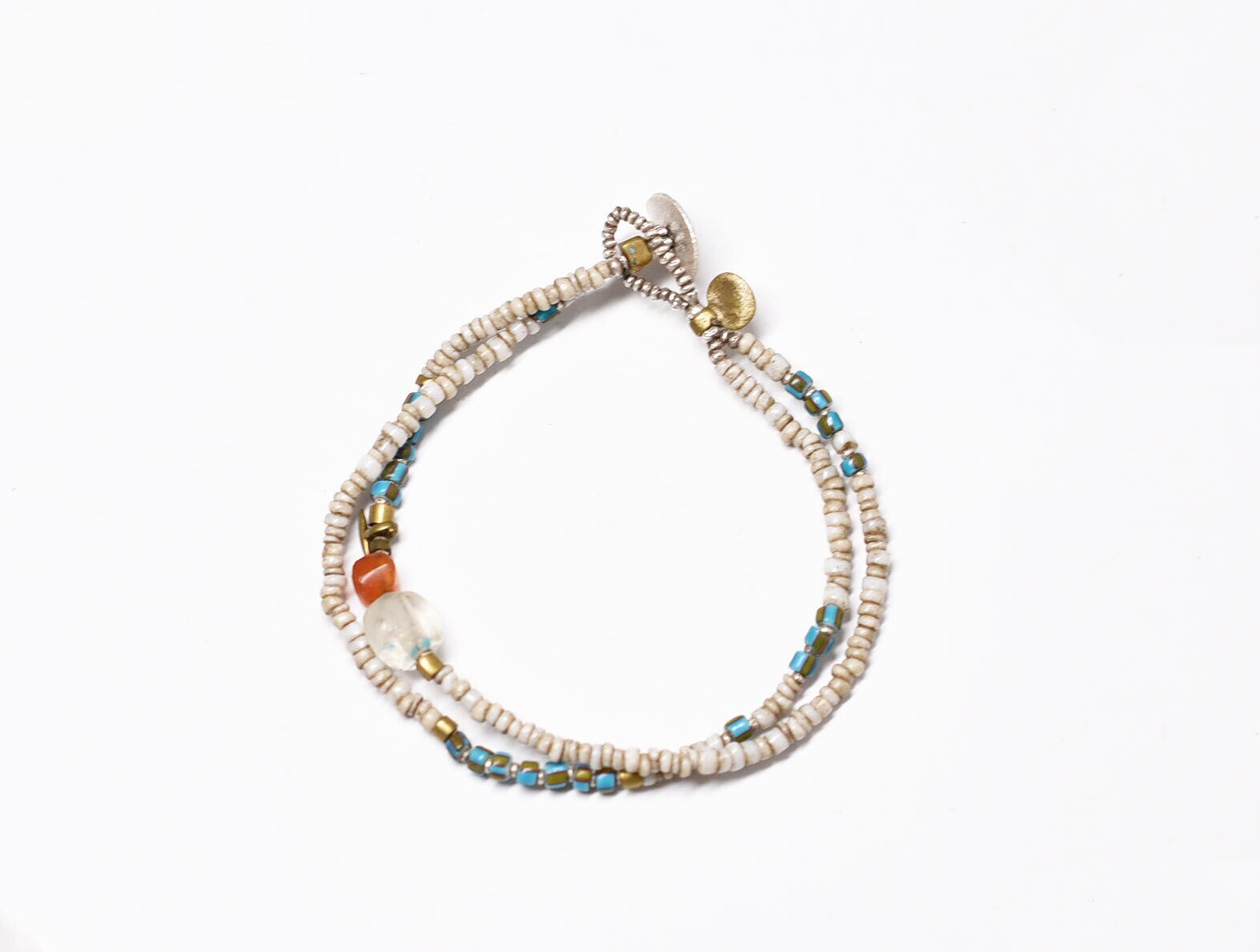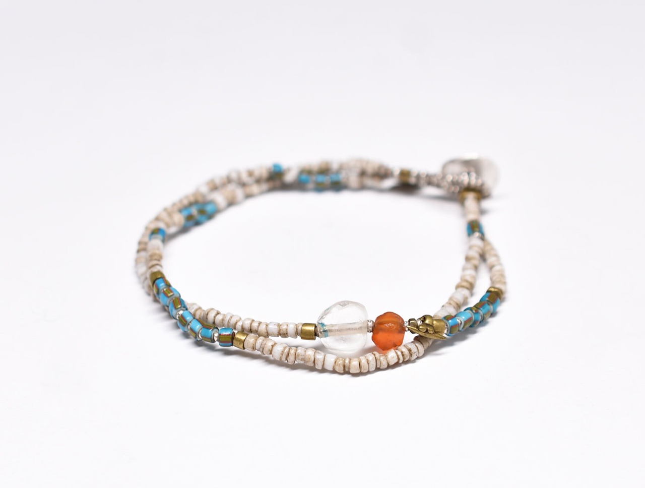 古代施釉水晶と古代カーネリアン、oldオリッサブラス、ターコイズブルーホワイトハーツ、ホワイトビーズの2連ブレス