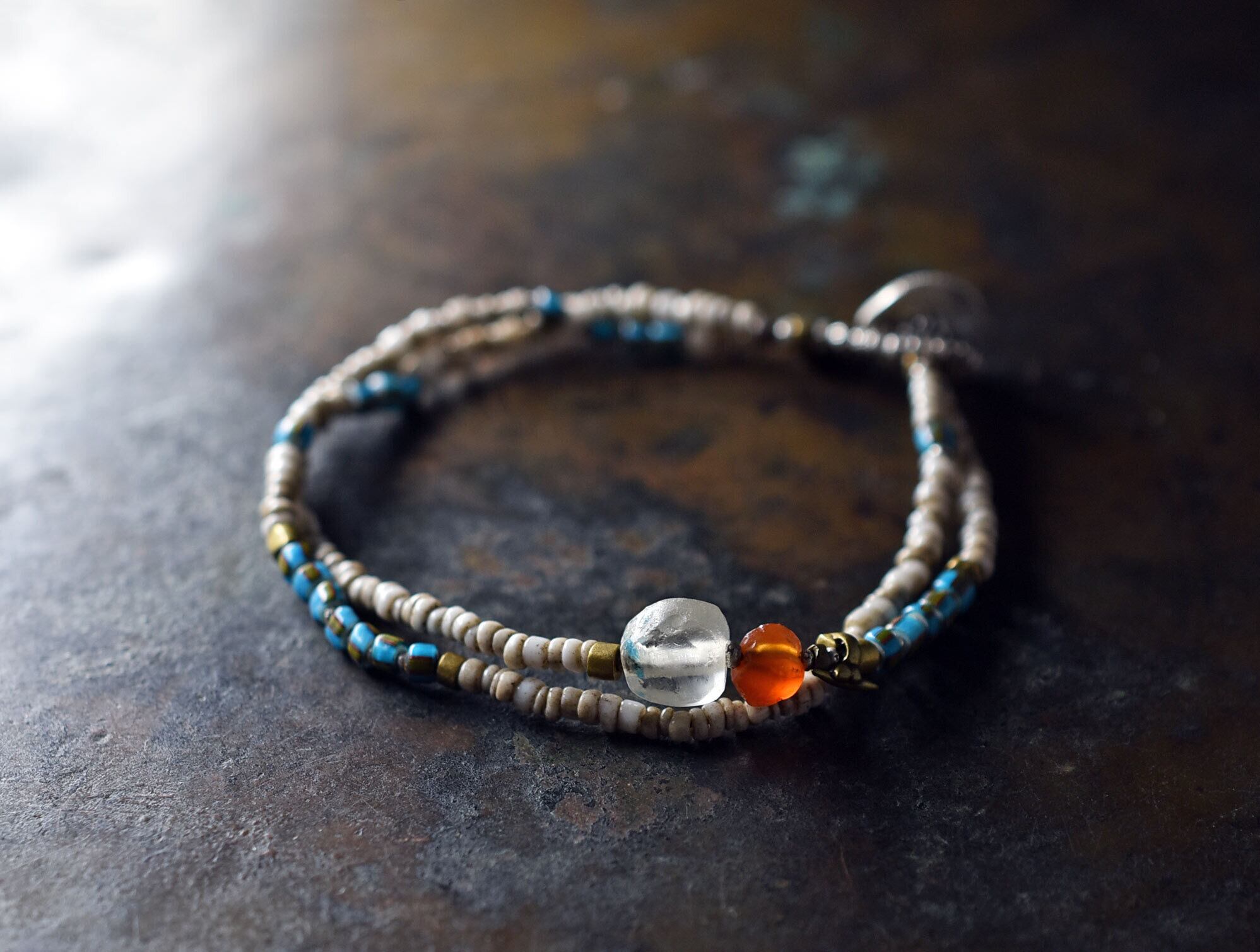 古代施釉水晶と古代カーネリアン、oldオリッサブラス、ターコイズブルーホワイトハーツ、ホワイトビーズを繋いだ2連のブレスです。