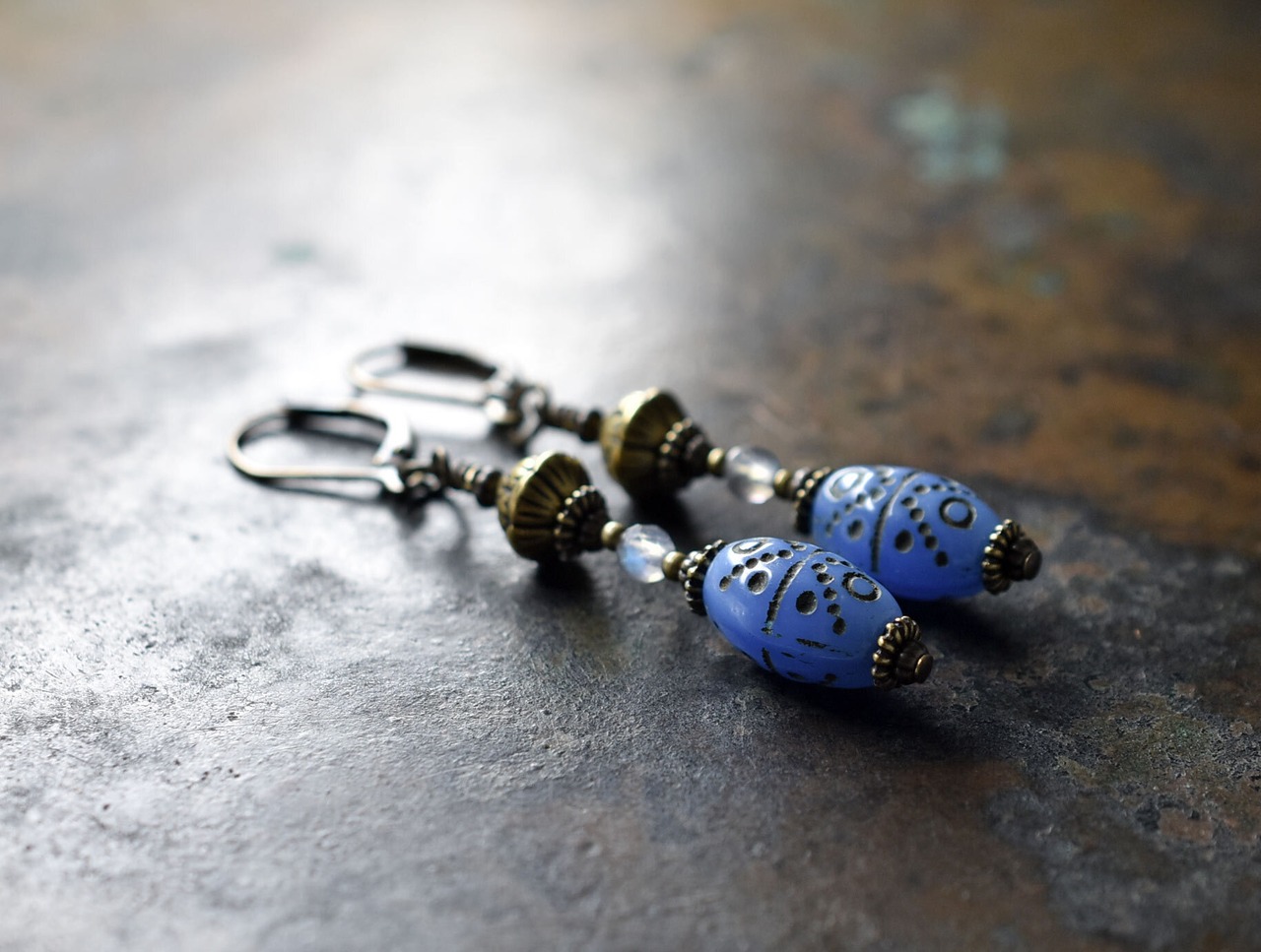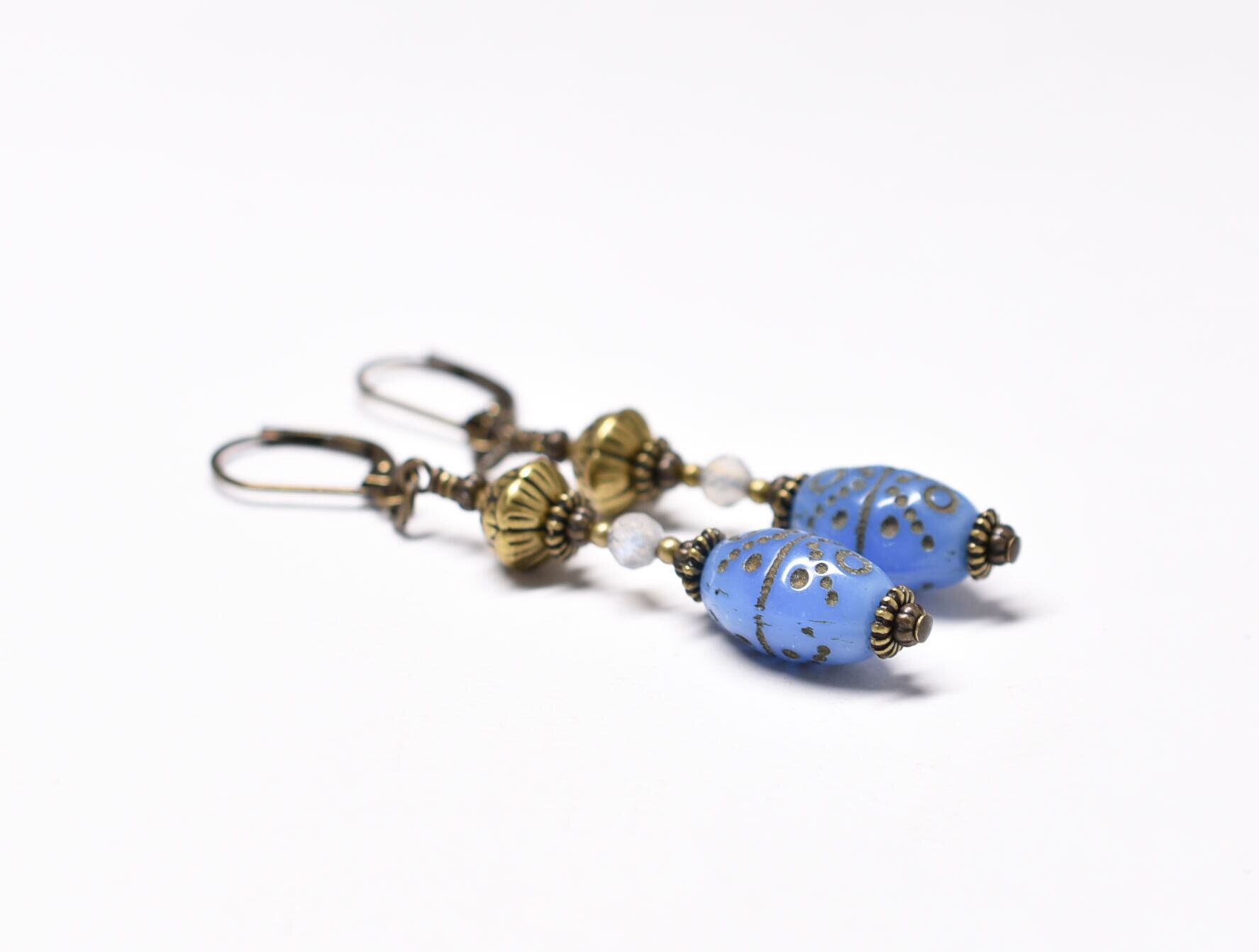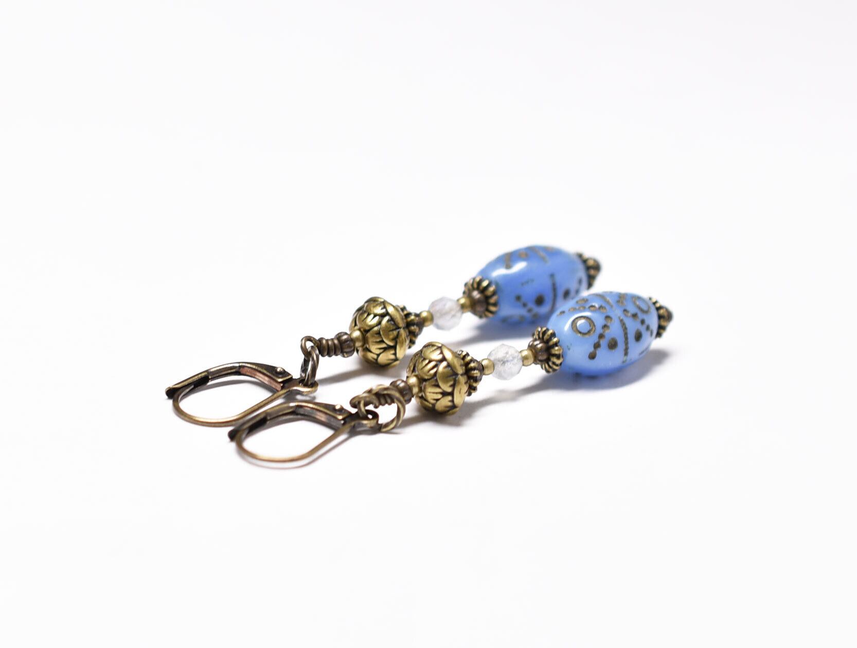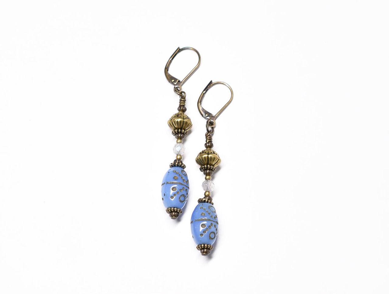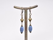 ヒヤシンス色のチェコヴィンテージビーズとラブラドライト、蓮華ブラスを繋いだピアスです。