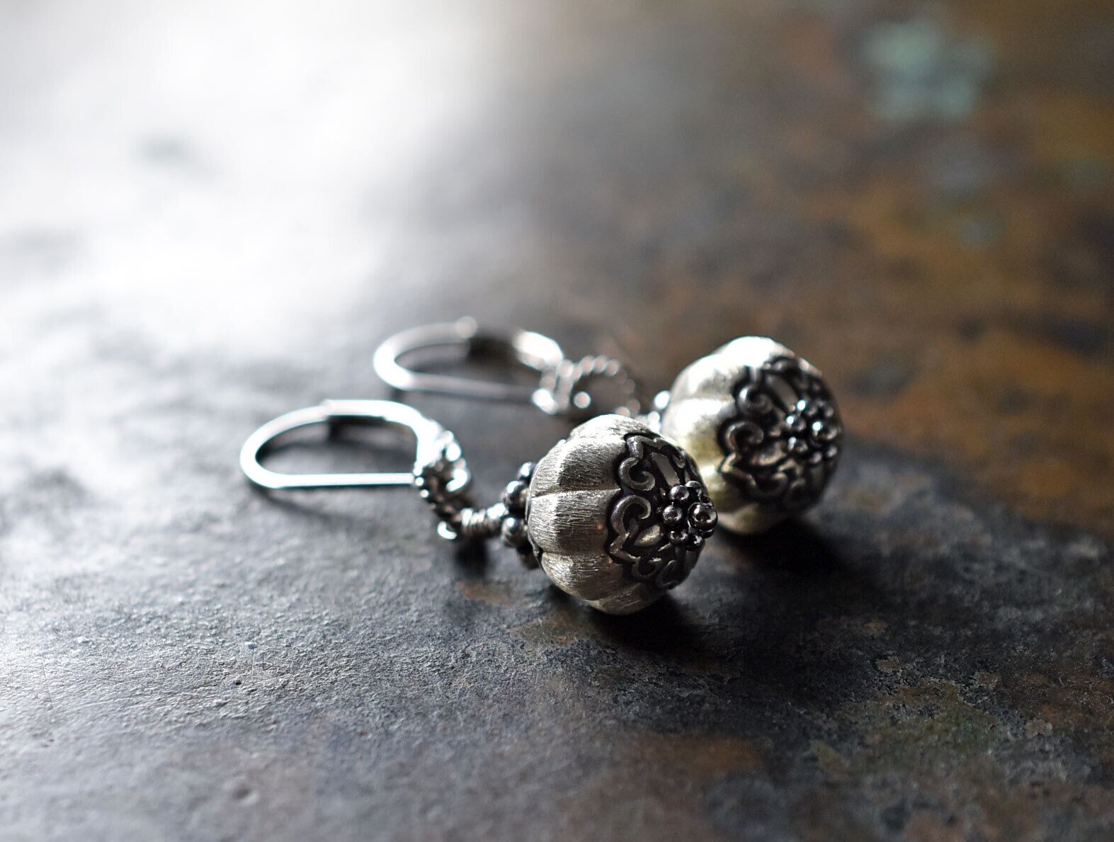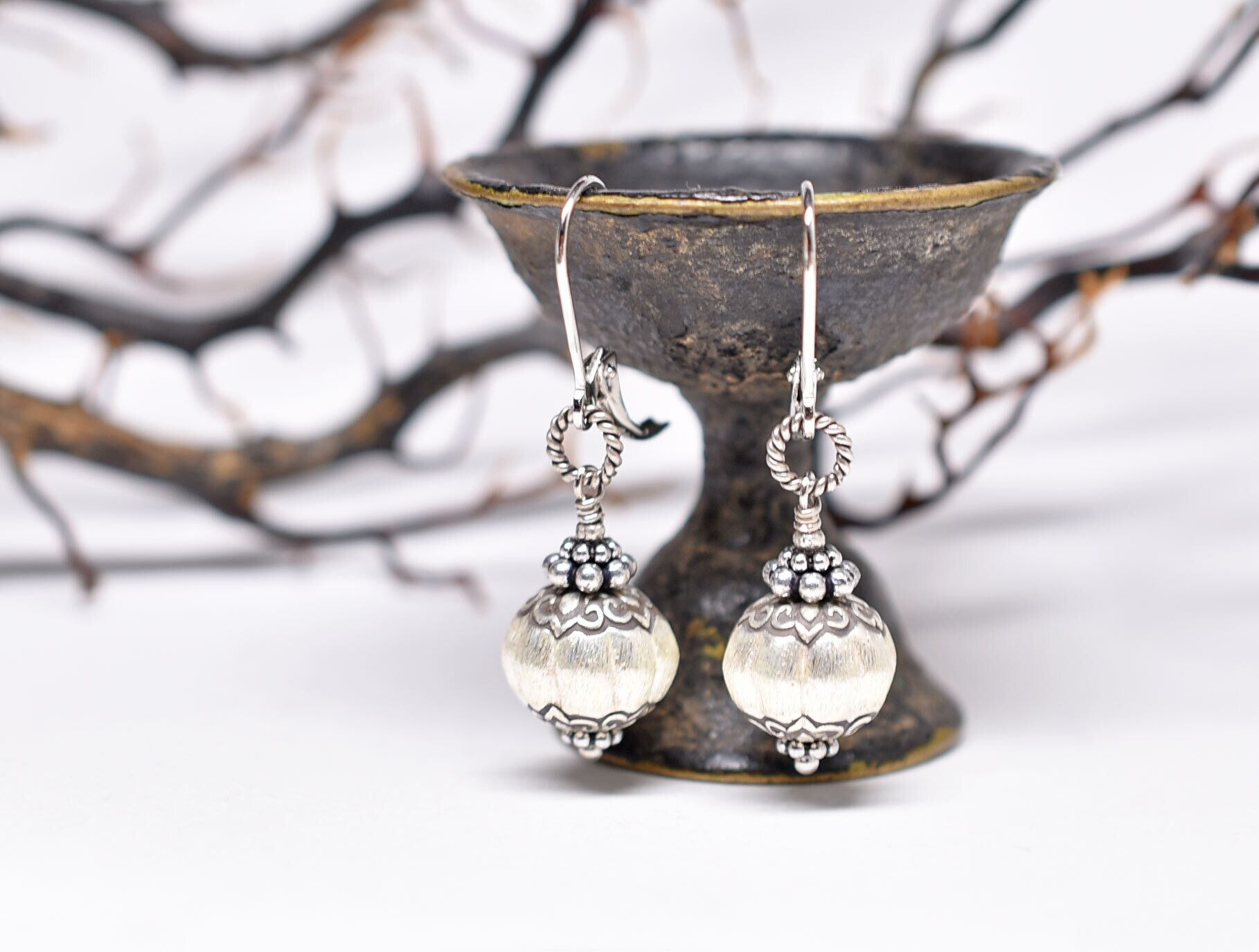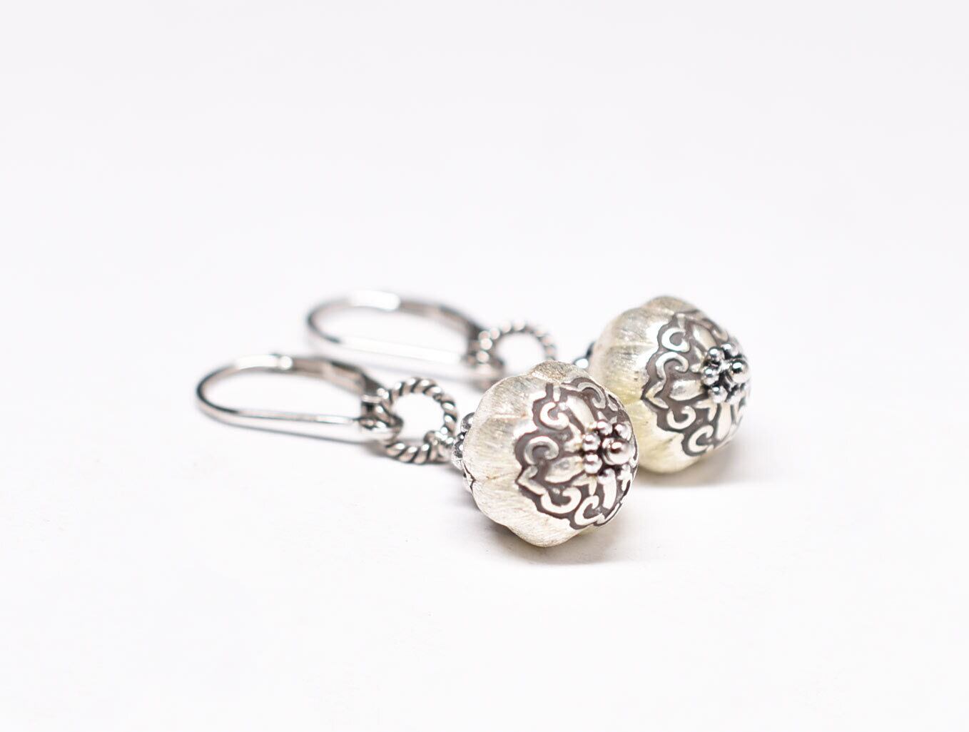 筋が施されたぷっくりとしたカレンシルバーの上下には花弁のような繊細な刻印が施されています。