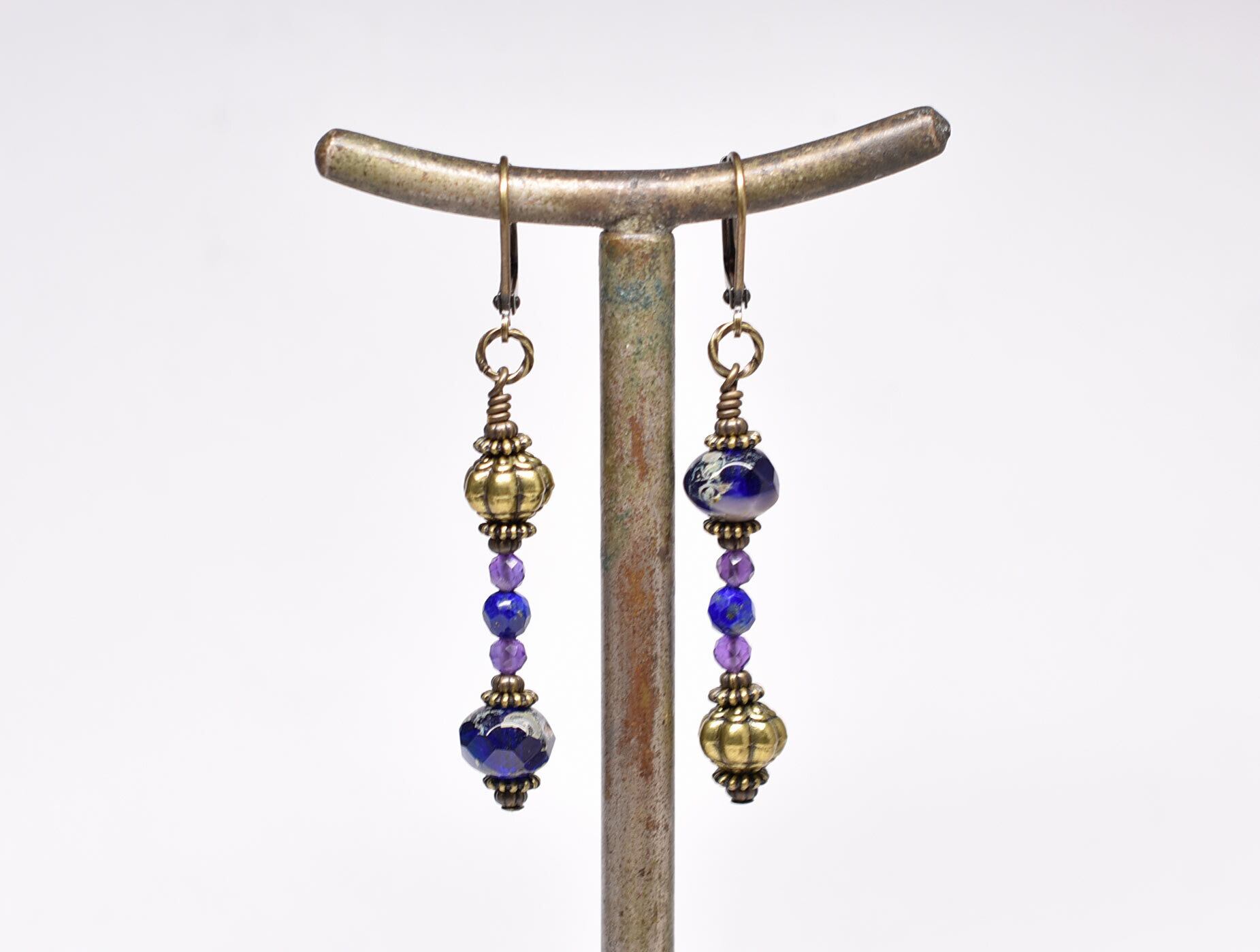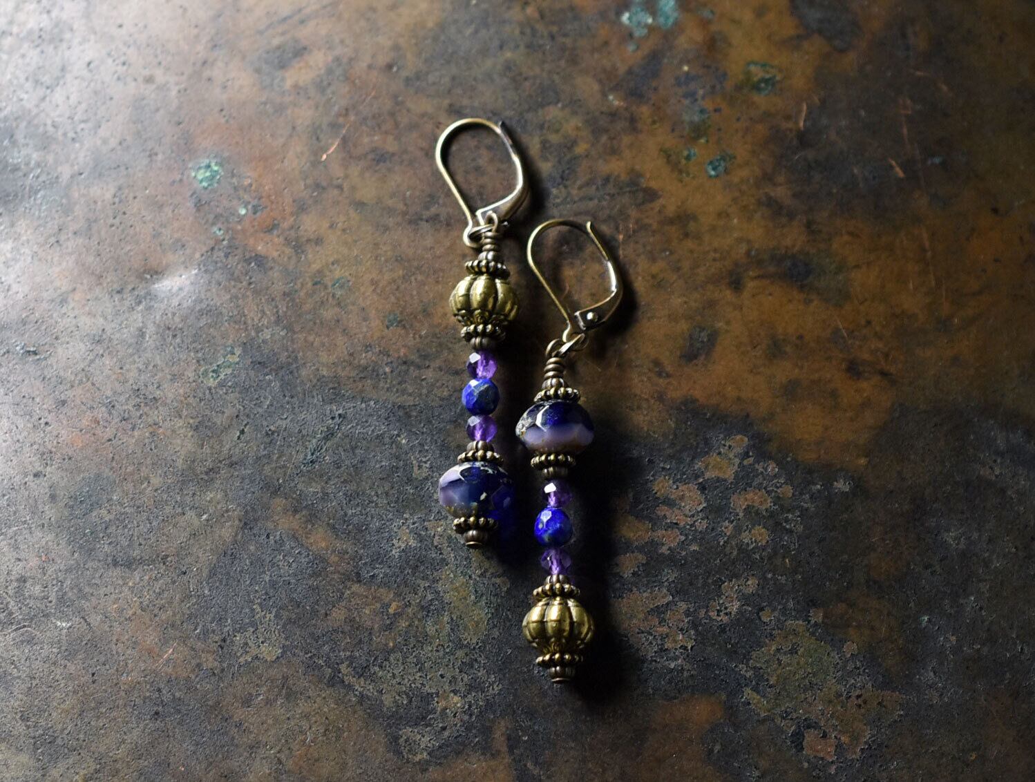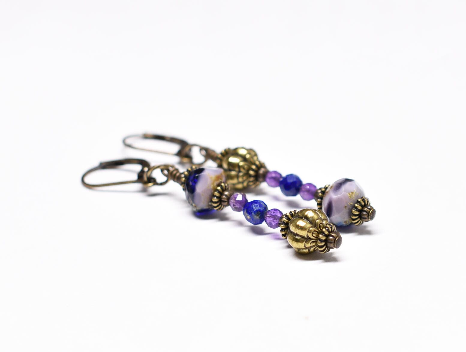 チェコヴィンテージビーズとアメジスト、ラピス、手毬ブラスのアンシメトリーピアス