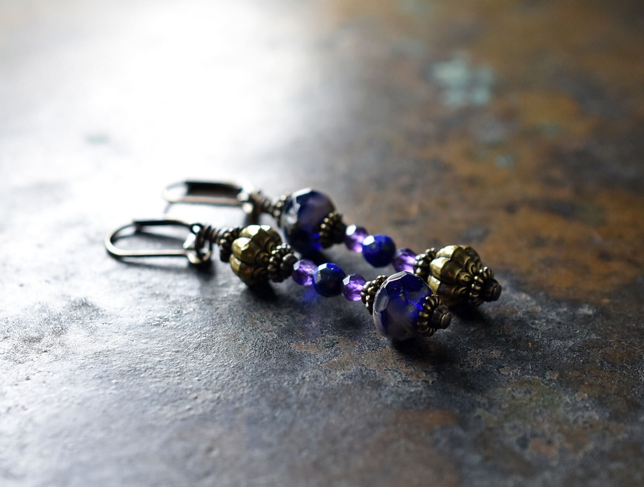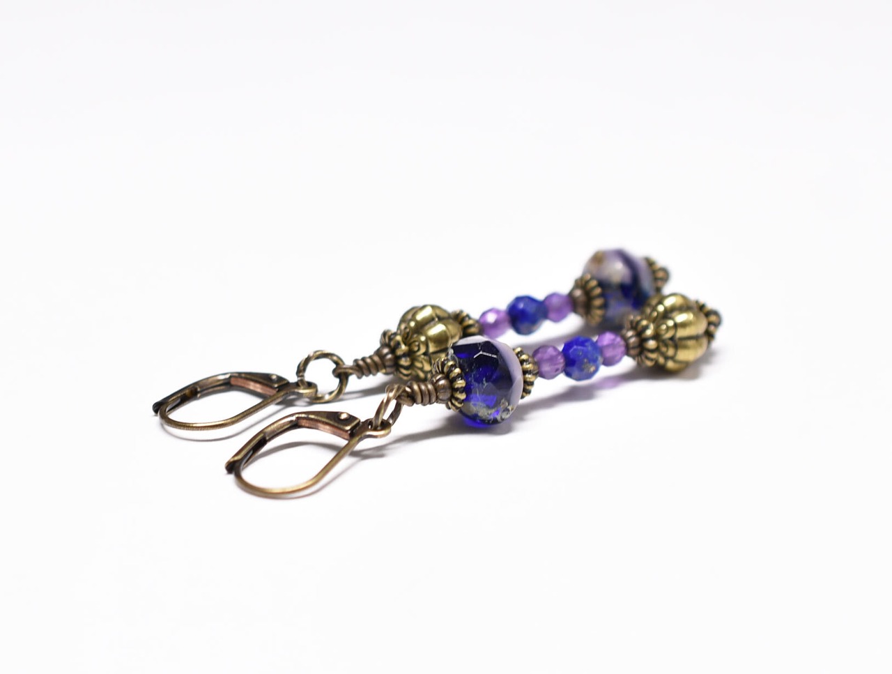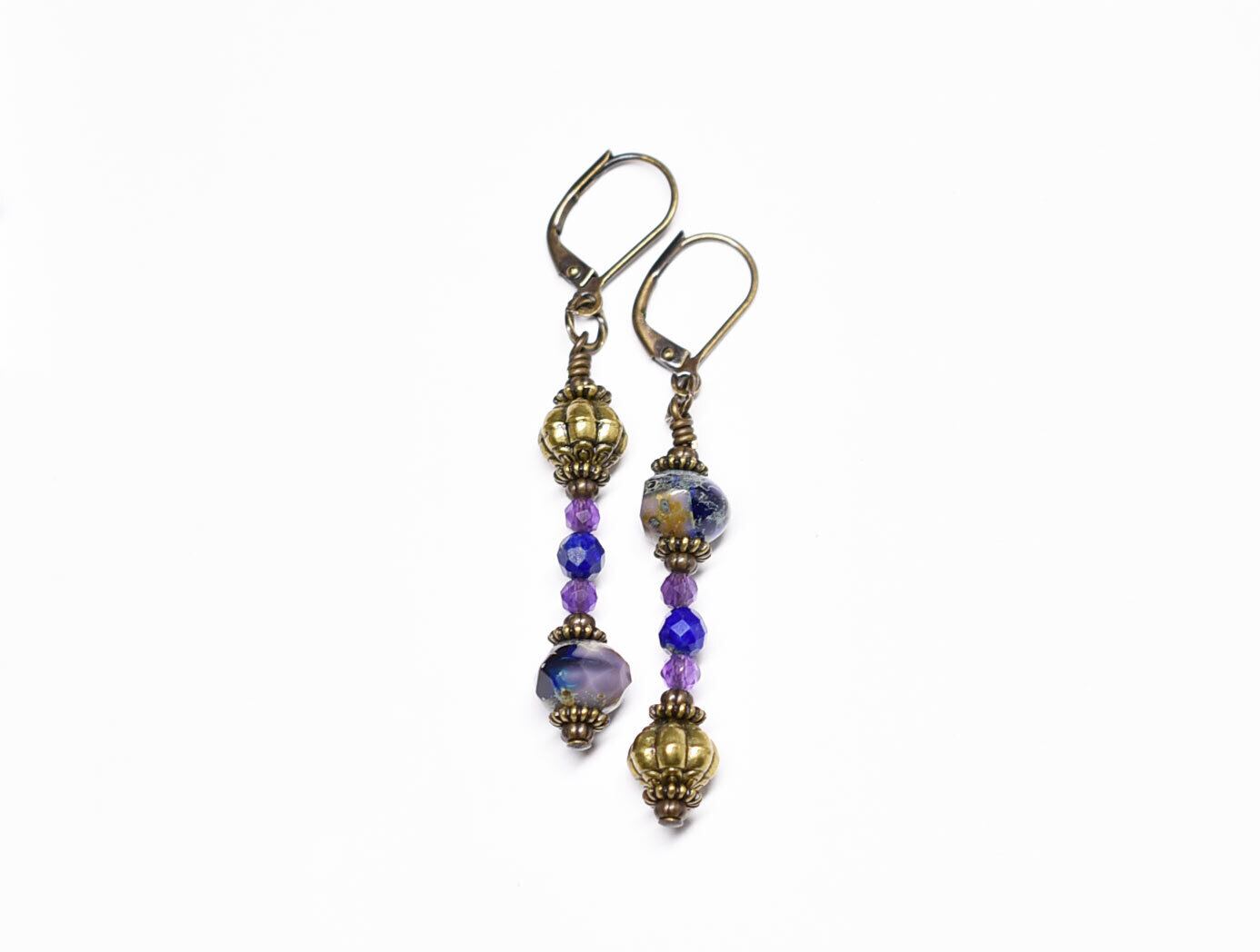 チェコヴィンテージビーズとアメジスト、ラピス、手毬ブラスのアンシメトリーピアス