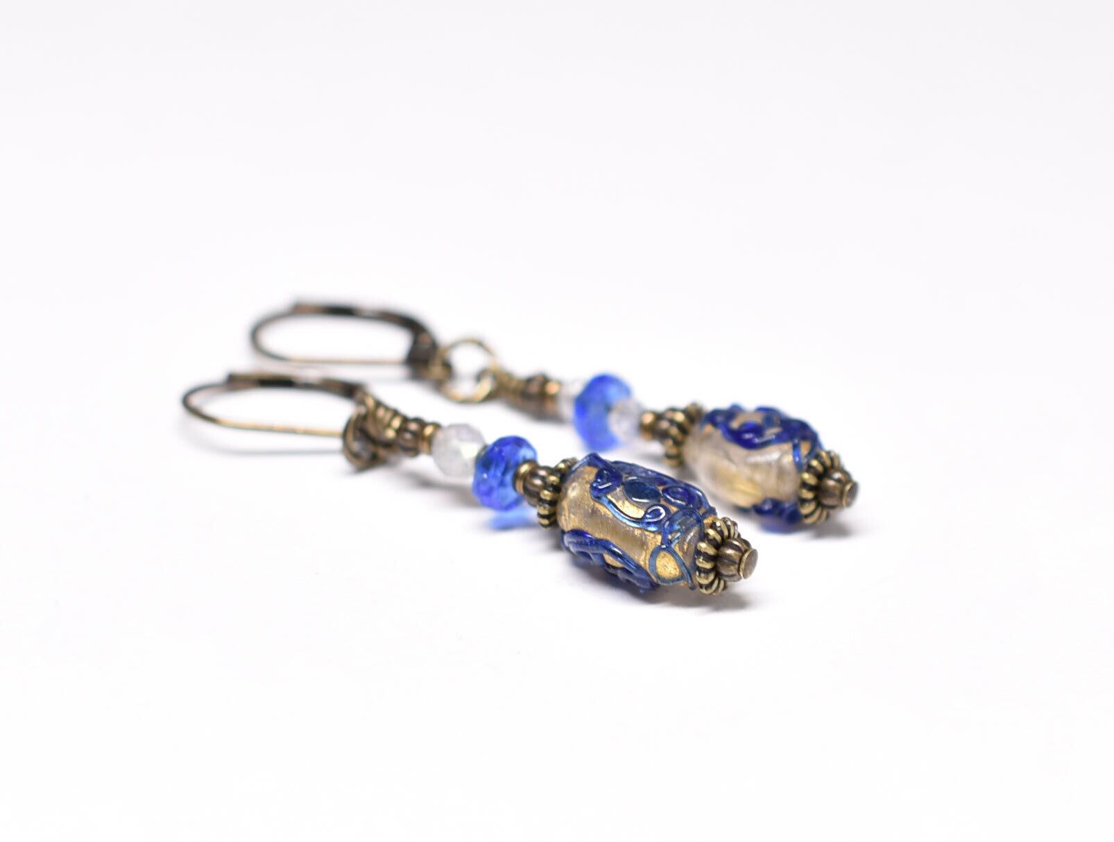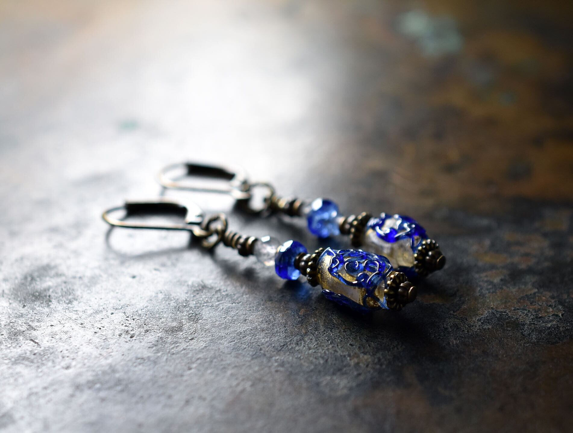 アンティーク瑠璃色トレイルデコレーションの金箔装飾ビーズとラブラドライト、ブルービーズのアンシメトリーピアス