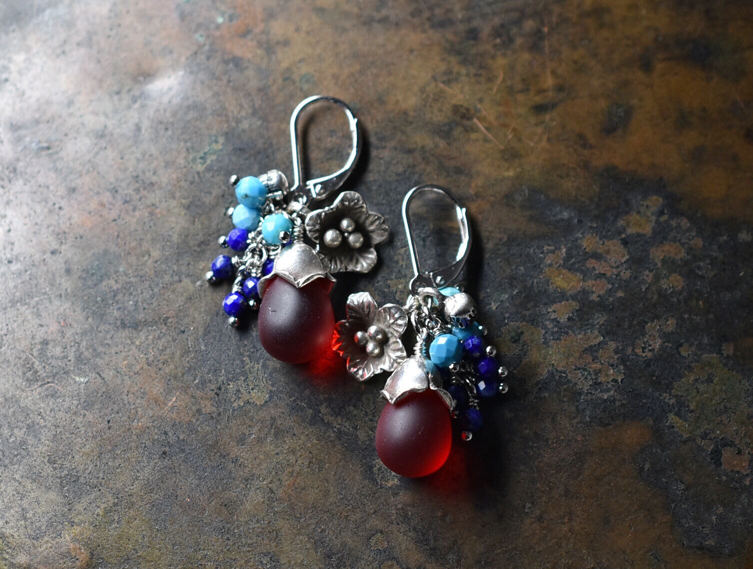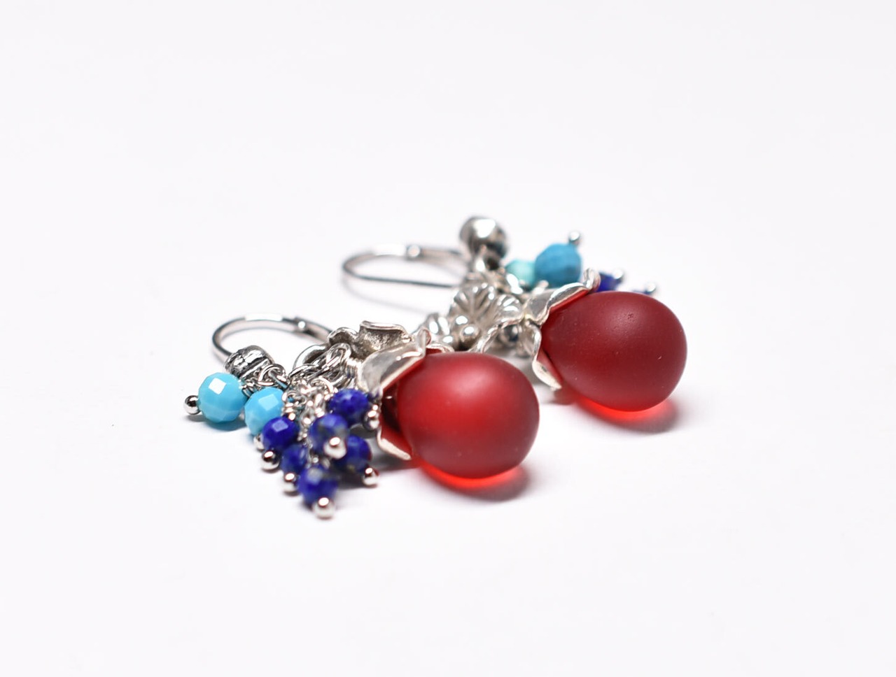 真っ赤なウエディングビーとたわわならピアス&ターコイズ、お花カレンシルバーと小さな鈴のピアス