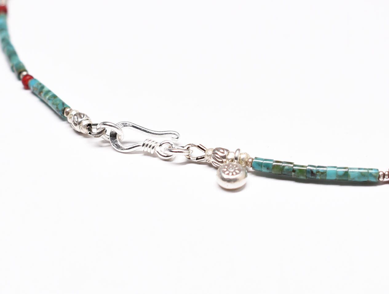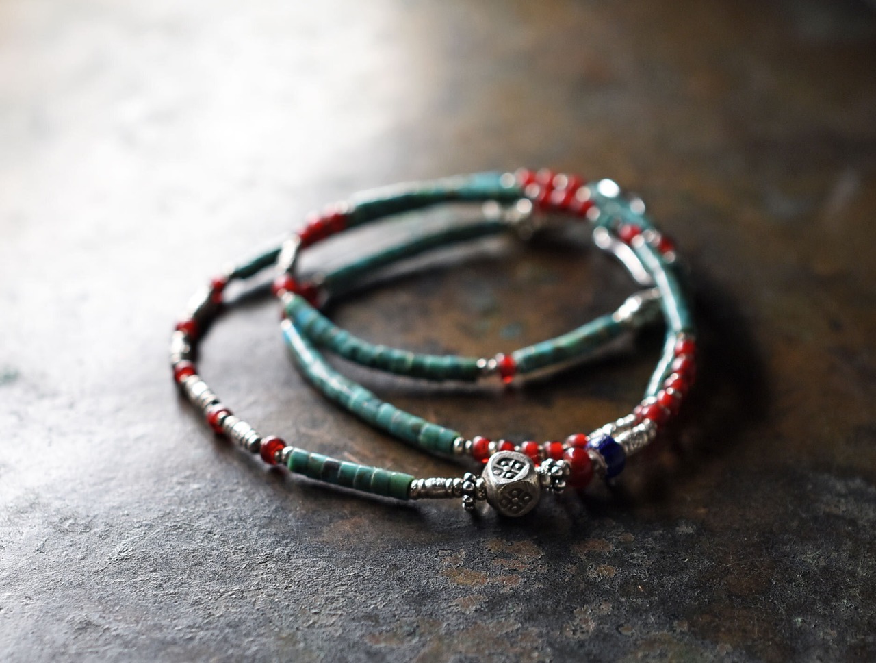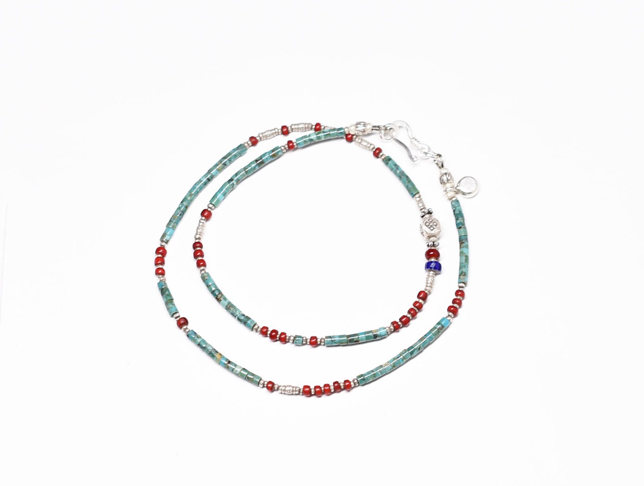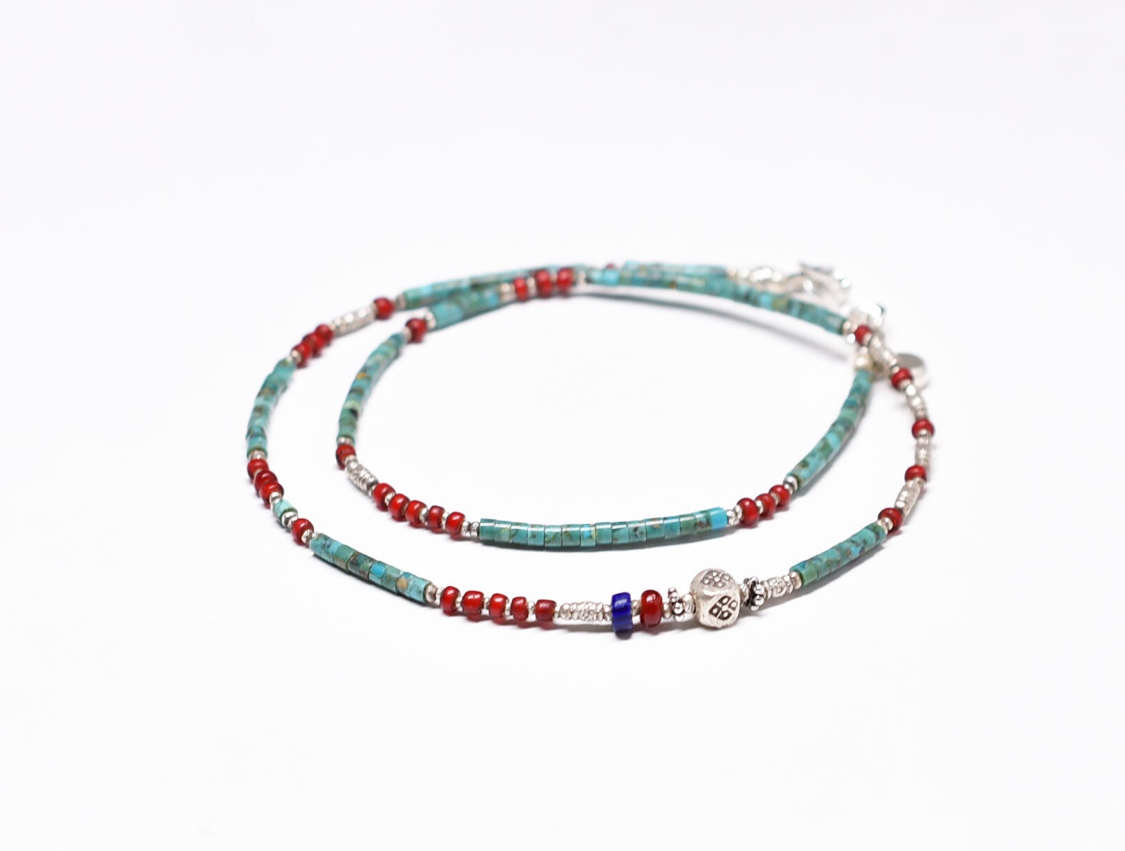 グリーンターコイズと濃赤ホワイトハーツ 、ブルーシェブロン、カレンシルバーを繋いだ華奢なネックレスです。