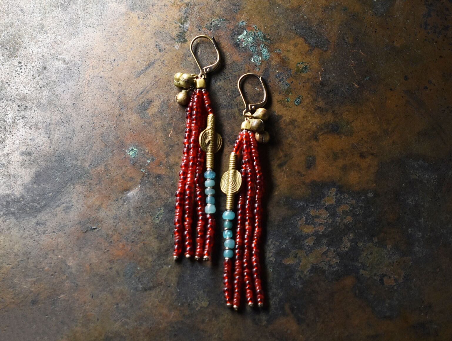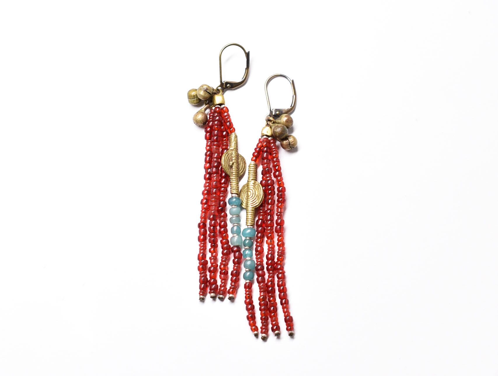 アフリカンブラスと赤色シードビーズ、水浅葱ビーズ、民族鈴を繋いだ4連のピアスです。