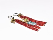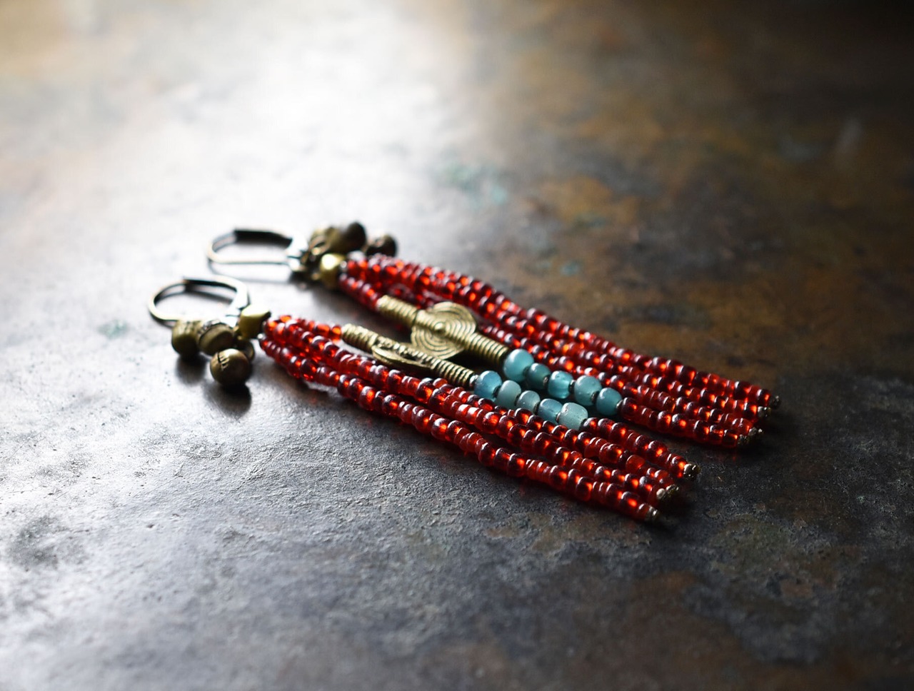 アフリカンブラスと赤色シードビーズ、水浅葱ビーズ、民族鈴の4連ピアス