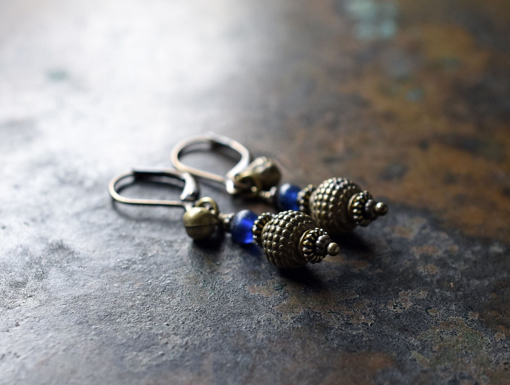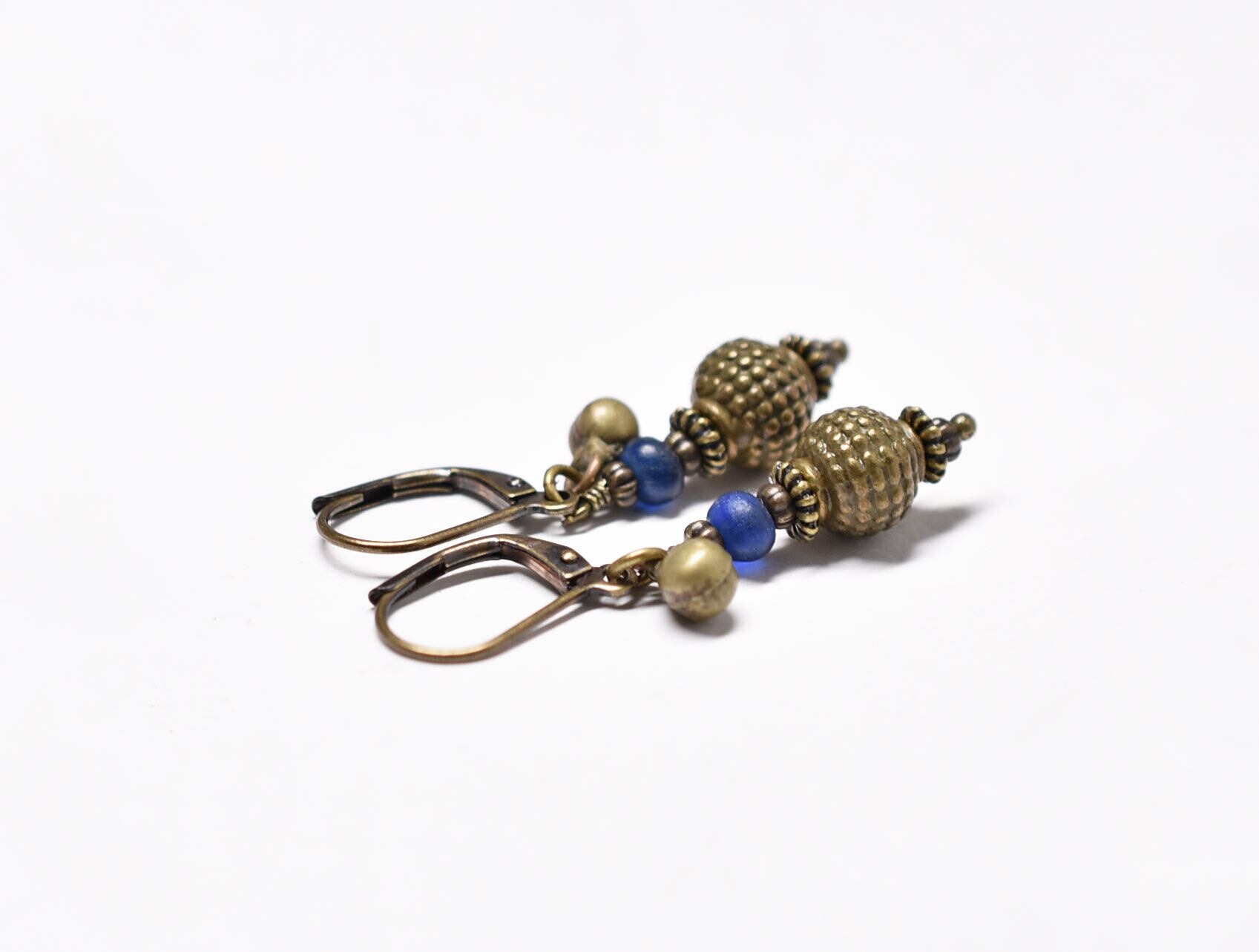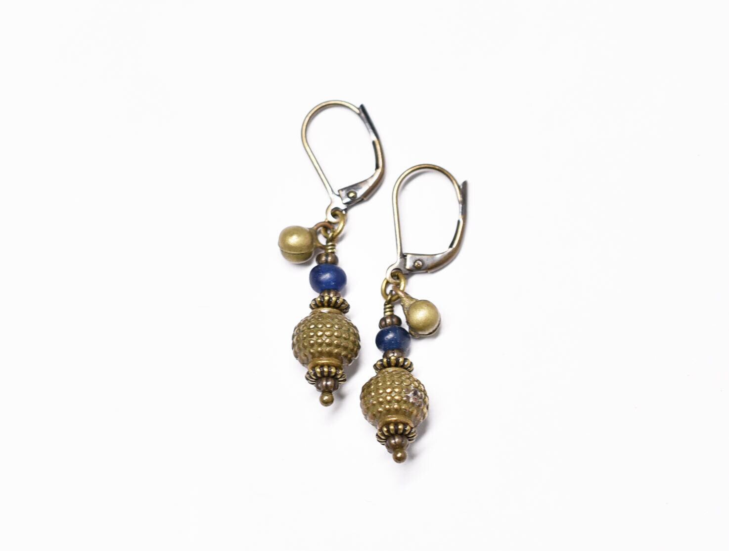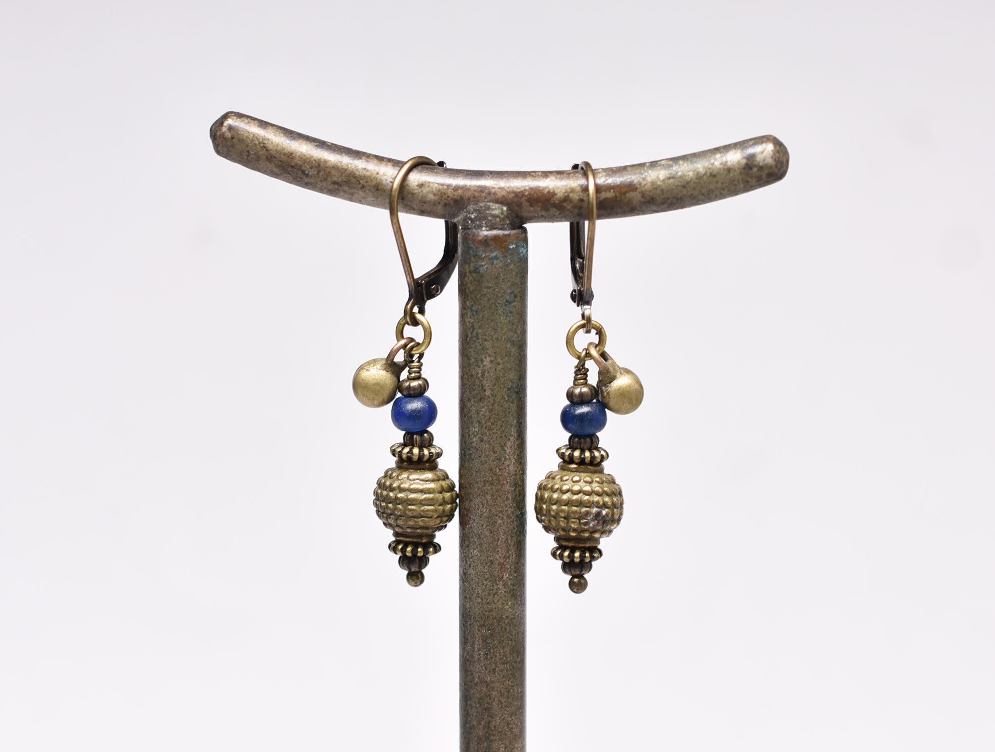 スラウェシ島oldブラスとブルーアンティークビーズ、民族鈴のピアス