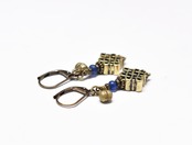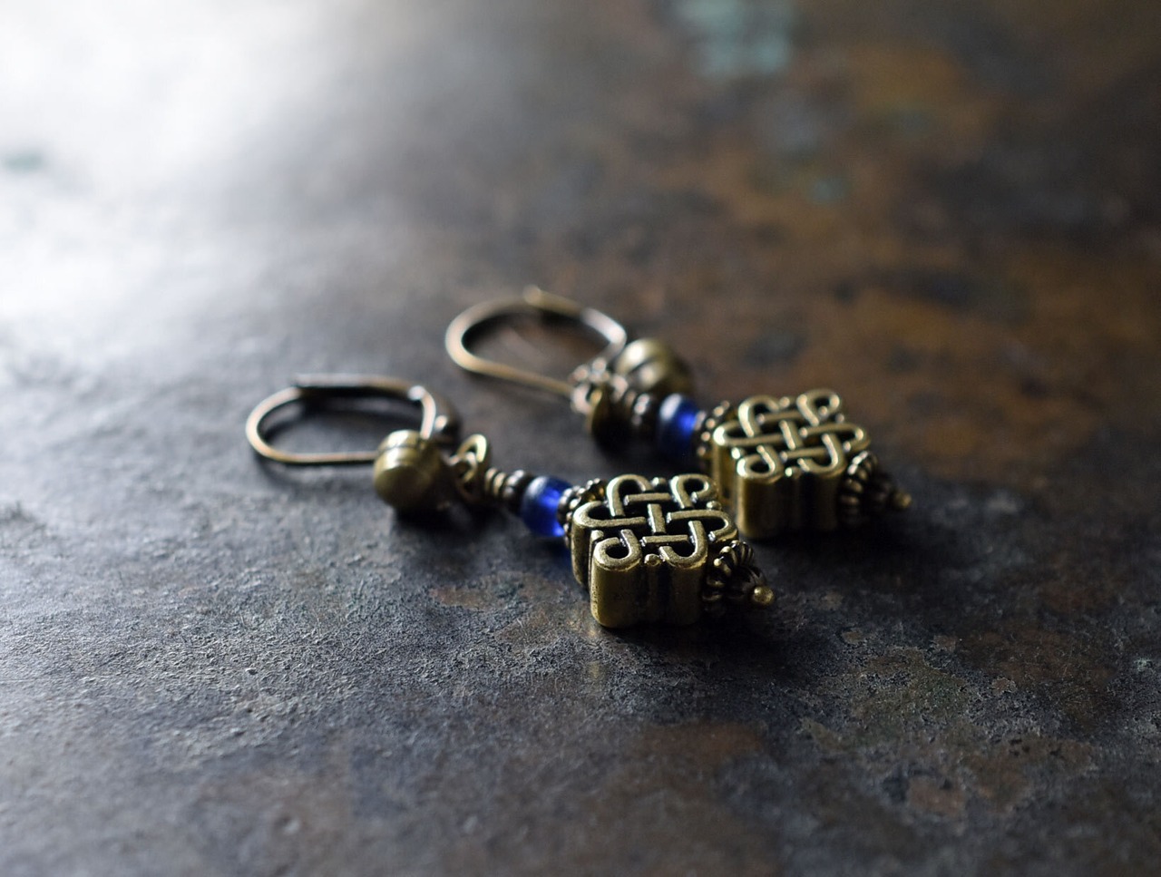 真鍮のエンドレスノットとブルーアンティークビーズ、民族鈴を繋いだピアスです。