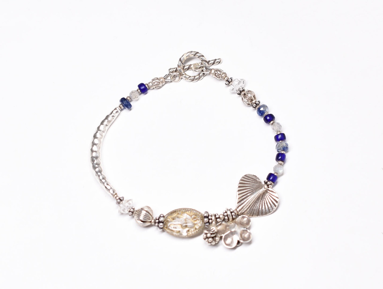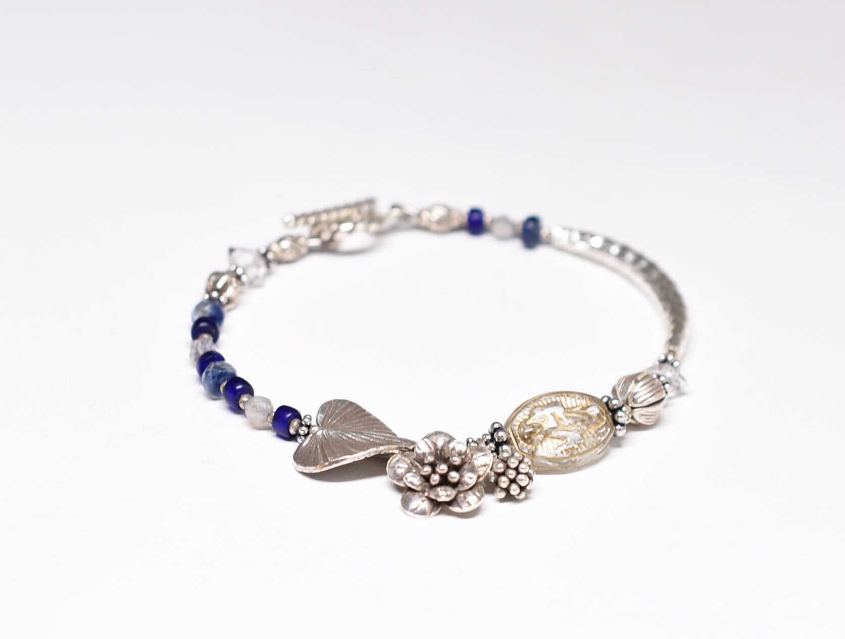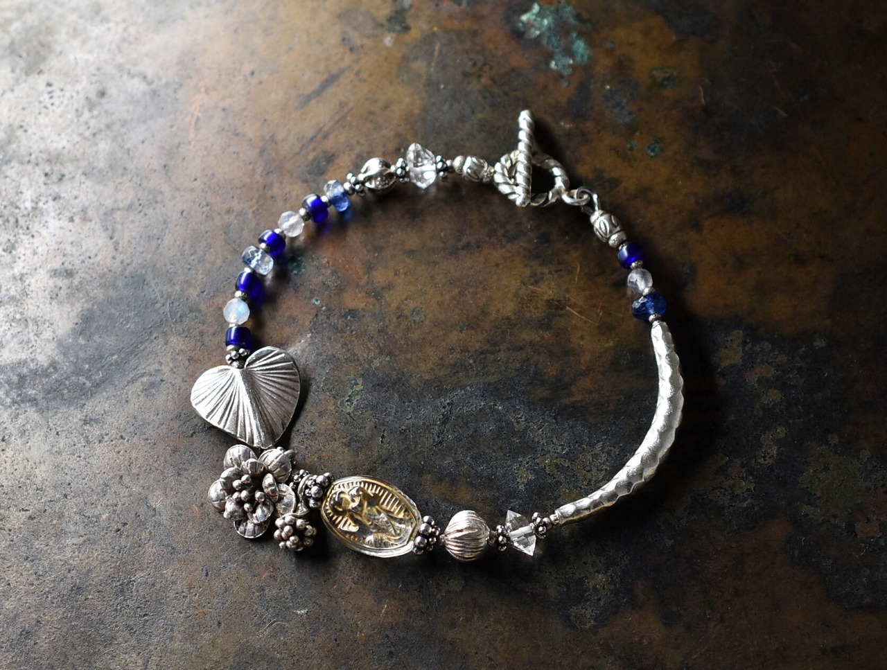 ロザリオパーツとボタニカルなカレンシルバーと湾曲カレンシルバー、瑠璃色アンティークビーズ、ラブラドライトとカイヤナイト、ハーキマーダイヤモンドを繋いだブレスです。