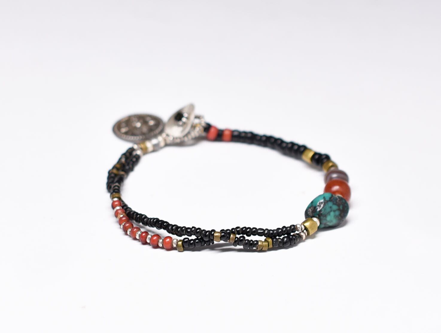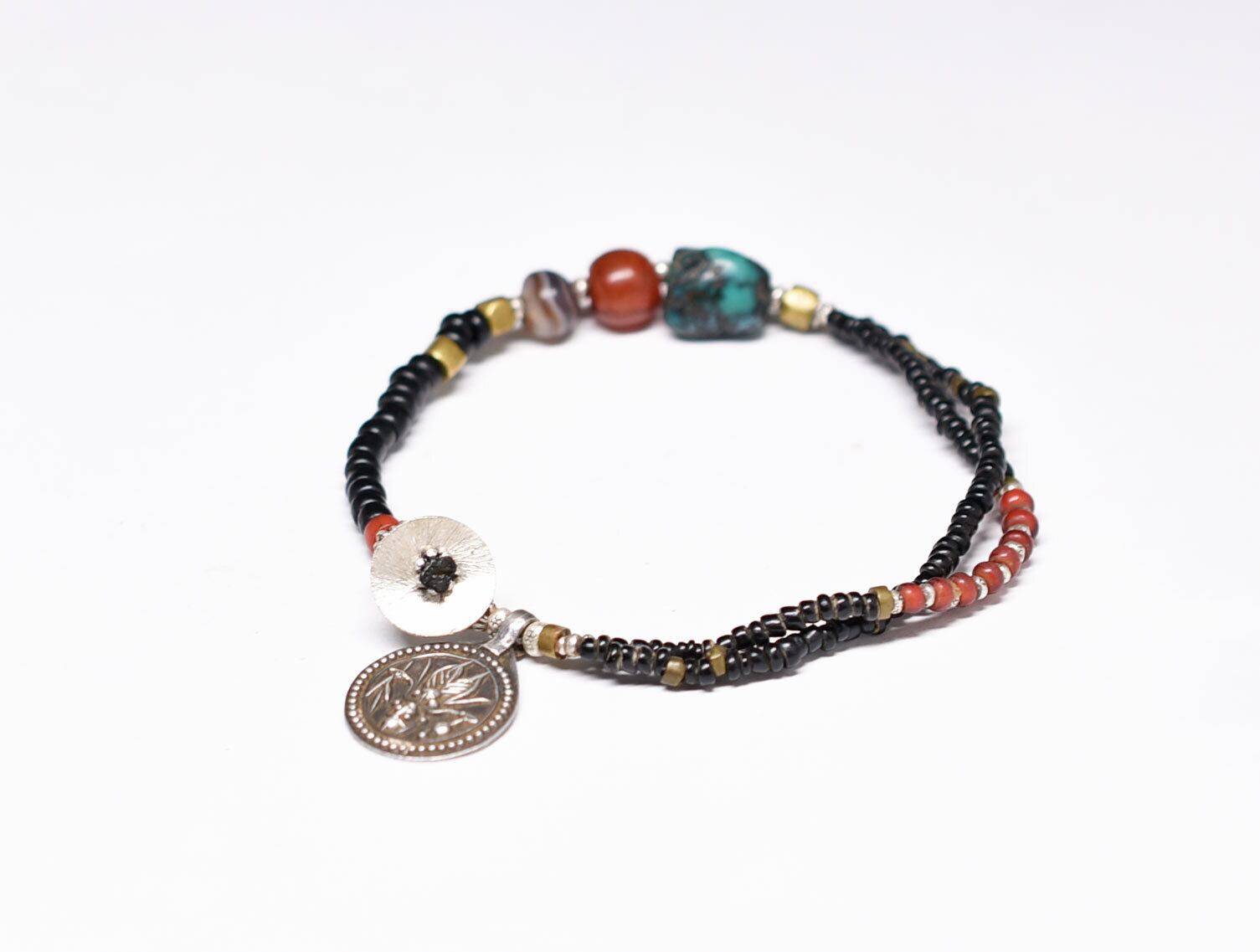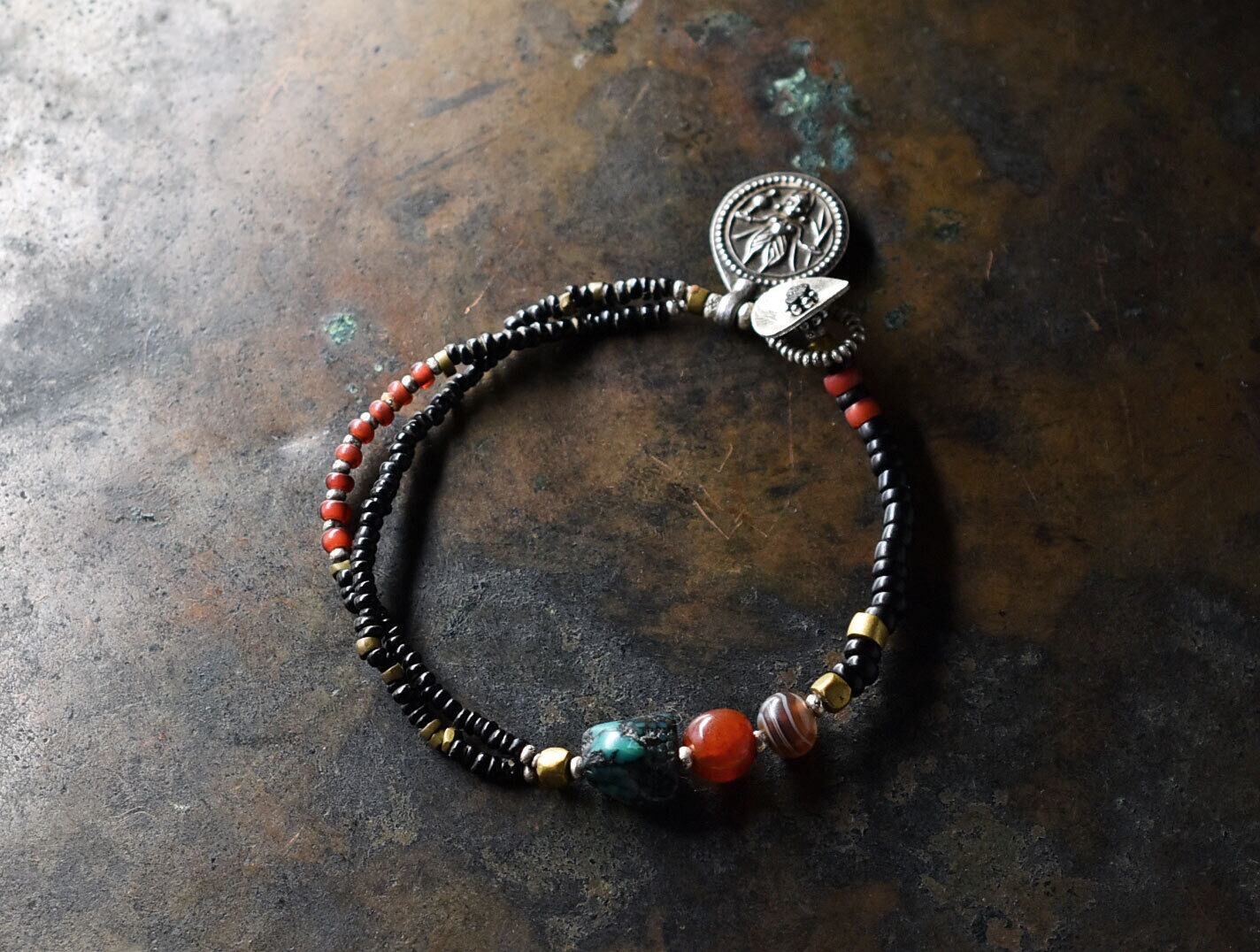oldチベタンターコイズとミゾーラムカーネリアン、古代瑪瑙、金赤ホワイトハーツ、oldオリッサブラス、漆黒ビーズ、インドシルバーチャームなどを繋いだブレスです。