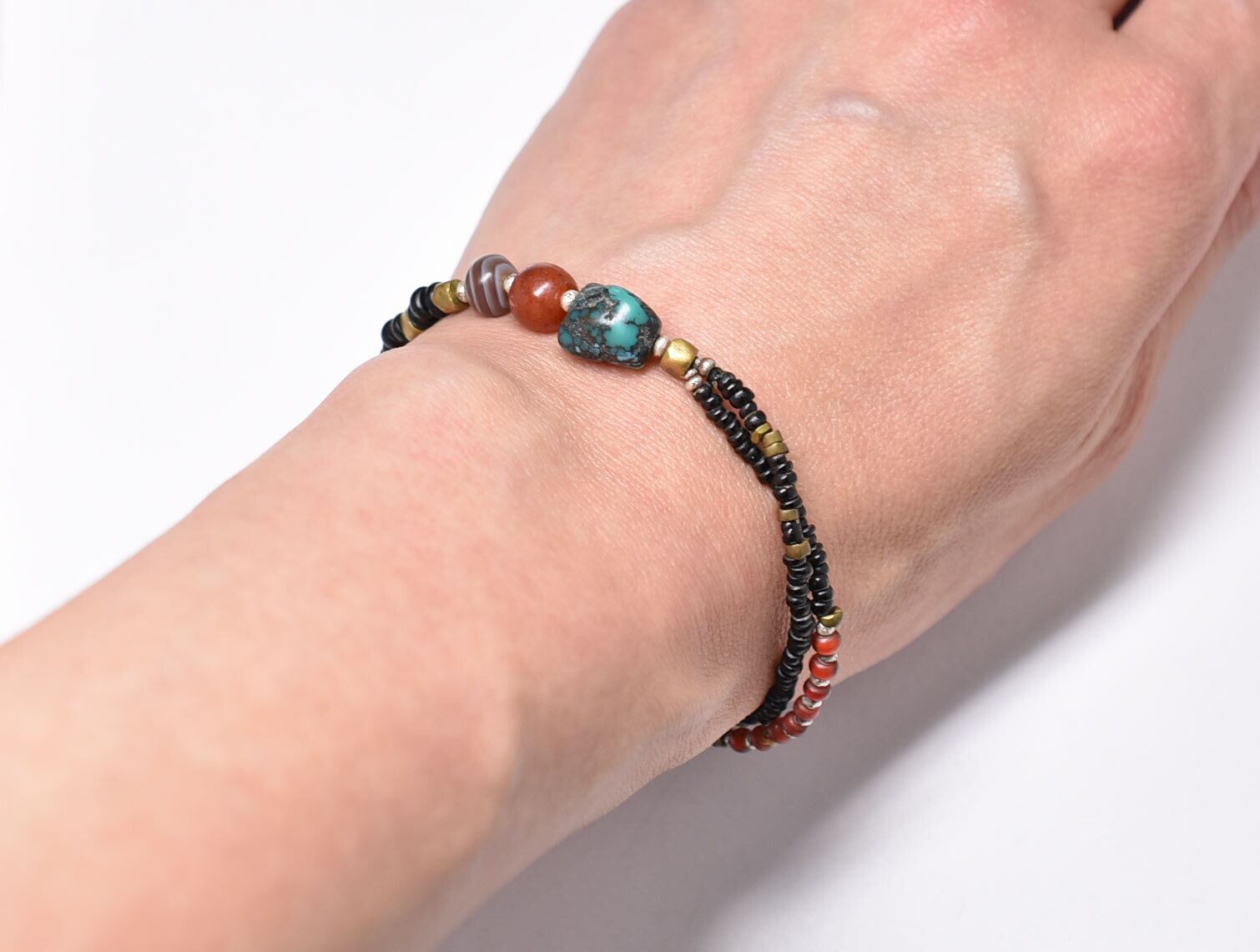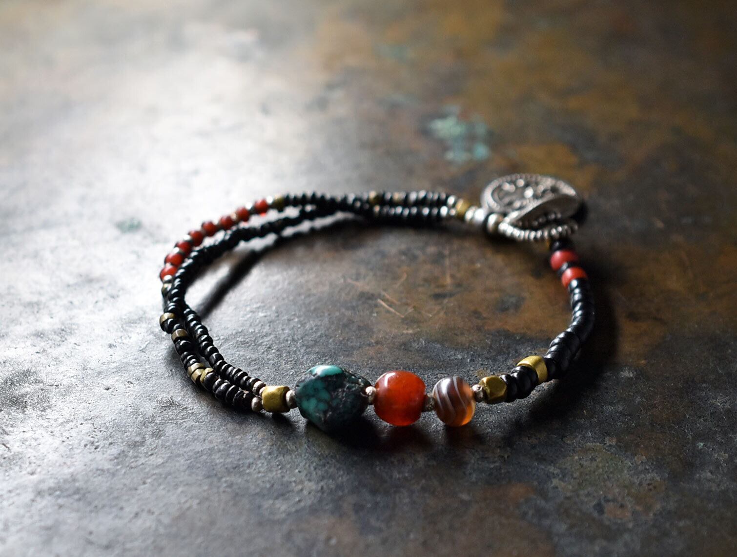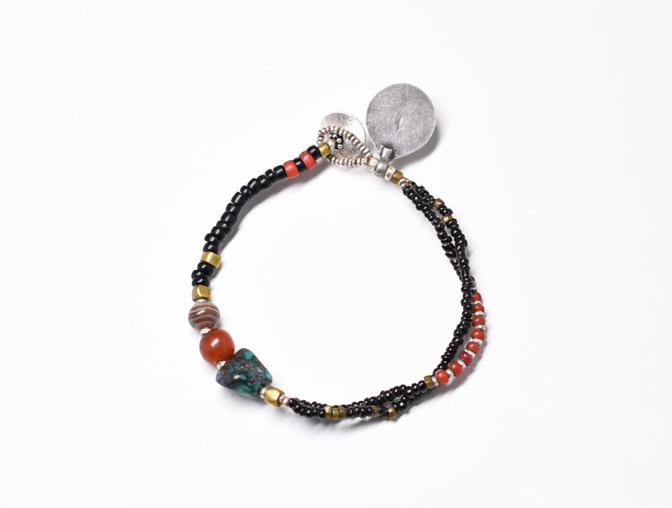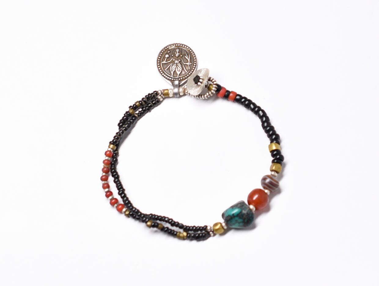 oldチベタンターコイズとミゾーラムカーネリアン、古代瑪瑙、金赤ホワイトハーツ、oldオリッサブラス、漆黒ビーズ、インドシルバーチャームなどを繋いだブレスです。