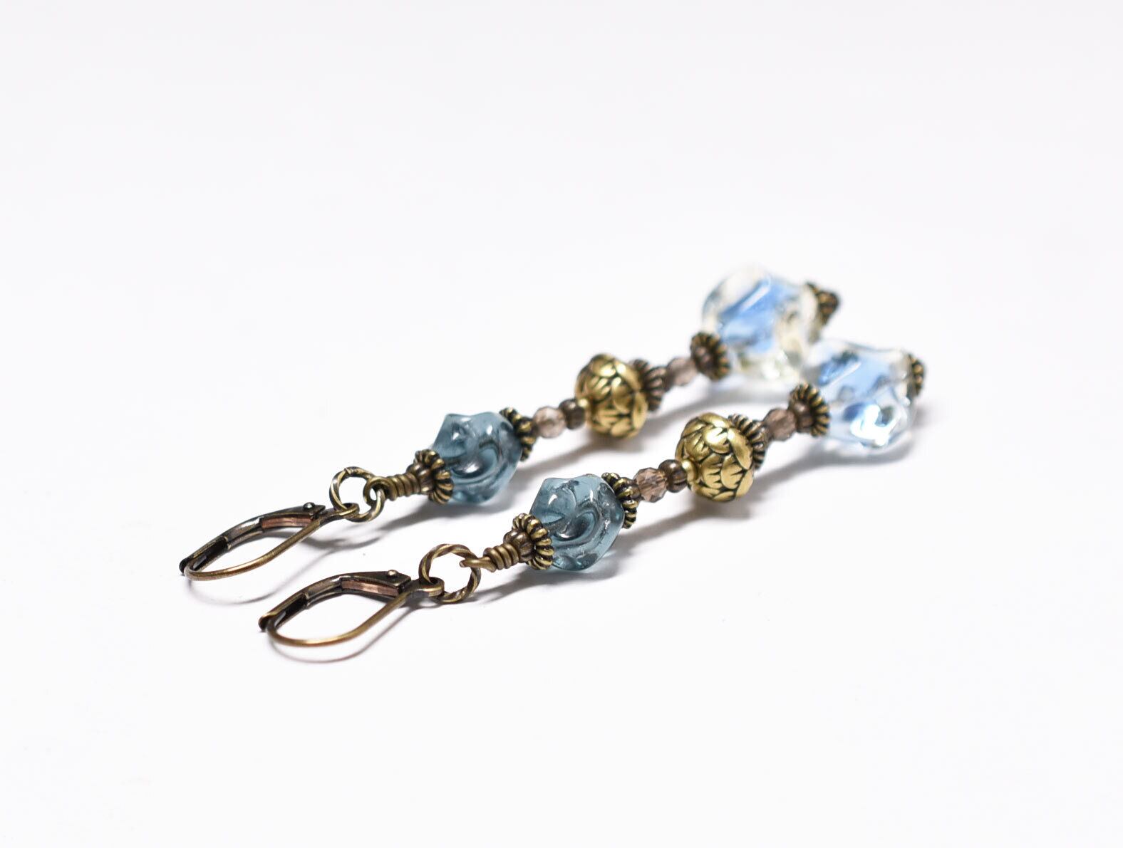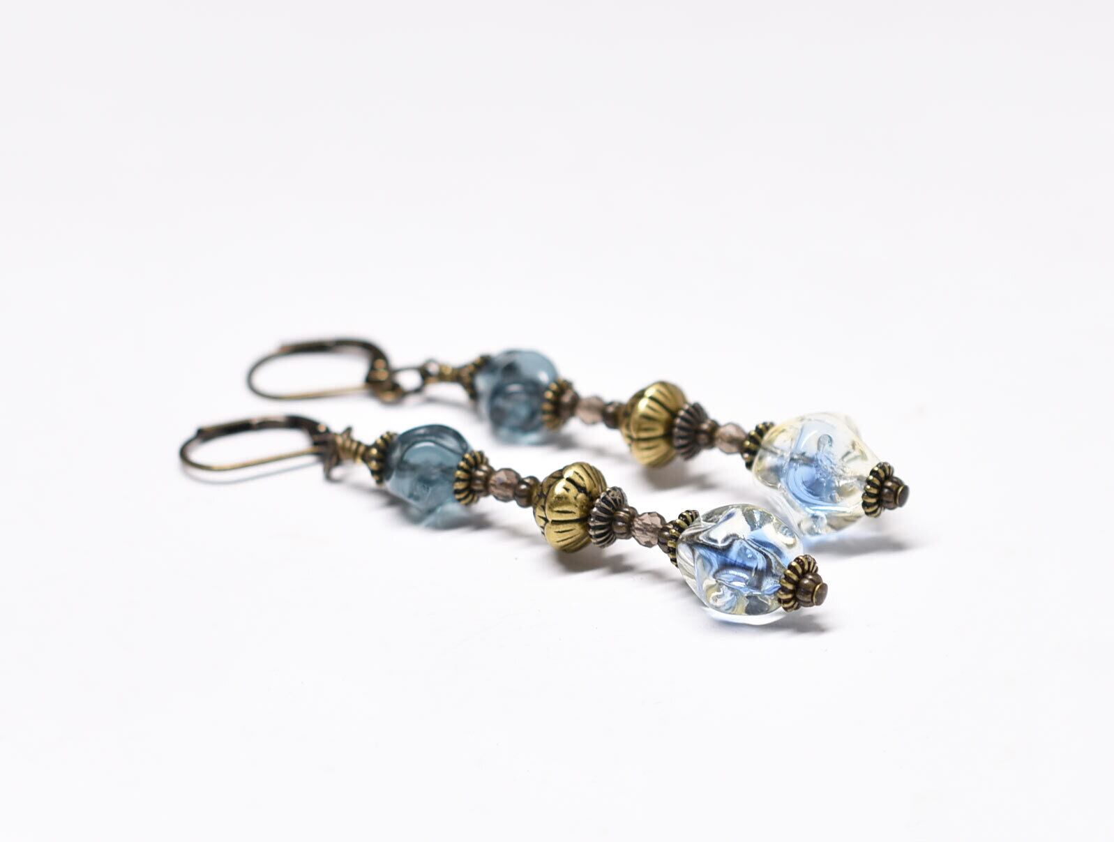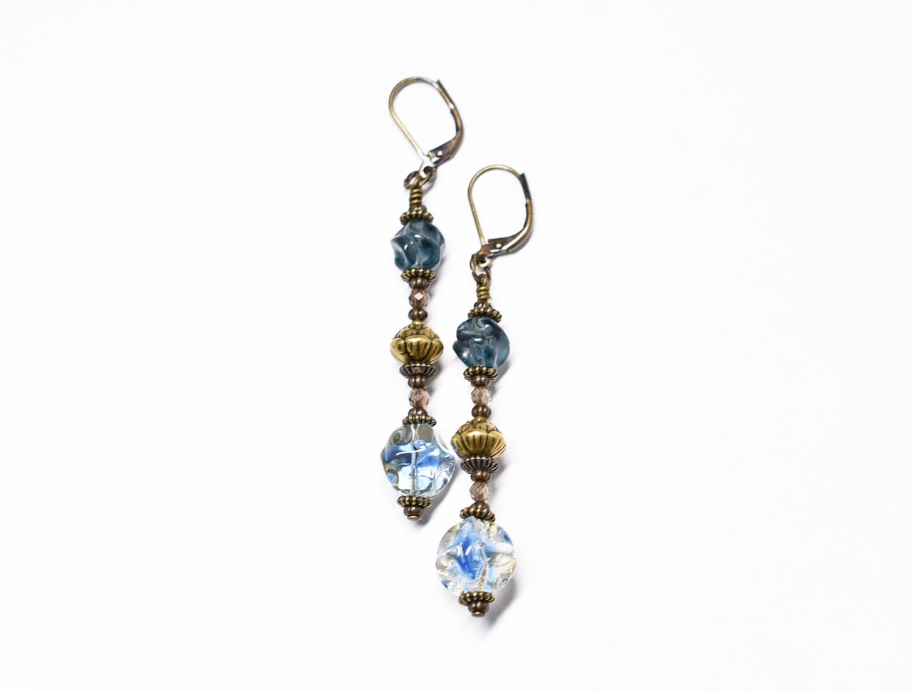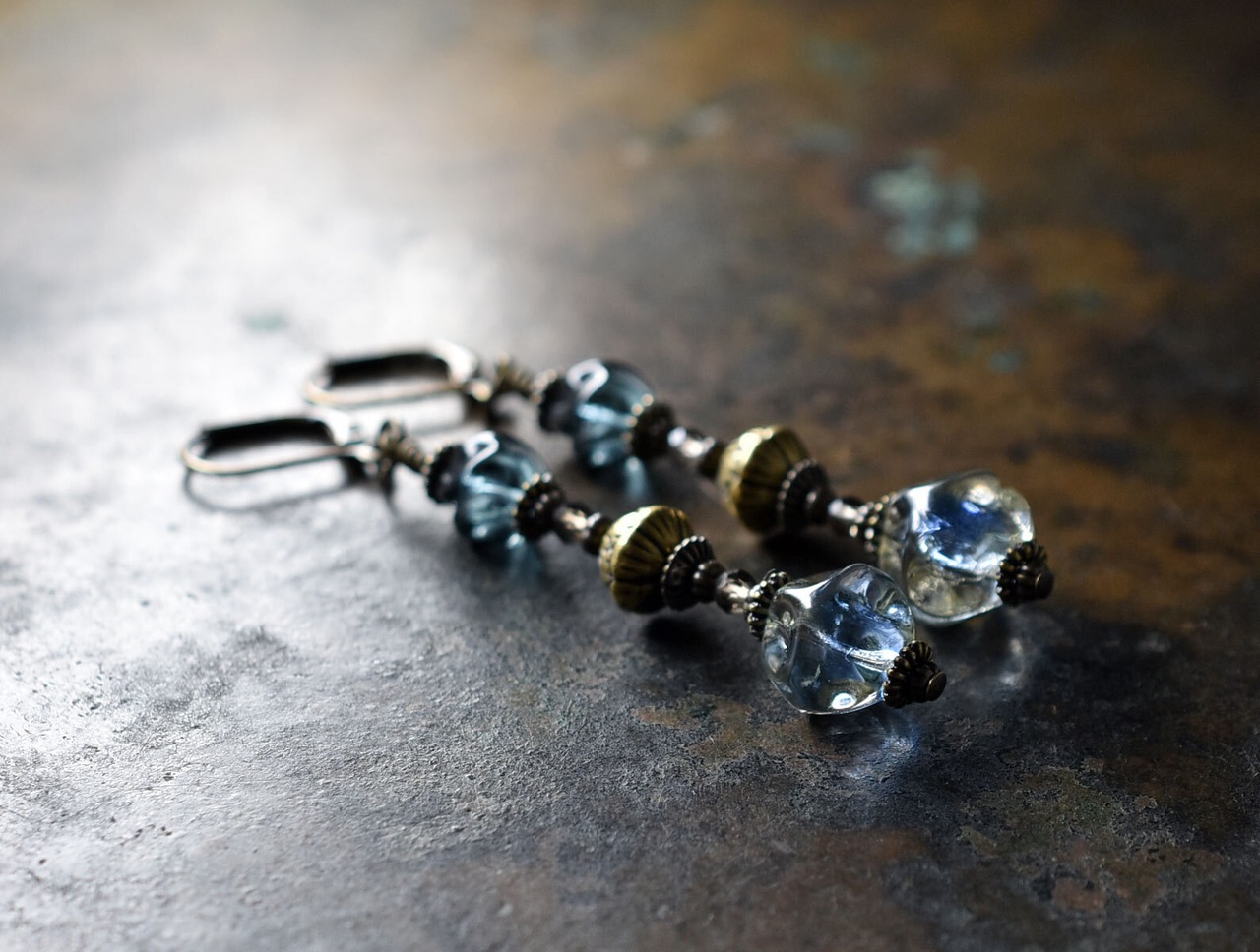 グレーとブルー&ブルーグレードイツヴィンテージビーズと蓮華ブラス、スモーキークォーツのピアス