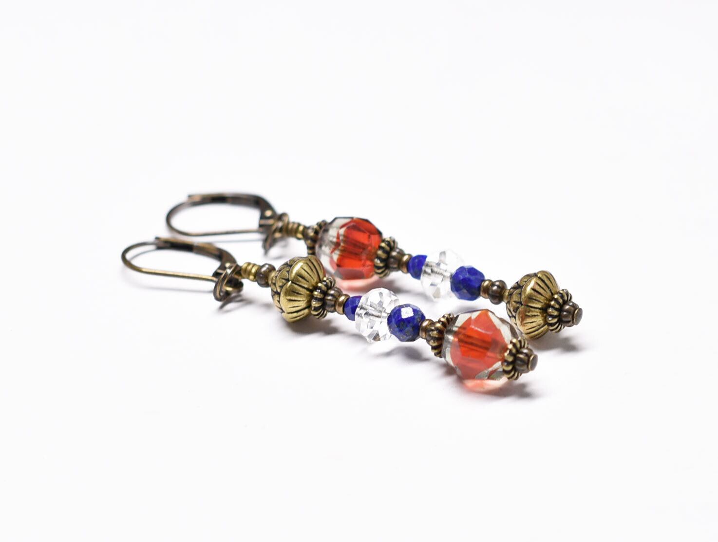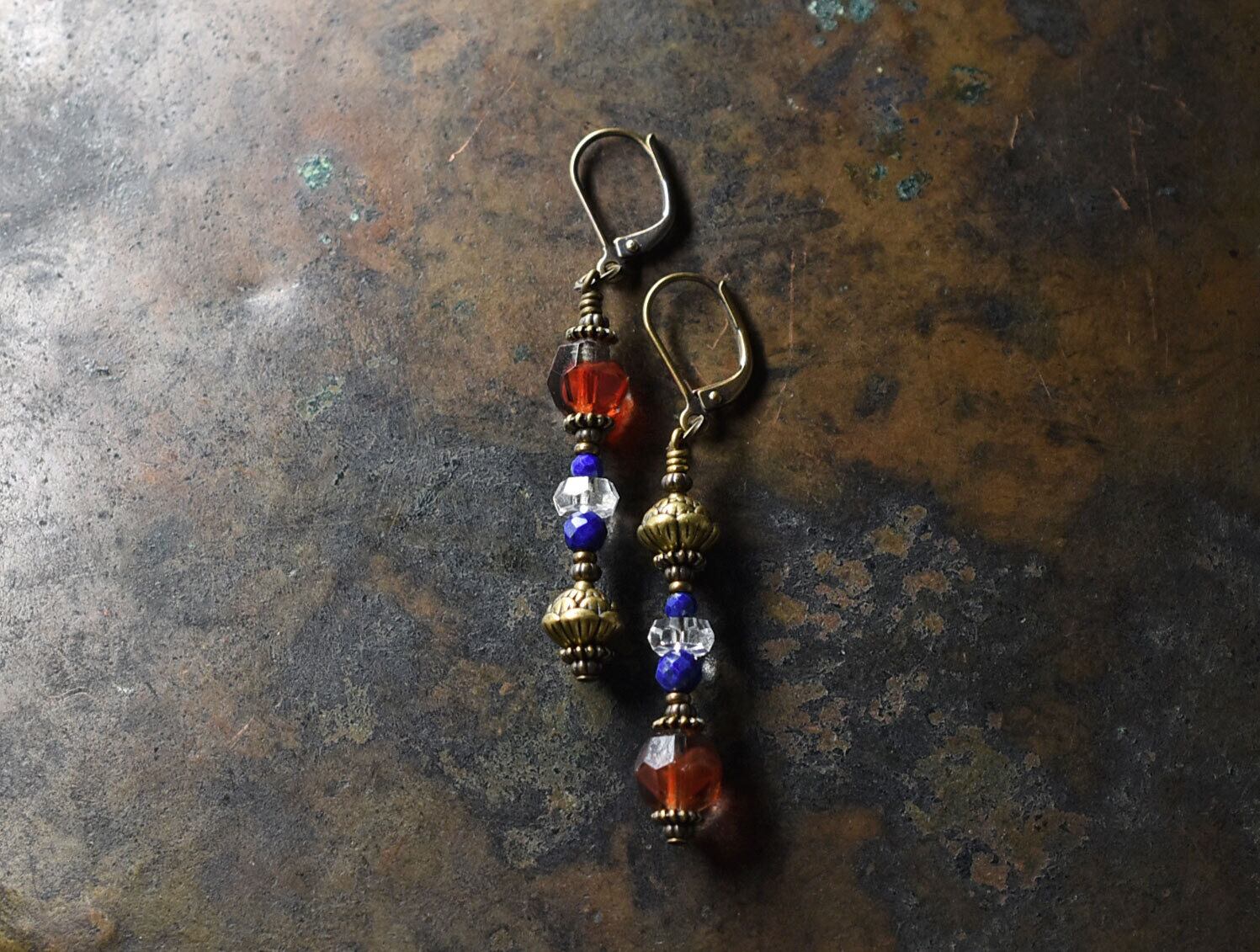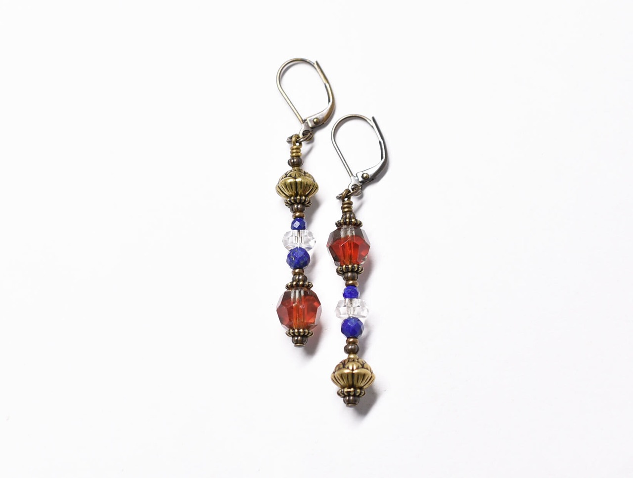 ヴィンテージビーズとラピス、クリアビーズ、蓮華ブラスを繋いだアンシメトリーなピアスでう。